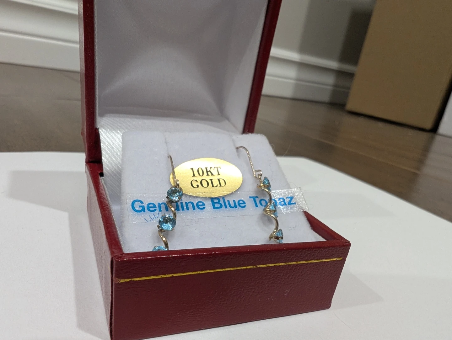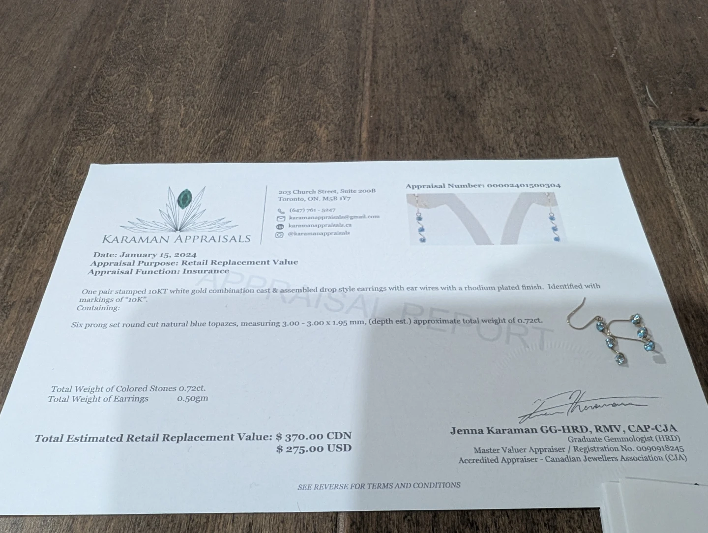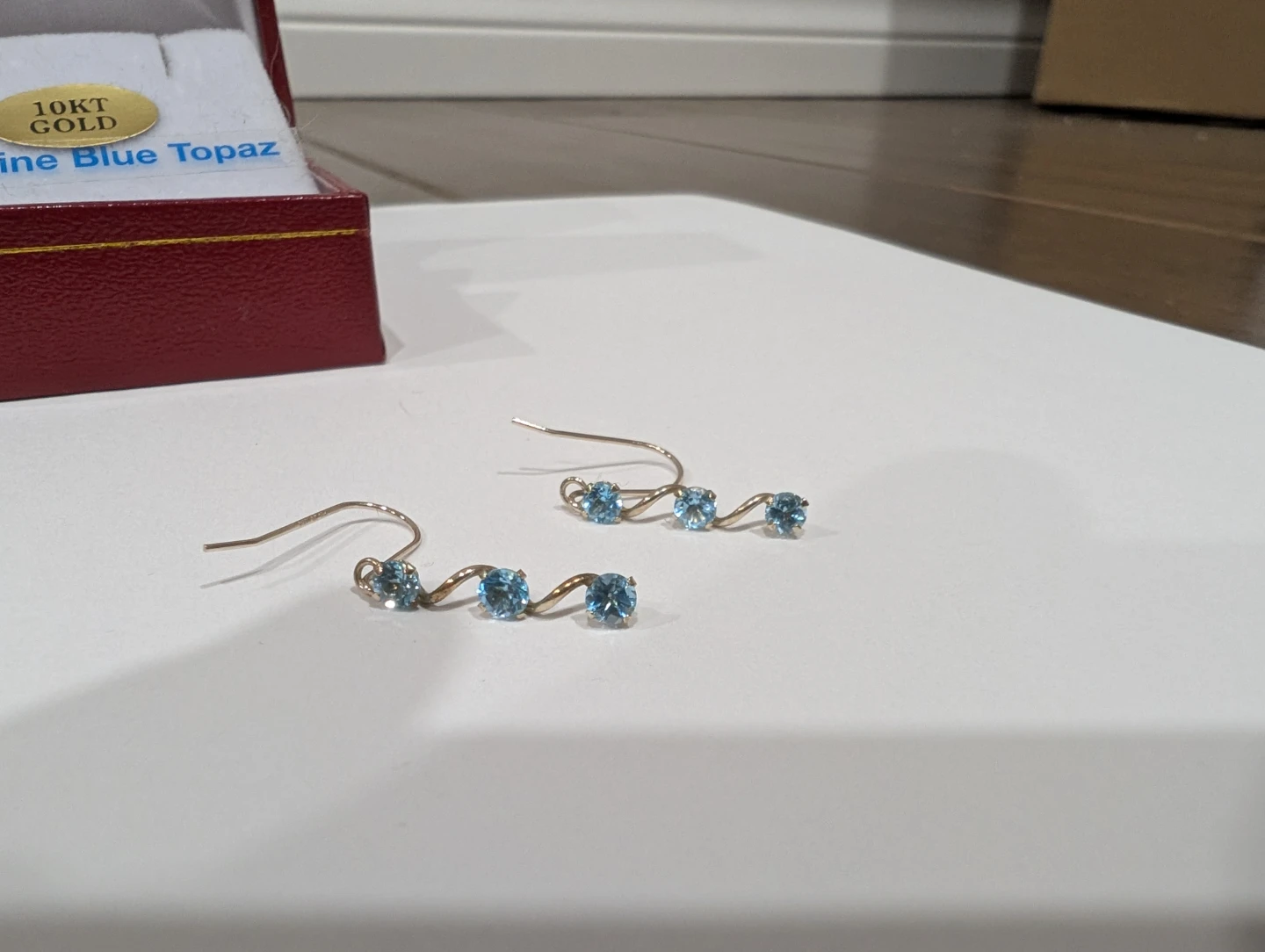 Brand new 10kt white gold drop style Topaz gemstone earrings for sale. Drop style, dangling hoop earrings, 6 prong set round cut natural blue topazes, 0.72ct carat, November and December birthstone. $150 FIRM. Comes with appraisal. Jewelry, Gold, Diamond, Karat, Earrings, Carat, Appraisal, Gift, Present, Birthday, Anniversary, Valentine, Mothers Day, Christmas, Birthstone, Stone, Natural, Ring, Moissanite, Made in Canada, Studs, Necklace, Pendant, Canada
