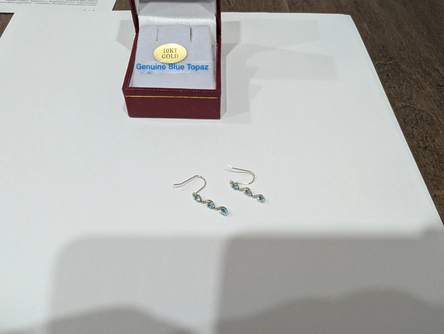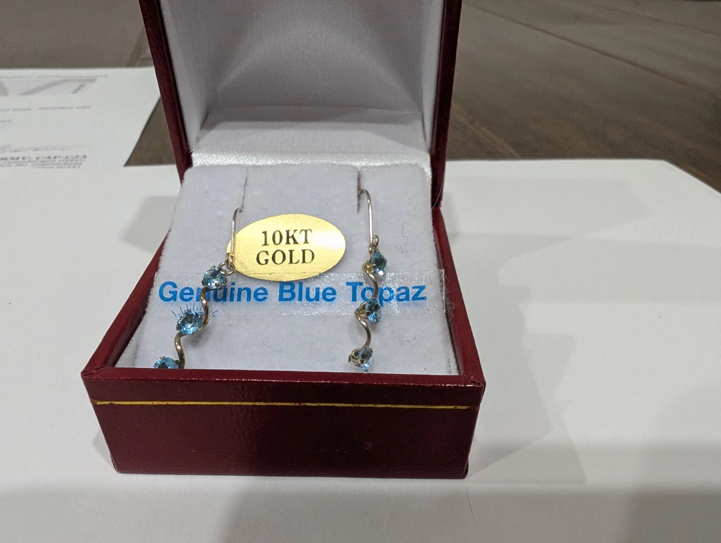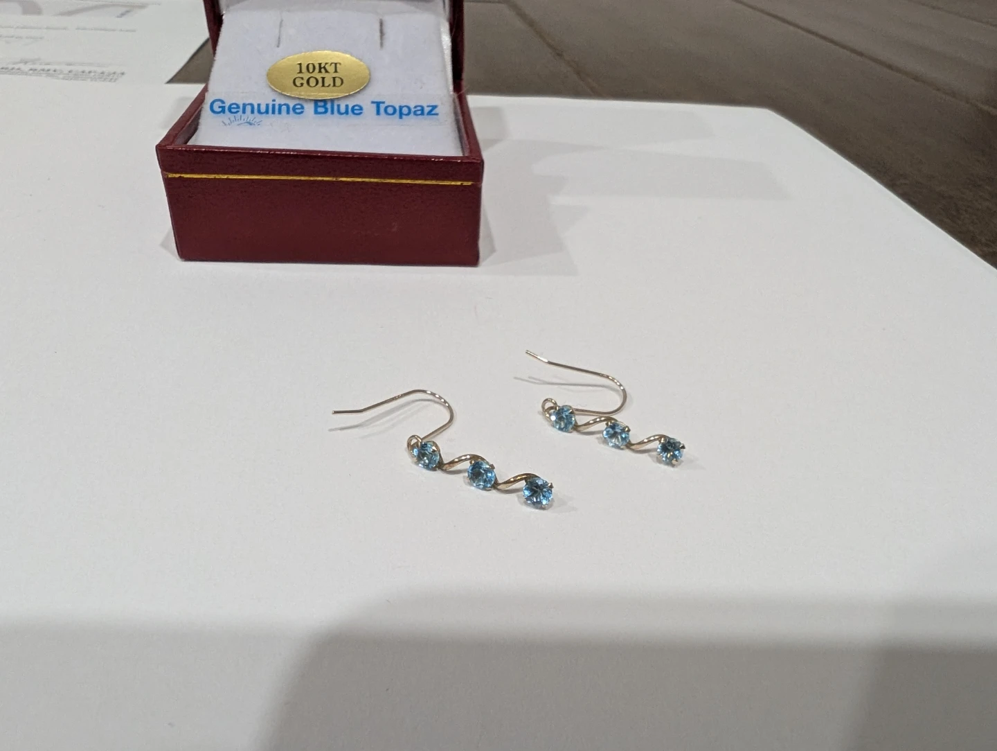 Brand new 10kt white gold drop style Topaz gemstone earrings for sale. Drop style, dangling hoop earrings, 6 prong set round cut natural blue topazes, 0.72ct carat, November and December birthstone. $150 FIRM. Comes with appraisal. Jewelry, Gold, Diamond, Karat, Earrings, Carat, Appraisal, Gift, Present, Birthday, Anniversary, Valentine, Mothers Day, Christmas, Birthstone, Stone, Natural, Ring, Moissanite, Made in Canada, Studs, Necklace, Pendant, Canada