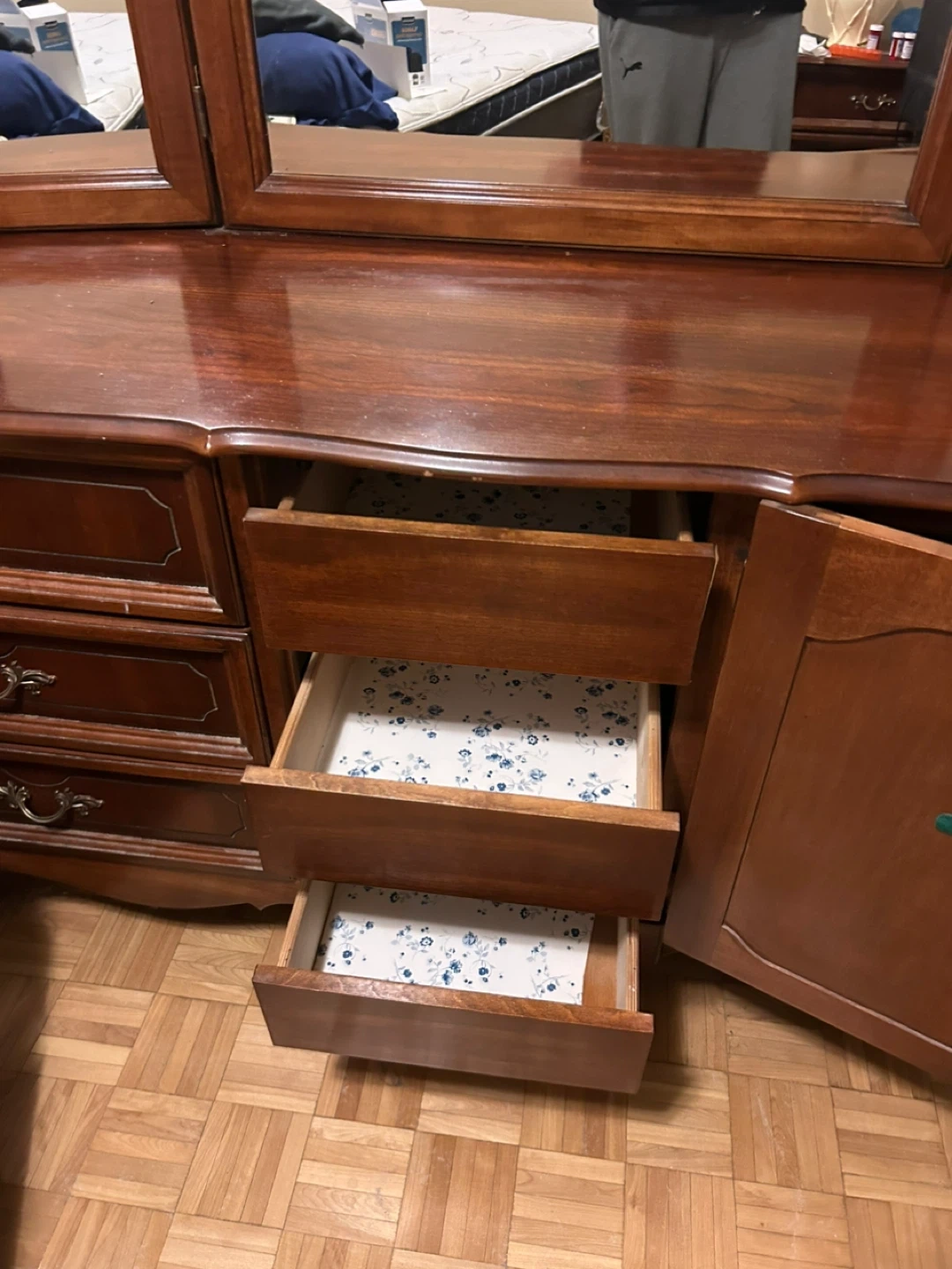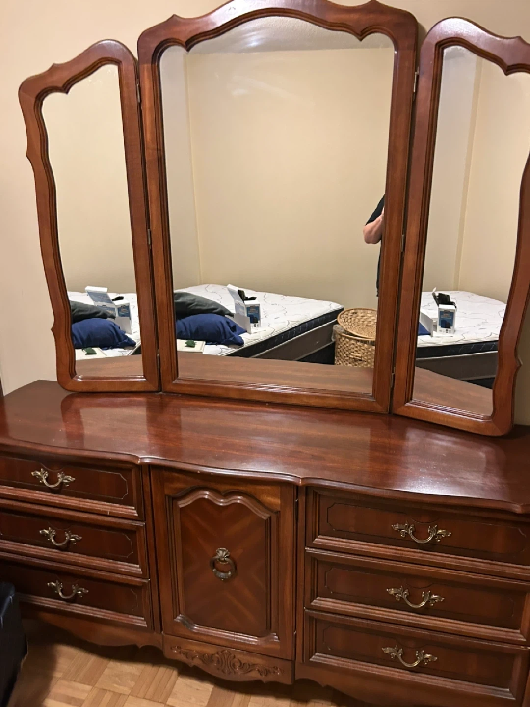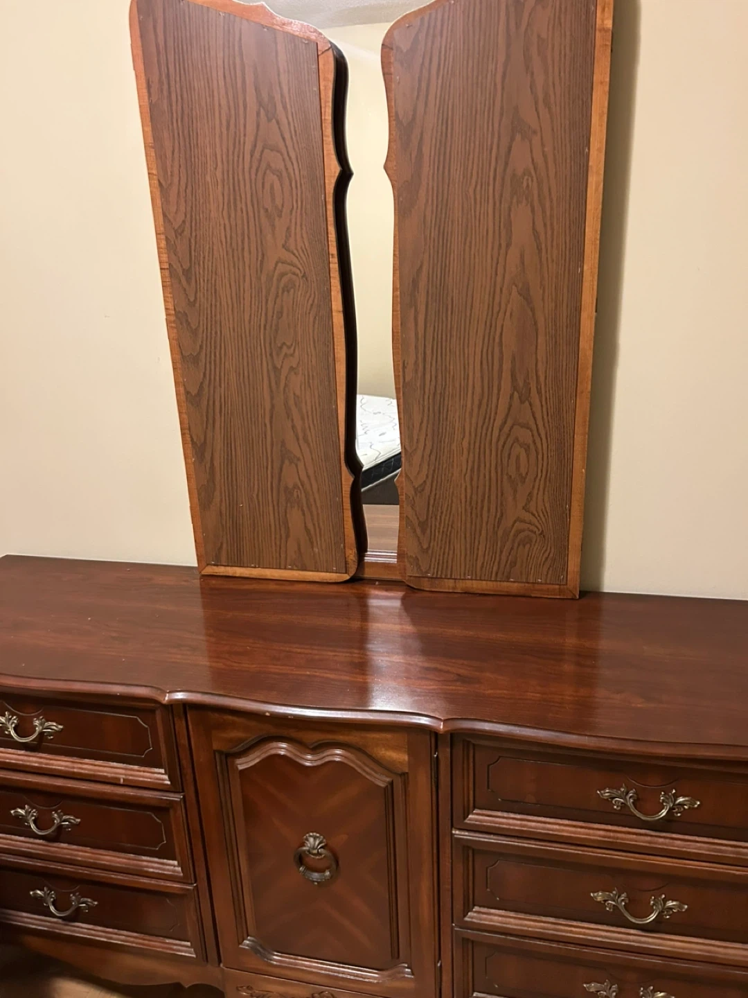 Selling a lovely mahogany vintage wooden dresser with an attached mirror. It has a beautiful, classic design and is in good condition. The dresser features multiple drawers, providing ample storage space. It would be a great addition to any bedroom!