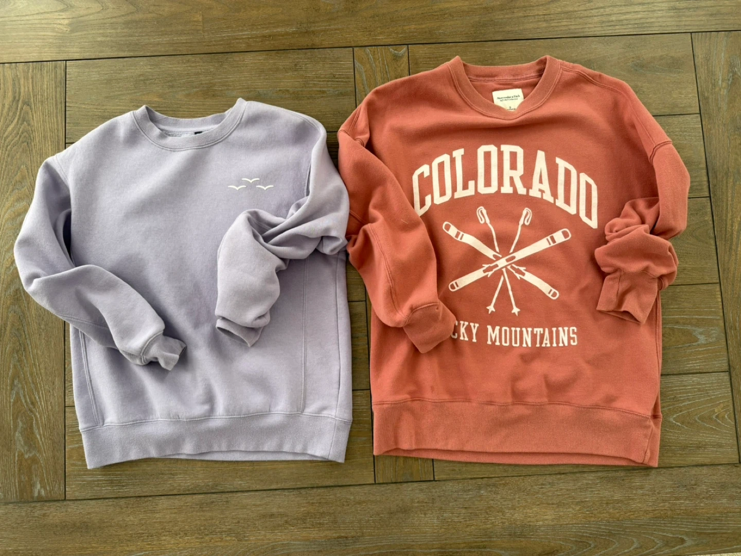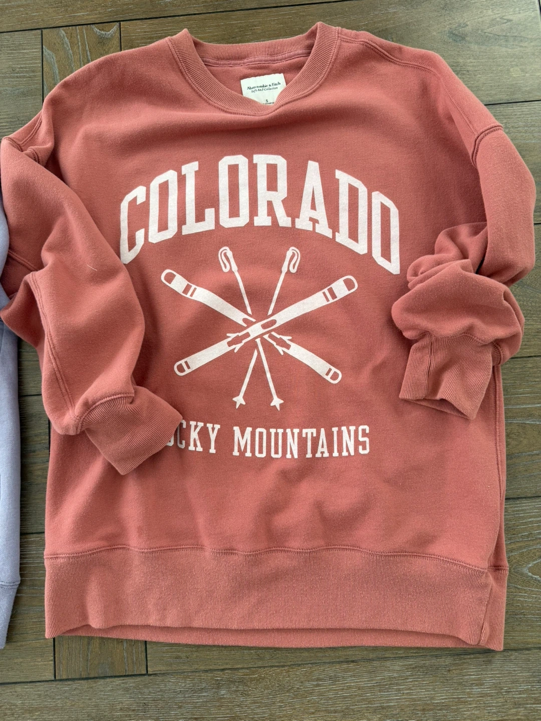 Abercrombie & Fitch: The reddish-orange colour with "COLORADO ROCKY MOUNTAINS" printed on the front. Size: Small