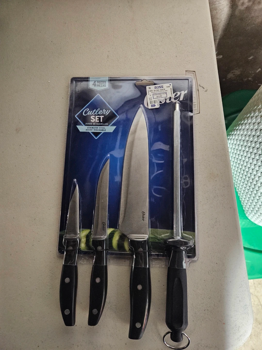 Selling a brand new Oster 4-piece cutlery set! This set includes stainless steel knives and a sharpener. Originally priced at $10.00.