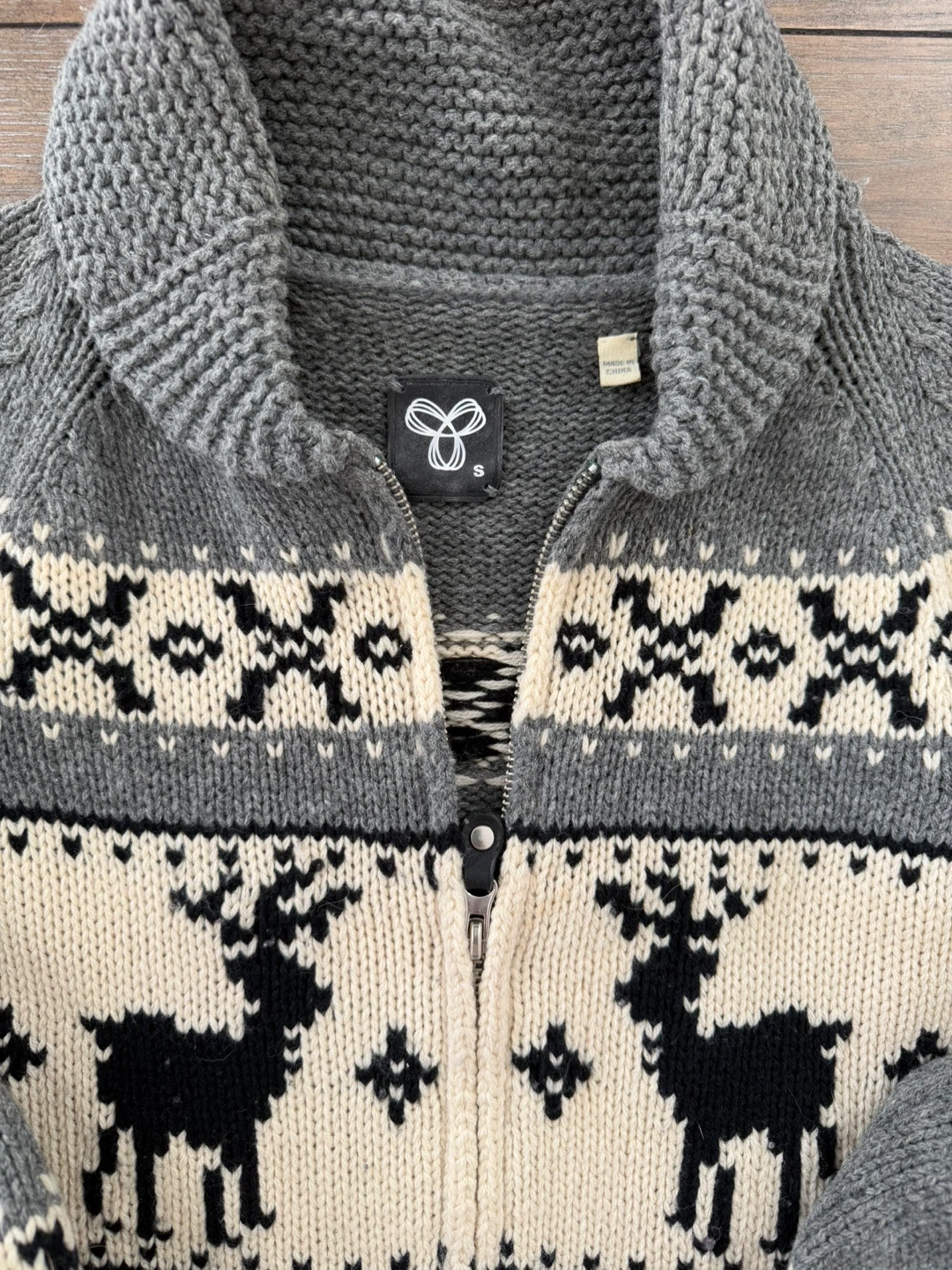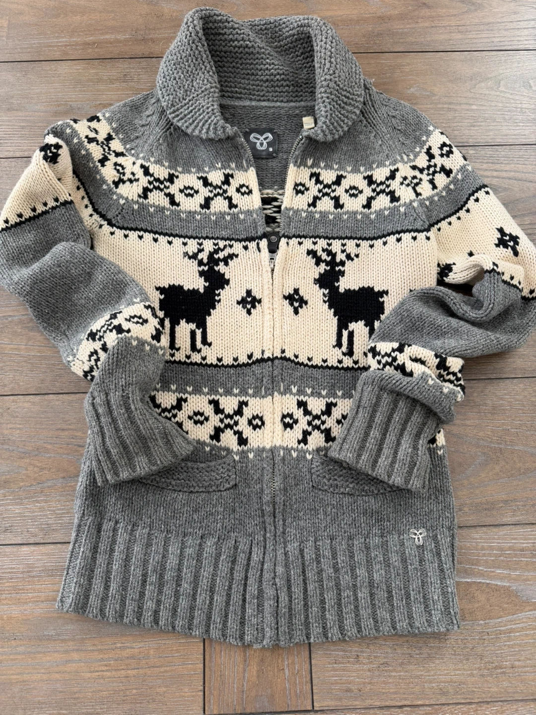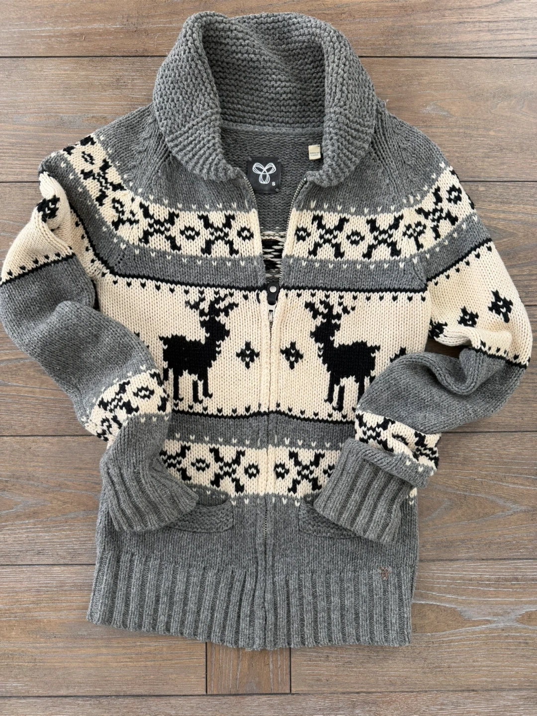 Cozy TNA Wilfred Free cardigan in size small! It features a unique reindeer and snowflake pattern in grey, white, and black.