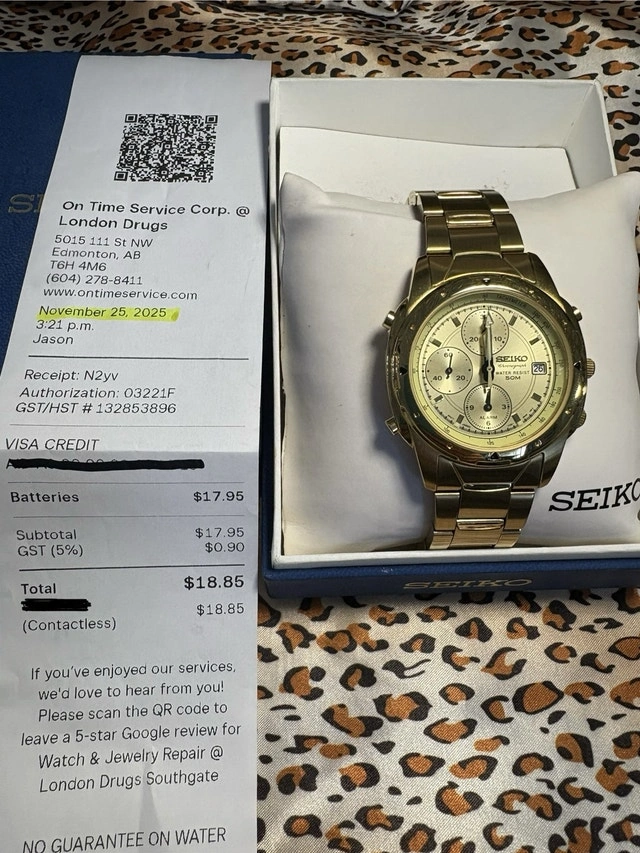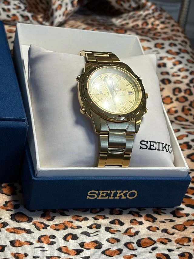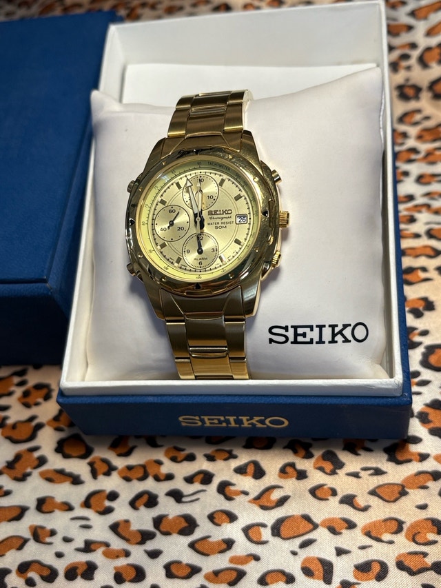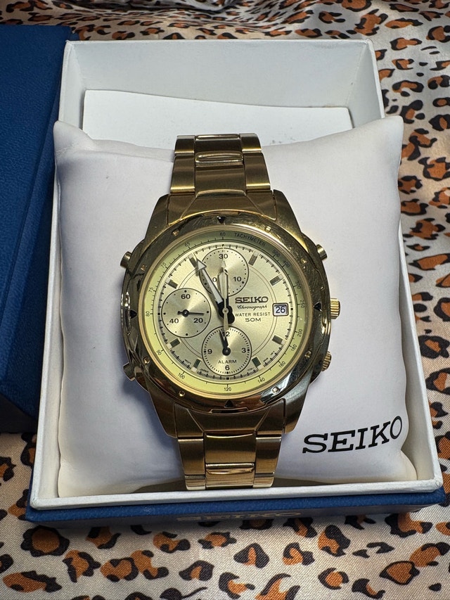 It’s a Seiko 7T32-6M59 gold-tone chronograph with alarm (50m WR). Serial number 281520, original Seiko bracelet, and it comes with the original box + cushion. Can include more photos; the face is pristine and the *original* band has very minimal wear.