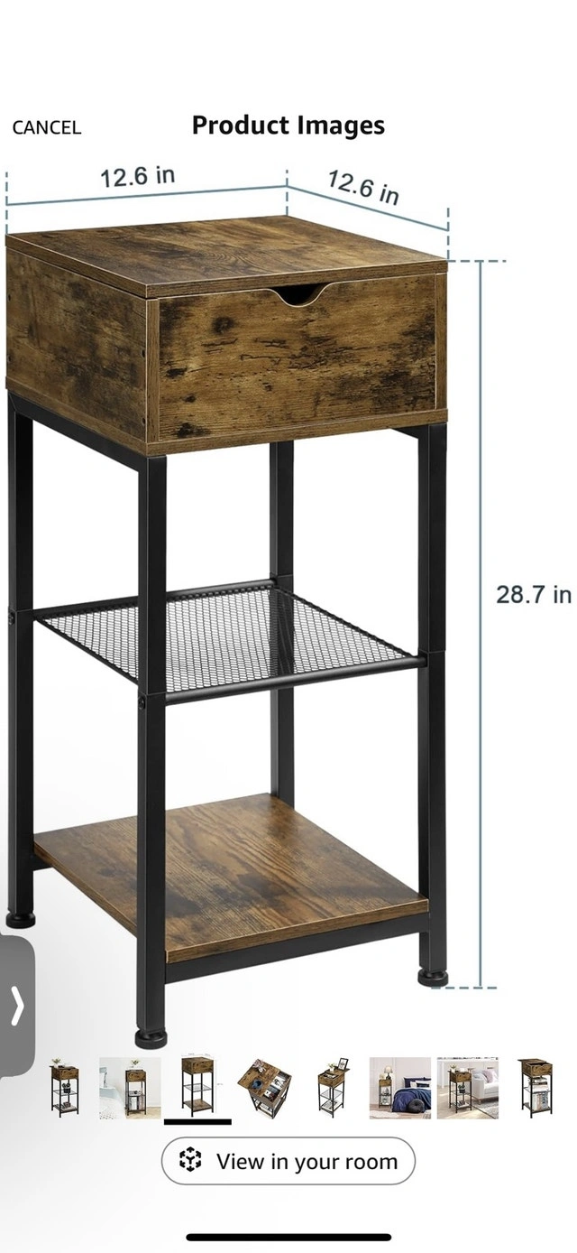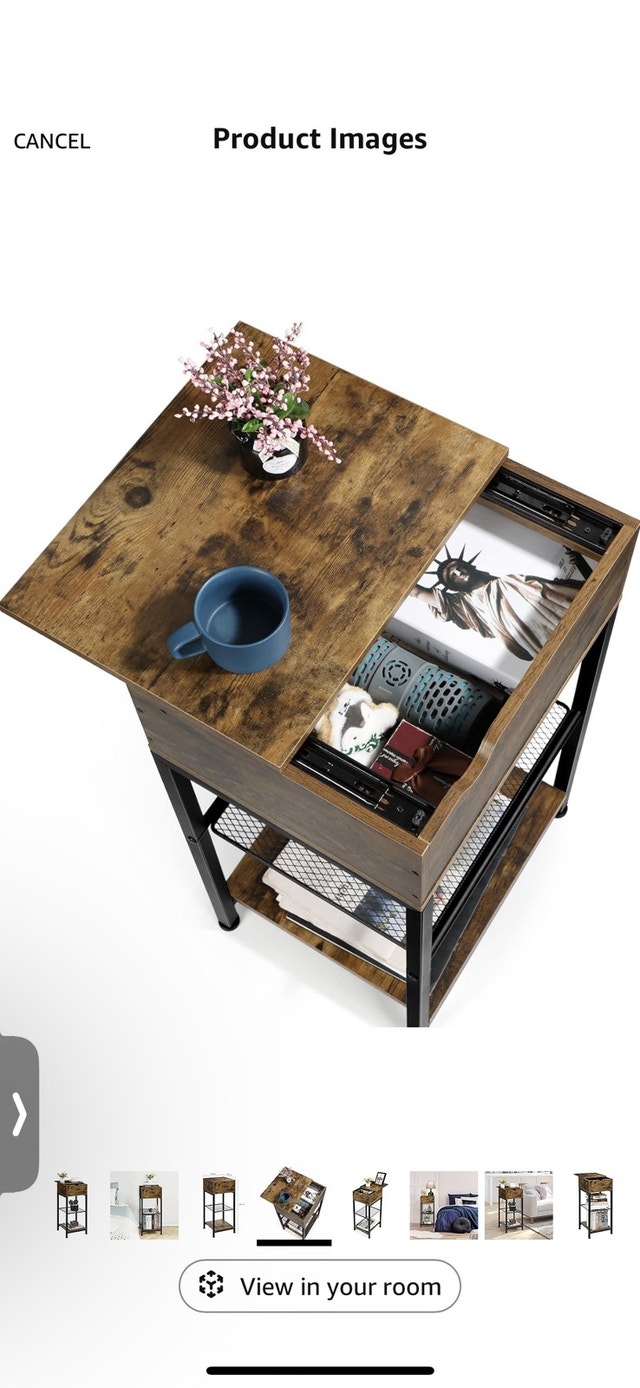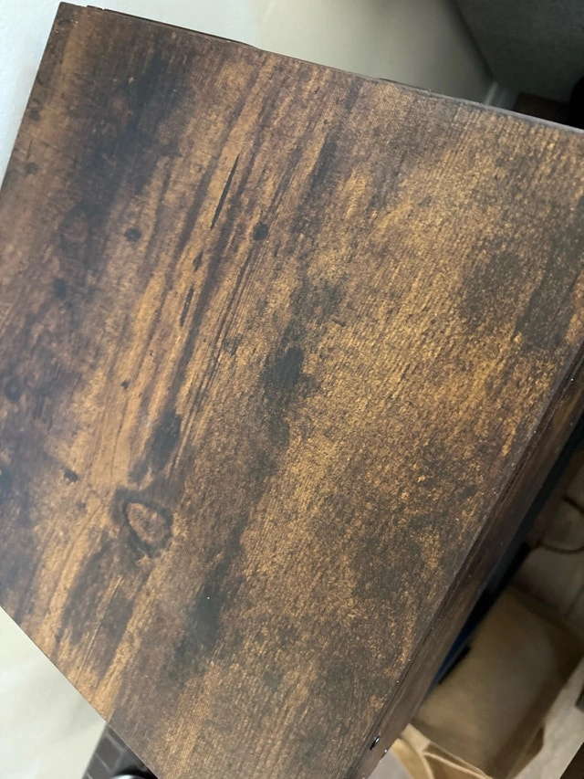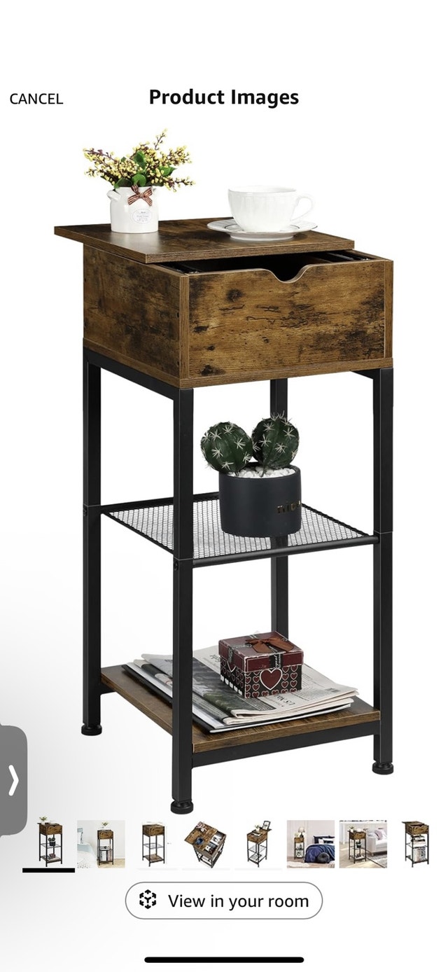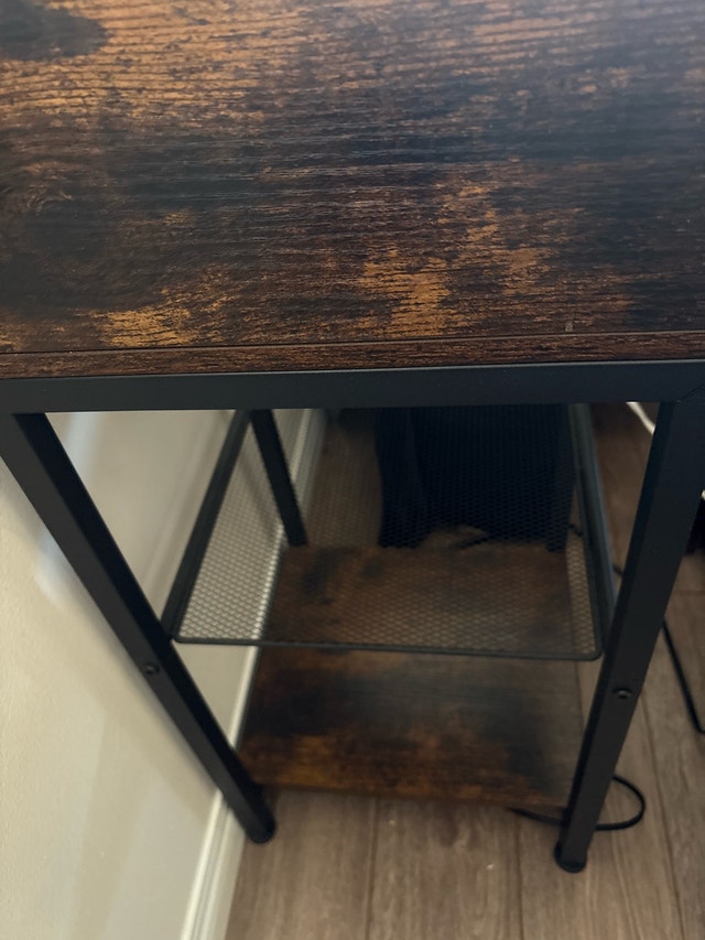 Small table with hidden compartment and two lower tiers of shelving. Color looks a bit different from the ad so make sure you look at the extra picture. No wear/damage.