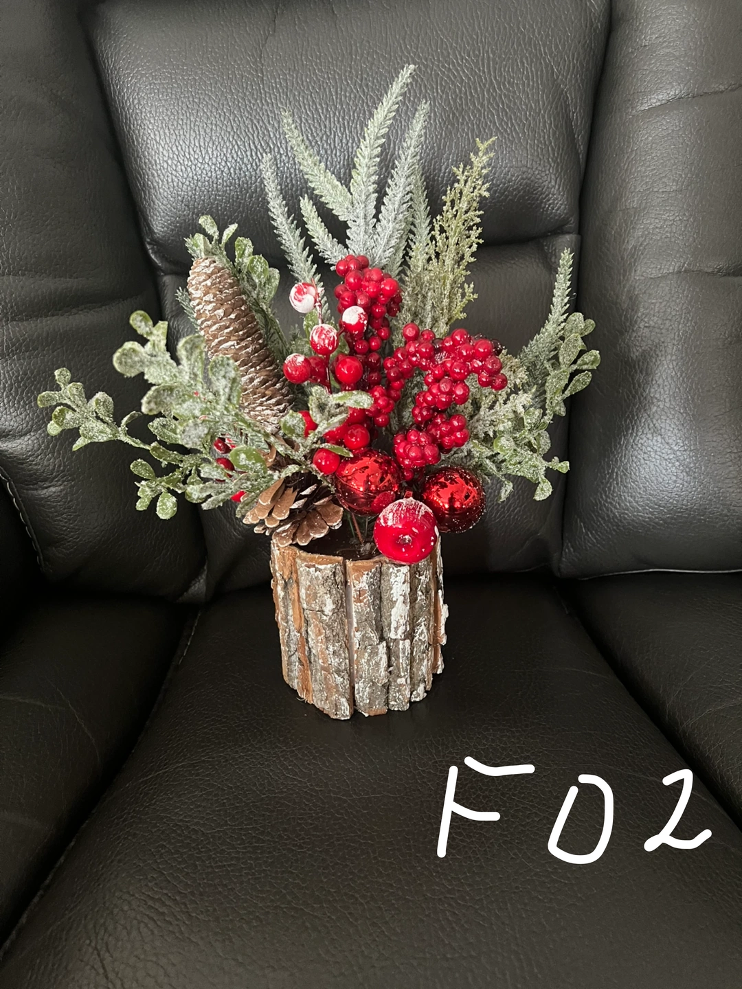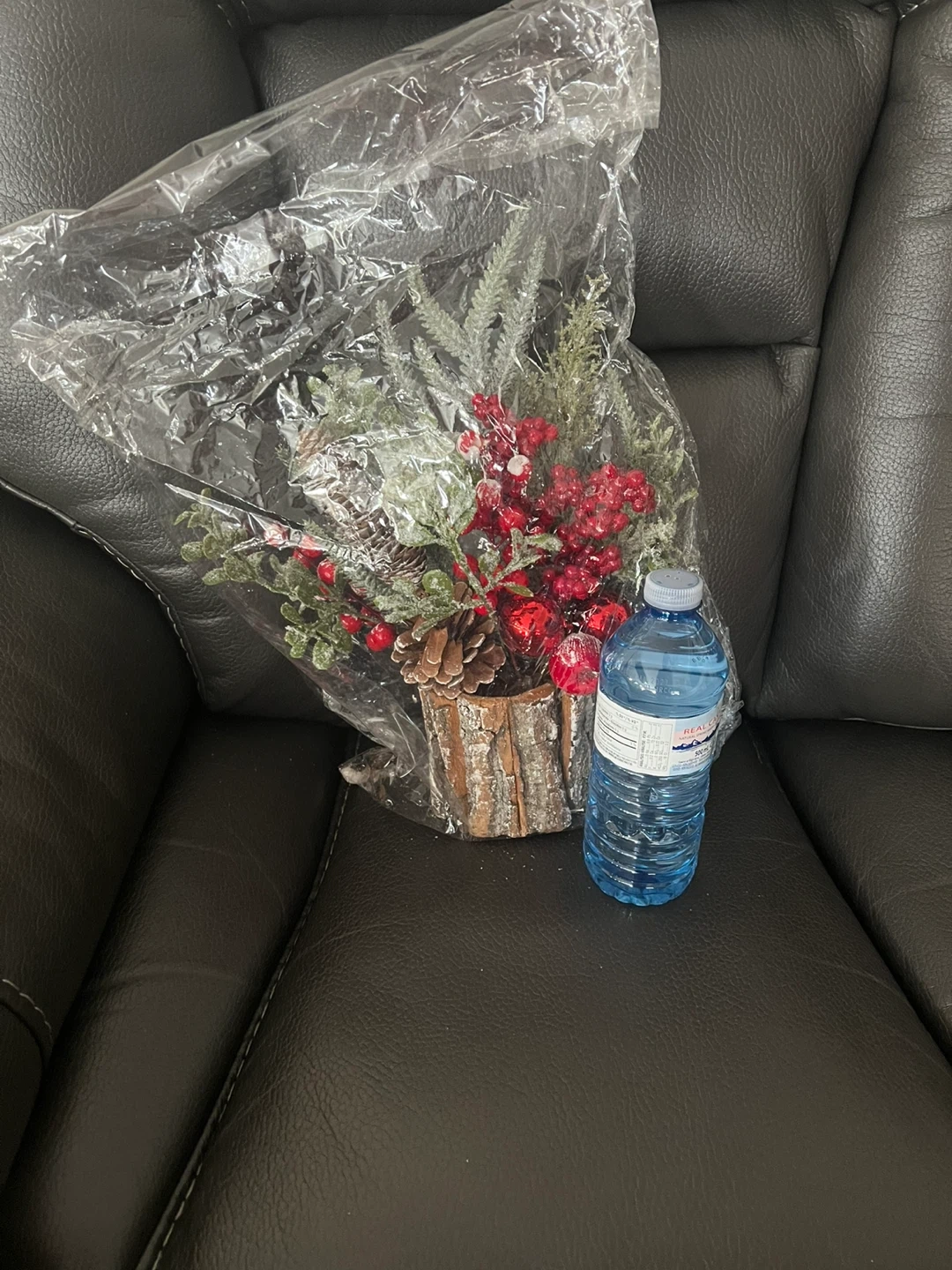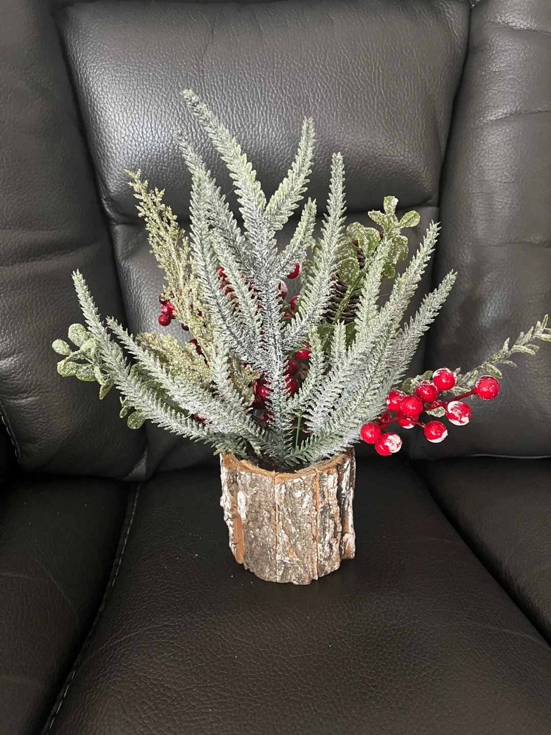 NEW- Still in original wrapping (taken out for photo only). This is a cute festive floral arrangement in a wood-look base. It's perfect for adding a touch of holiday cheer to any room! It features frosted greenery and bright red berries. Approximately 13” tall. Water bottle for reference only.