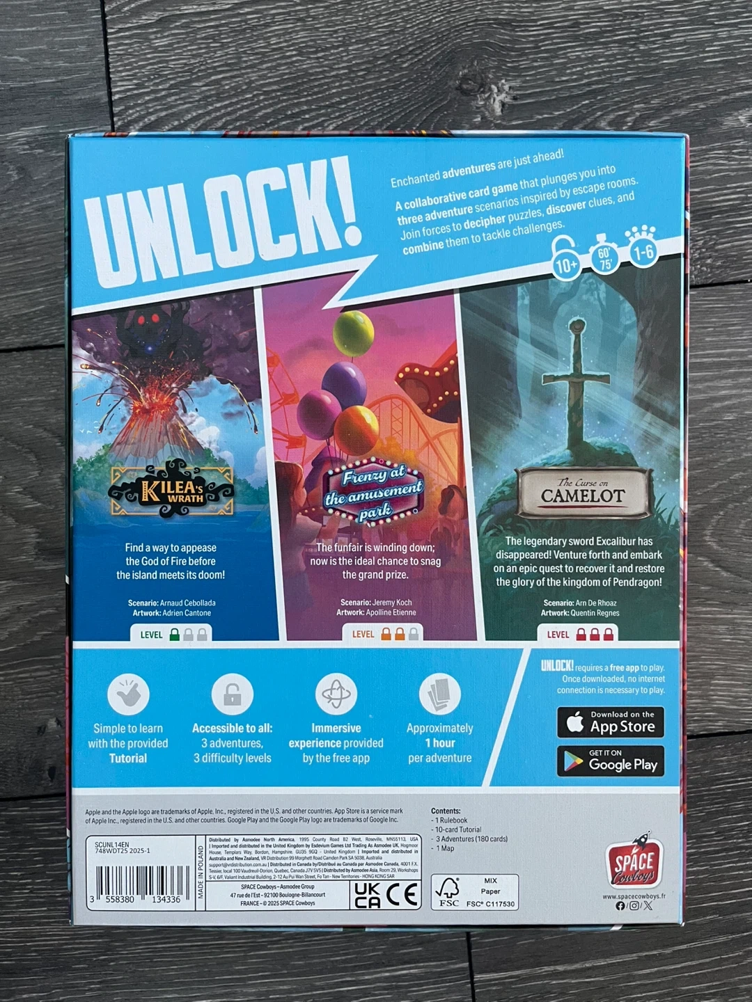 Three adventures inspired by escape rooms. Join forces to decipher puzzles, discover clues, and combine them to tackle challenges. The game is simple to learn with the provided tutorial and is accessible to all with 3 difficulty levels. Enjoy an immersive experience powered by the free app for approximately 1 hour per adventure. Contents include 1 tutorial, 1 rulebook, and 3 adventures (180 cards).