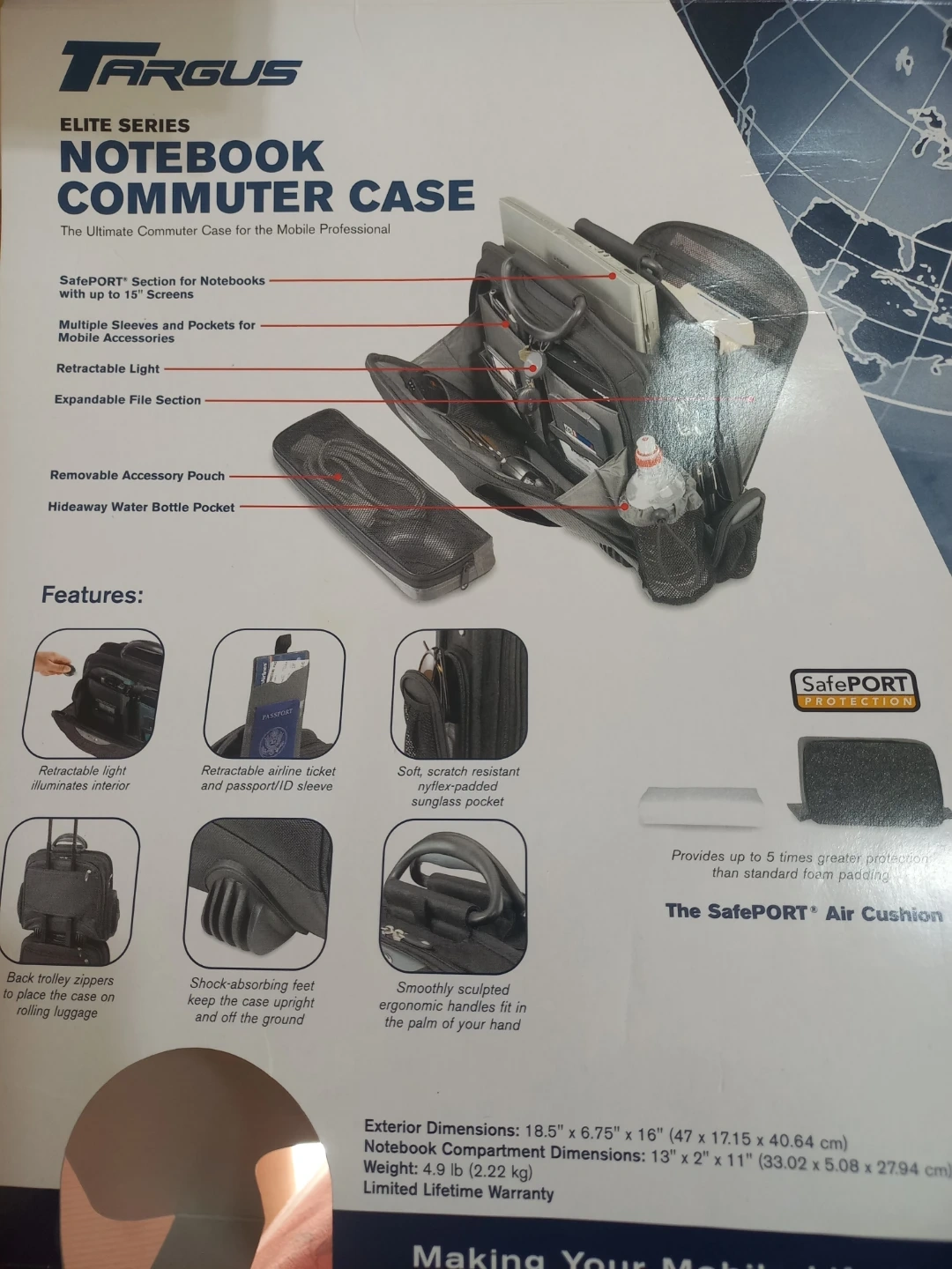 Brand spanking new still sealed Targus Elite Series Notebook Commuter Case, a commuter case for the mobile professional! It has a SafePort section for notebooks with up to 15" screens. It also features multiple sleeves and pockets for mobile accessories, a retractable light, and an expandable file section. It has a removable accessory pouch and a hideaway water bottle pocket. The exterior dimensions are 18.5" x 6.75" x 16". Compact business portfolio and looks sharp.