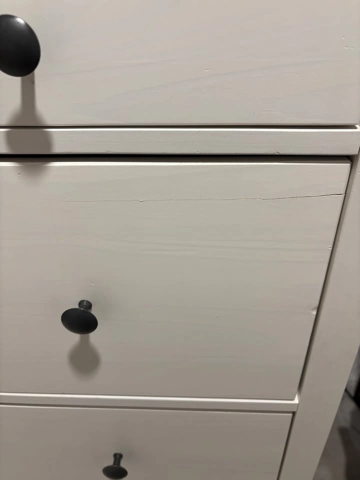 White Storage cabinet with 5 drawers. In fair condition, couple of scratches on the drawers, doesn't affect the functionality. The bottom drawer doesn't open properly, the roller needs to be changed. Could use it in the bathroom or bedroom for storage.