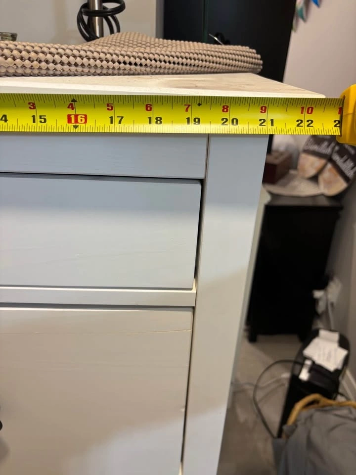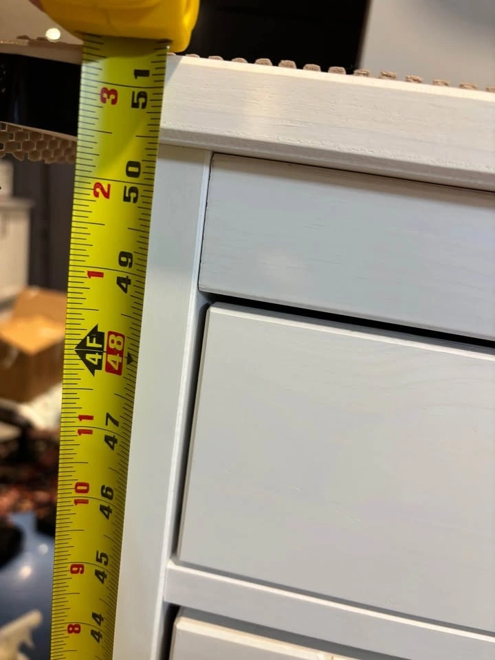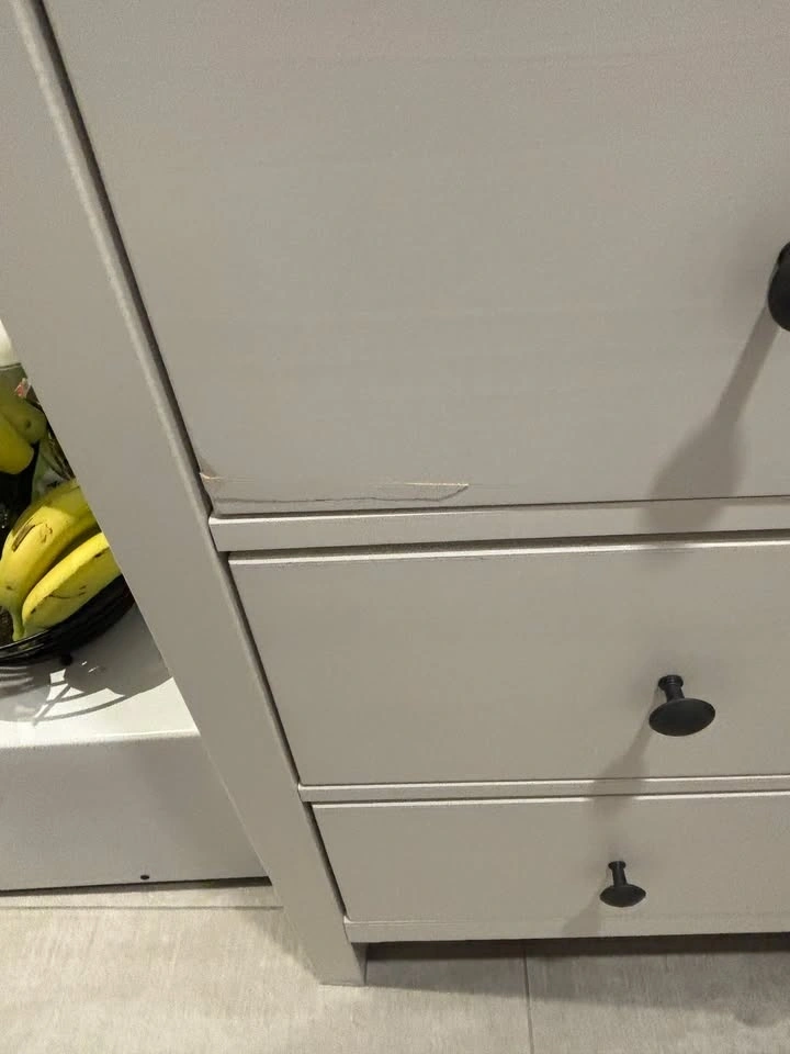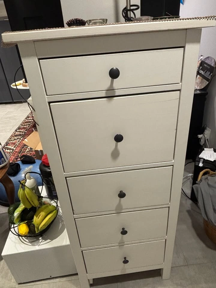 White Storage cabinet with 5 drawers. In fair condition, couple of scratches on the drawers, doesn't affect the functionality. The bottom drawer doesn't open properly, the roller needs to be changed. Could use it in the bathroom or bedroom for storage.