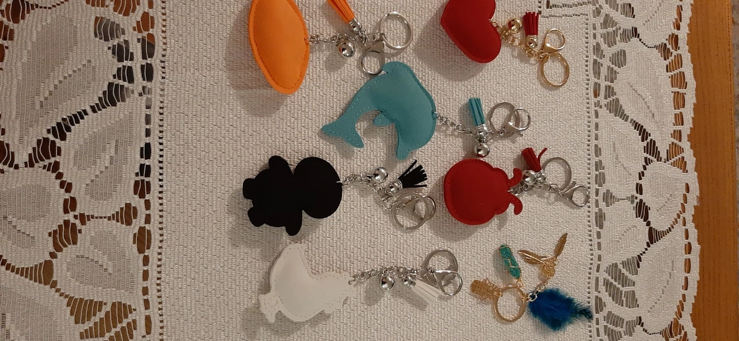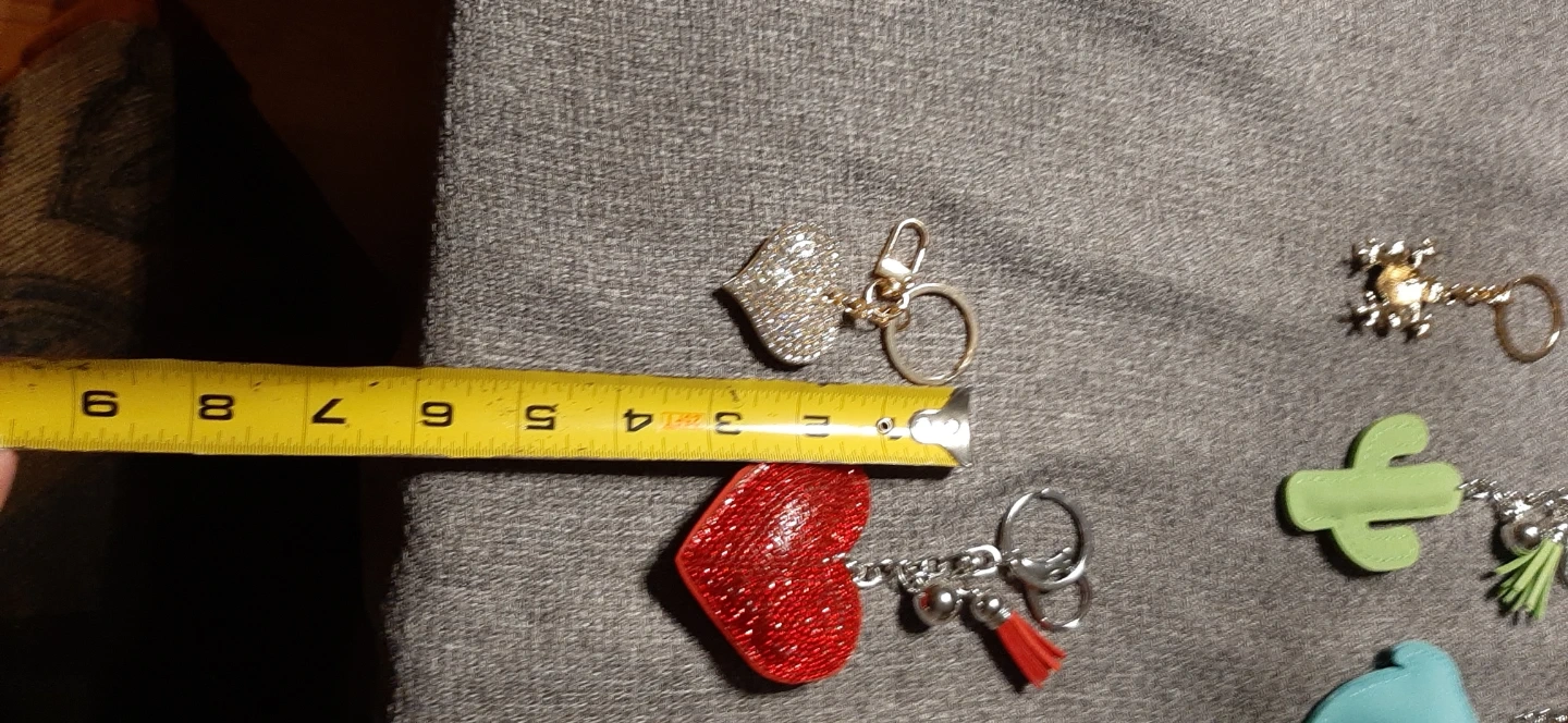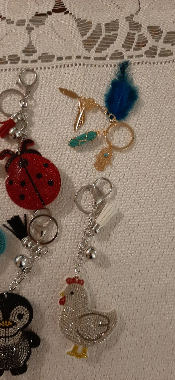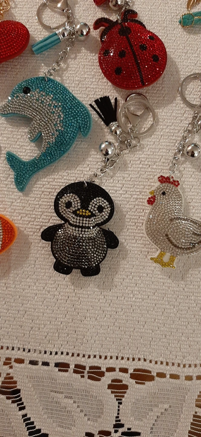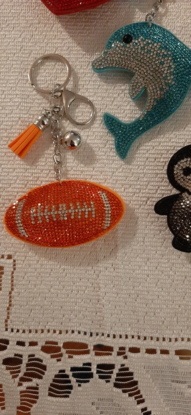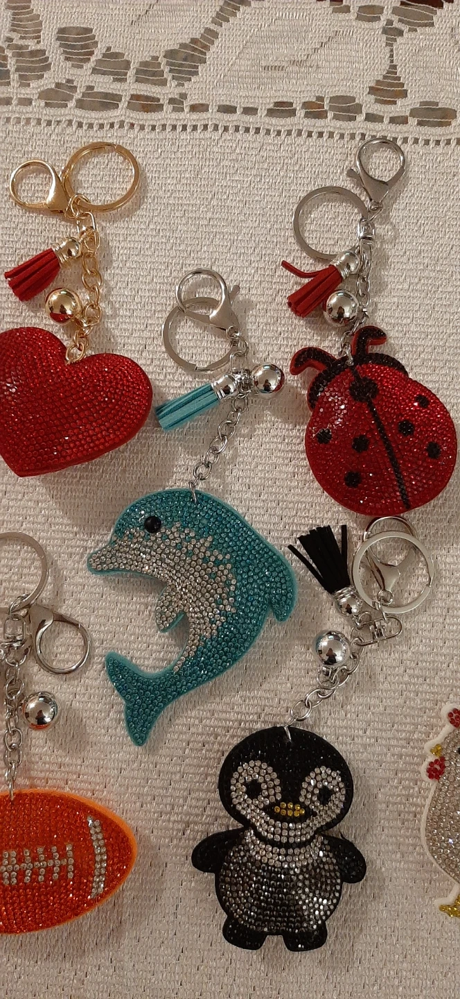Variety of rhinestone keychains for sale. They are in great condition and ready to add some sparkle to your keys or bag. Choose from a dolphin, penguin, ladybug, chicken, football, heart, or hummingbird!