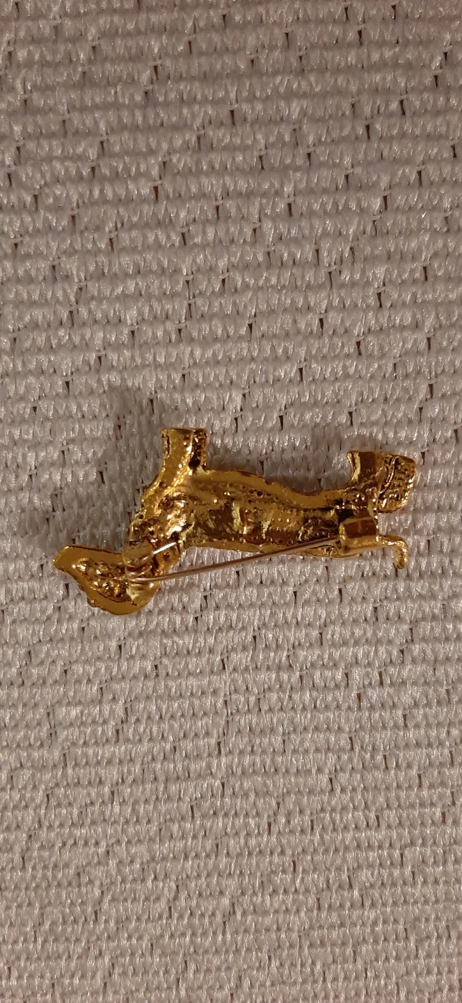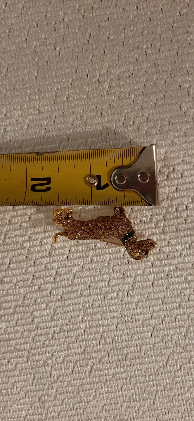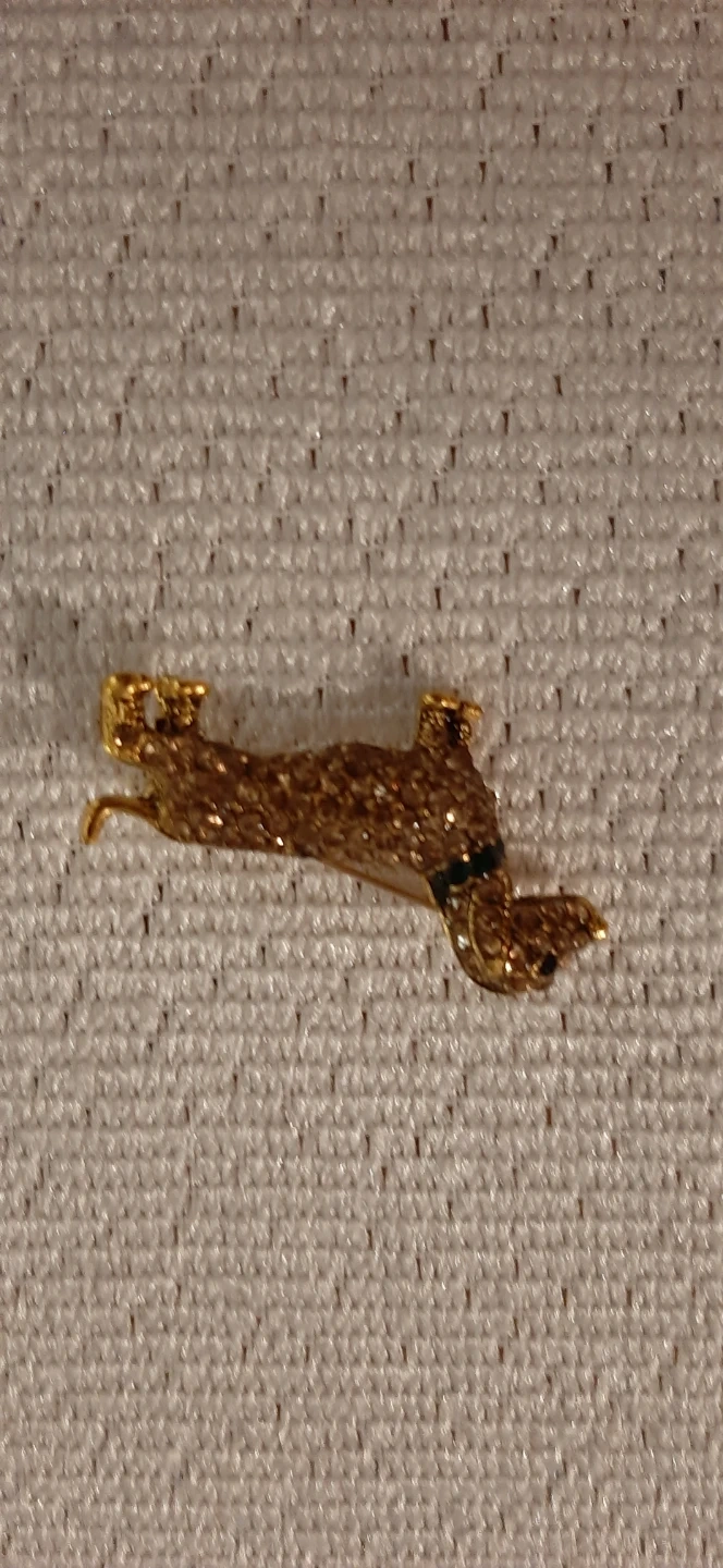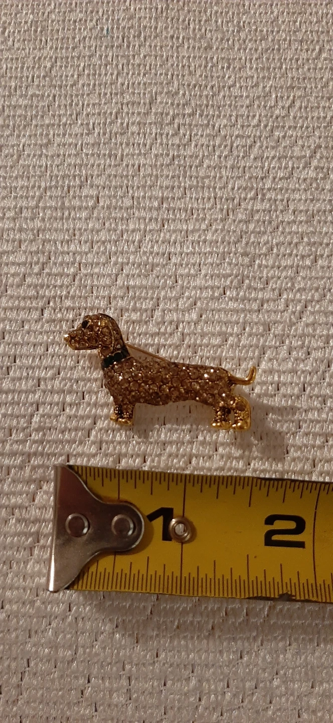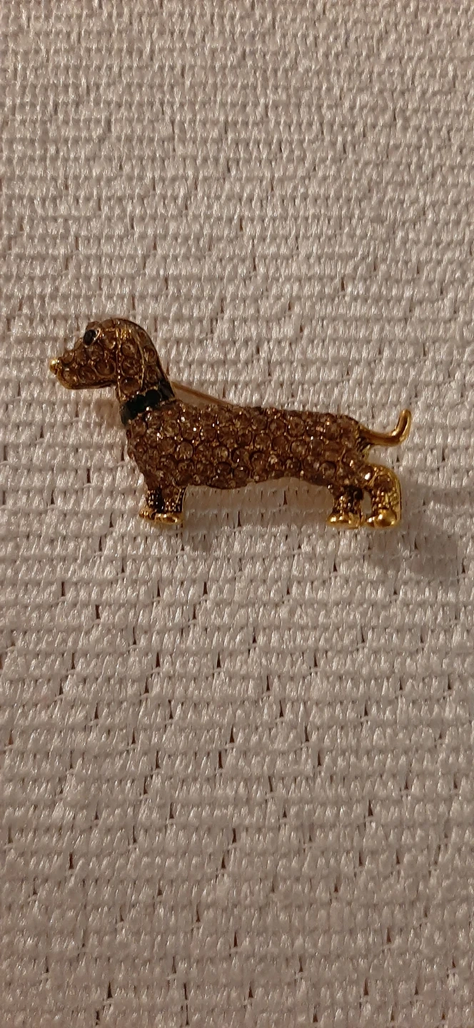 Cute dachshund dog brooch pin! It's gold in color and covered in rhinestones. The pin measures approximately 2 inches in length.