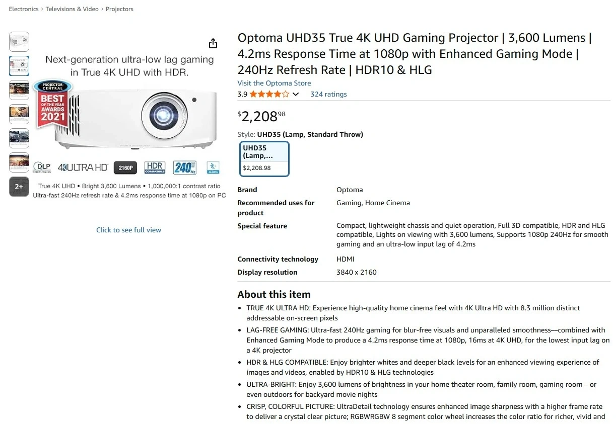 Brand new Optoma UHD35 true 4K gaming and movie projector for sale. Home theater, bright 3600 lumens, 4.2ms response time at 1080p with enhanced gaming mode, 240Hz refresh rate, HDR10 and HLG, 8.3 million distinct on screen pixels, variety of inputs, projects up to 300” inches, 15,000 hours of lamp life, high contrast ratio 1,000,000:1, 1.1x zoom and 40 degree keystone correction, comes with power cord and remote control. $1600 FIRM.