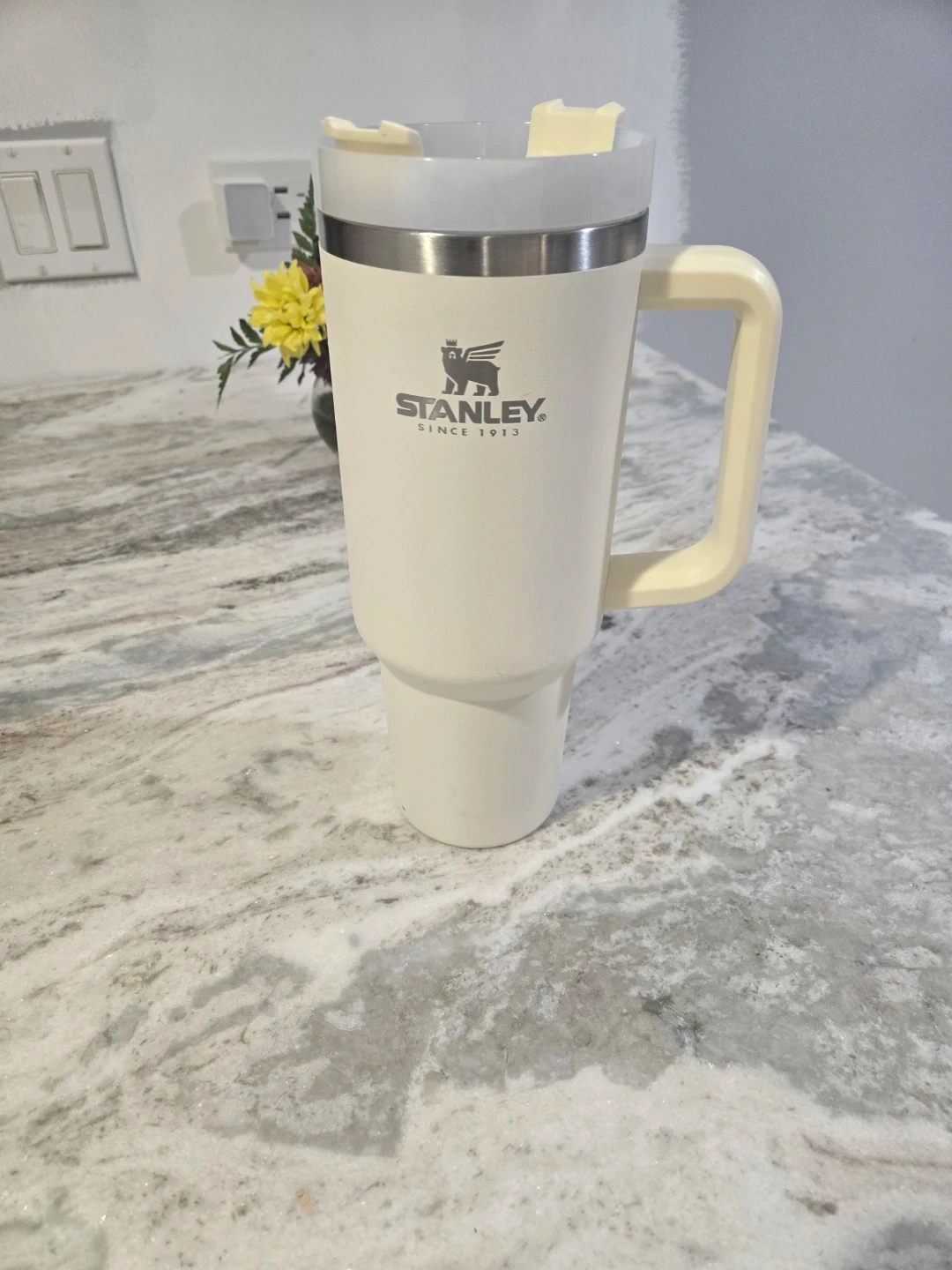 Selling a Stanley Adventure Quencher in a cream color! It's the 40oz size, perfect for staying hydrated on the go. This tumbler is BPA free and dishwasher safe, making it super convenient to use and clean