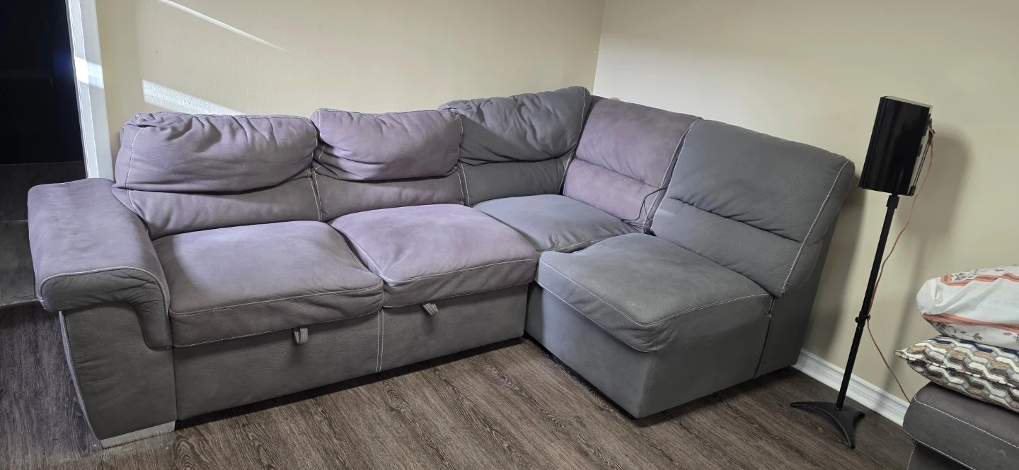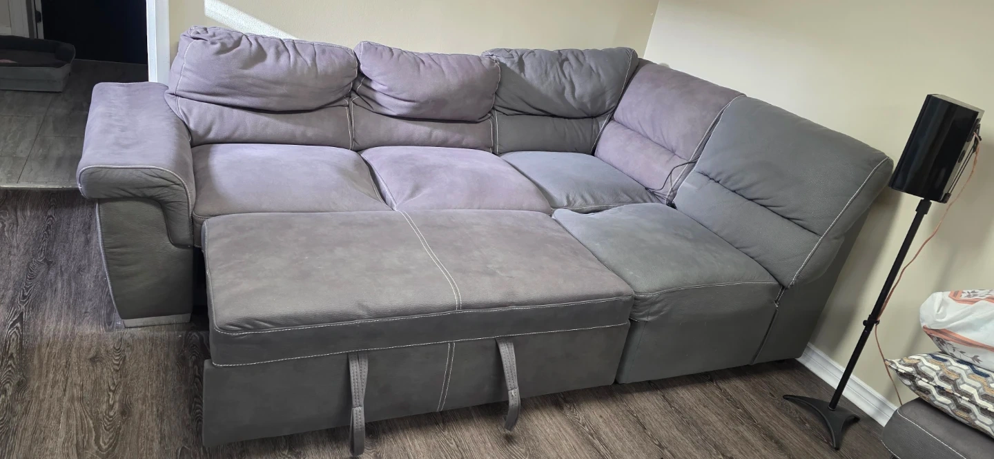 $100 need to pickup Asap Selling a grey sofa bed and ottoman in good condition. Its used .4 years old .moving sale .need to pick up ASAP. plus 4 brand new cusions..