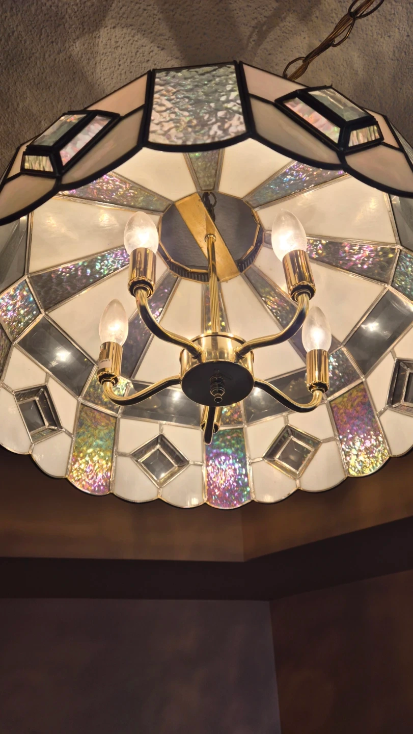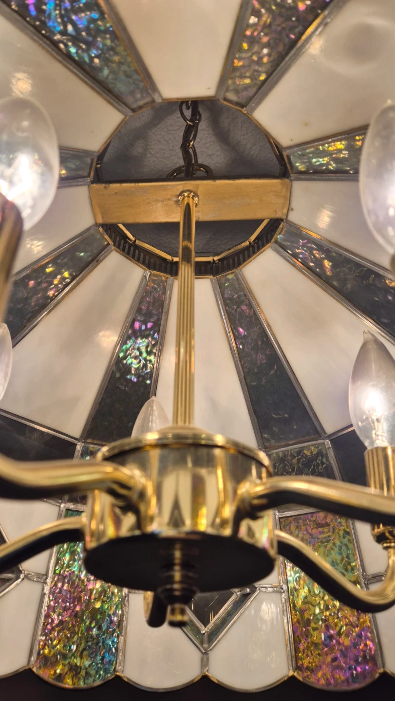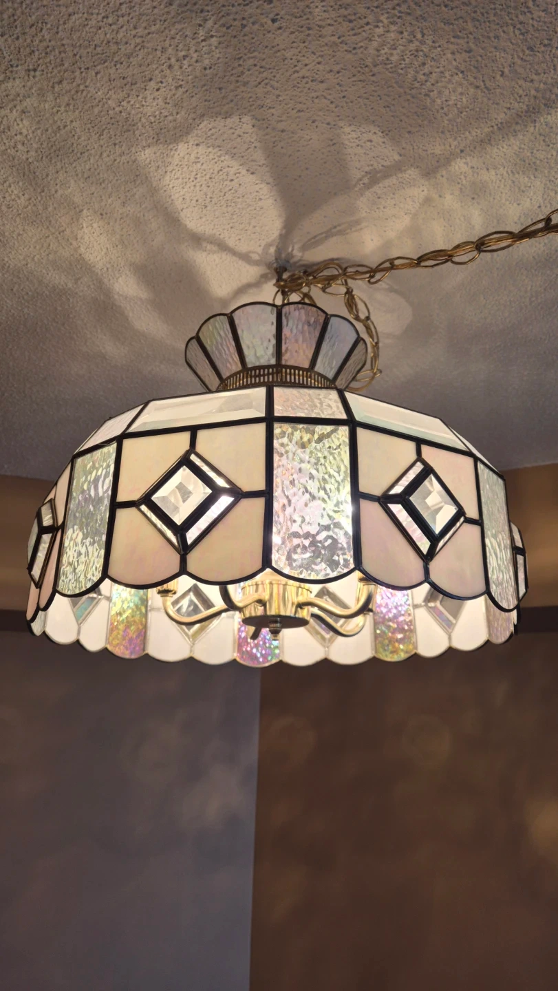 Selling a lovely vintage stained glass hanging lamp. It's in great shape and would add a touch of elegance to any room! The iridescent glass gives off a beautiful glow when lit.