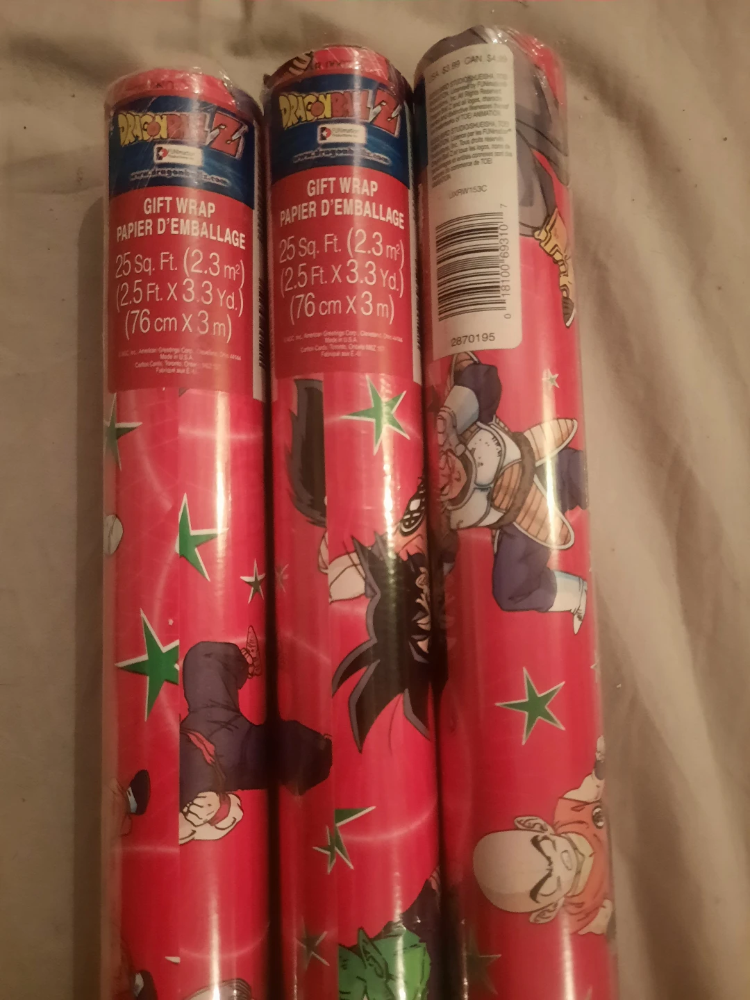 I'm selling Dragon Ball Z gift wrap. Each roll contains 25 sq. ft. (2.3 m²) of wrapping paper. Perfect for any DBZ fan's gifts!