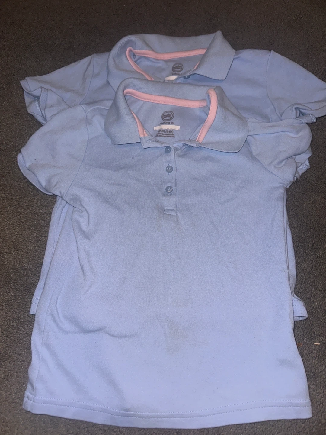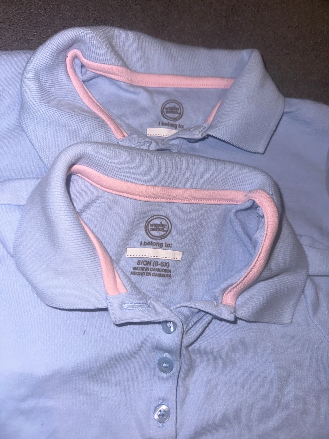 Two gently used Wonder Nation polo shirts for girls, size small (6-6X). They're a light blue color with a pink trim around the collar. Perfect for school or casual wear!