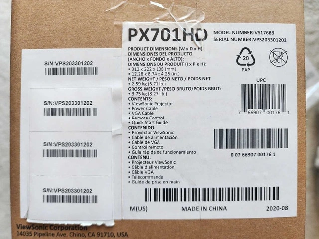 Like new in the original box as shown in my pics. Ideal for both home entertainment and office use, the ViewSonic PX701HD delivers stunning Full HD images for versatile projection. With 3,500 ANSI lumens, this high-brightness projector delivers clear pictures even in brightly lit rooms. What's more, an energy-saving SuperEco feature reduces power consumption and extends the lamp life by up to 20,000 hours, effectively reducing lamp replacement and maintenance costs. Dual HDMI inputs 12,000:1 dynamic contrast ratio Energy-saving SuperEco feature reduces power consumption Vertical lens shift vColorTuner feature allows you to create & update your own color profile, then share this profile with other users. Price is firm, no offers, serious buyer & local pickup in Richmond Hill with cash only, please read my full ad & only contact when you are ready to buy.