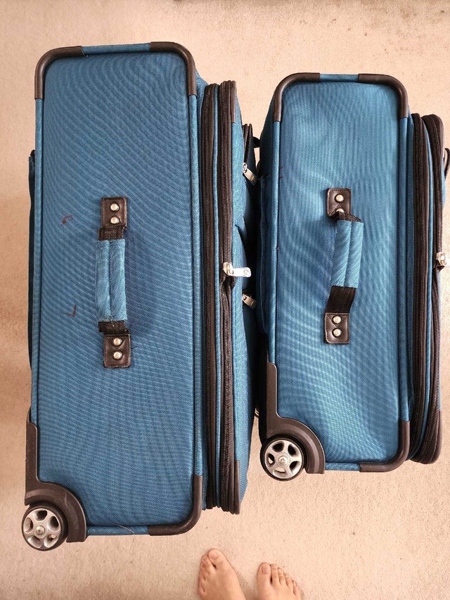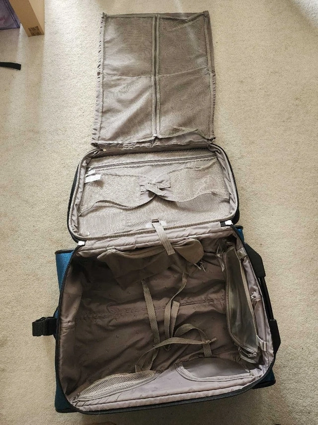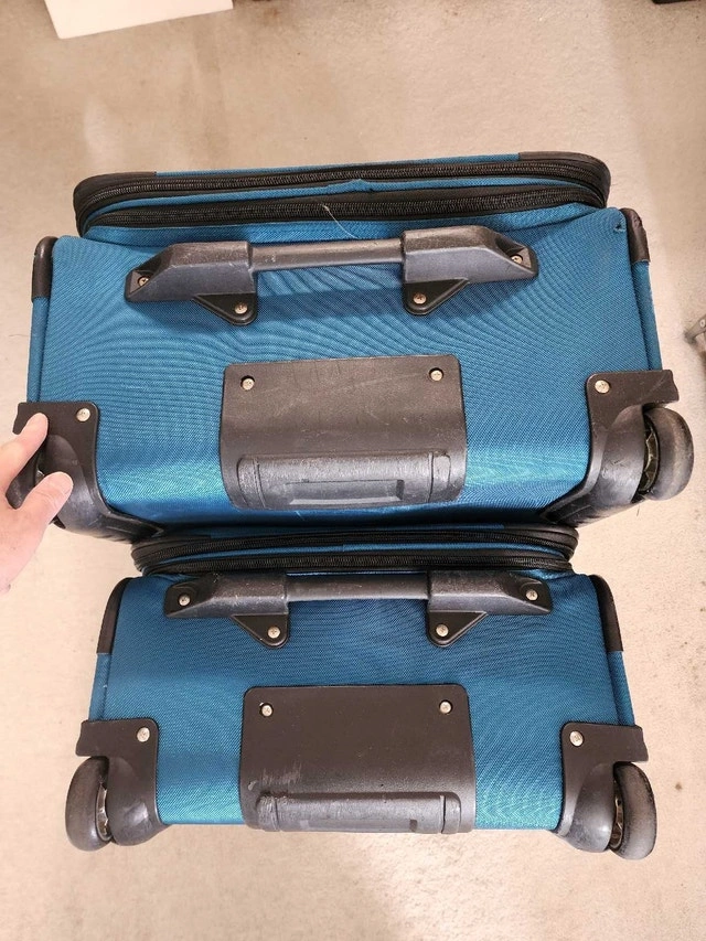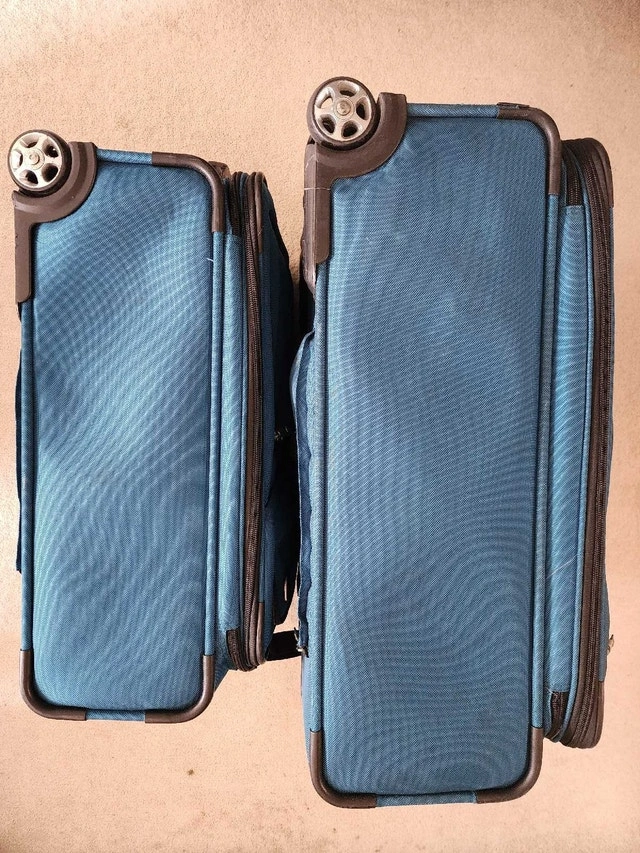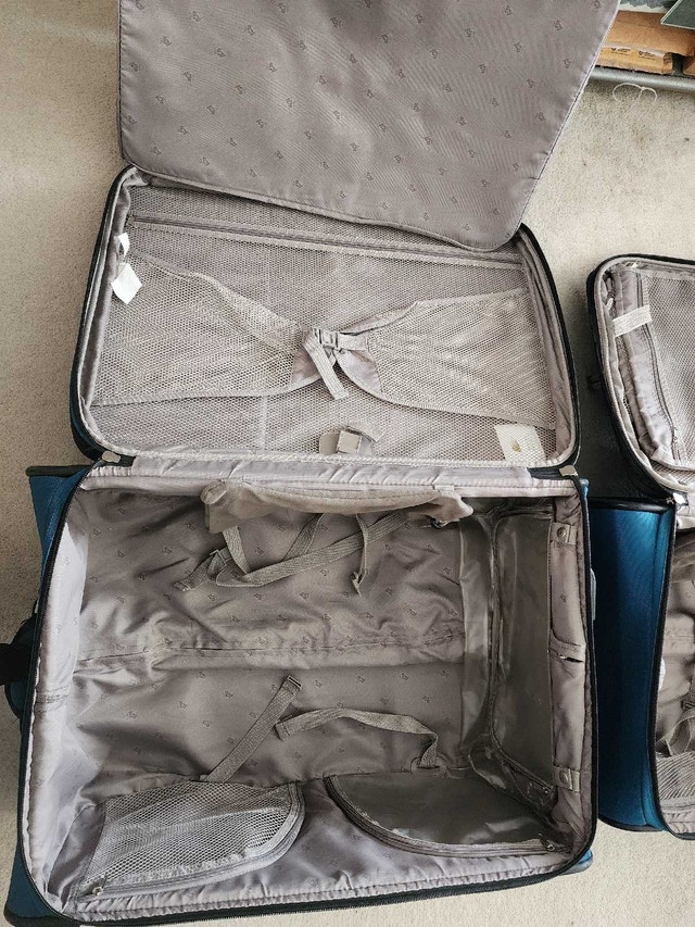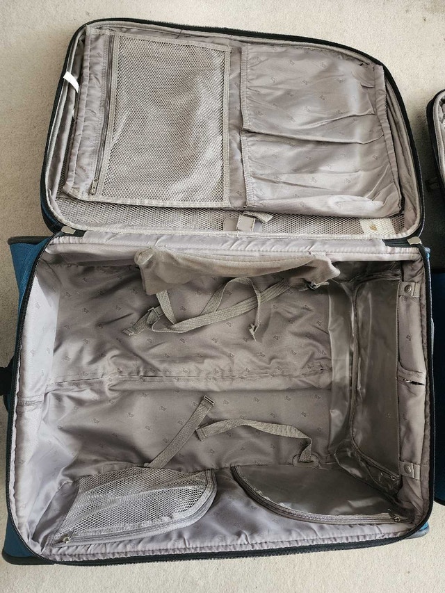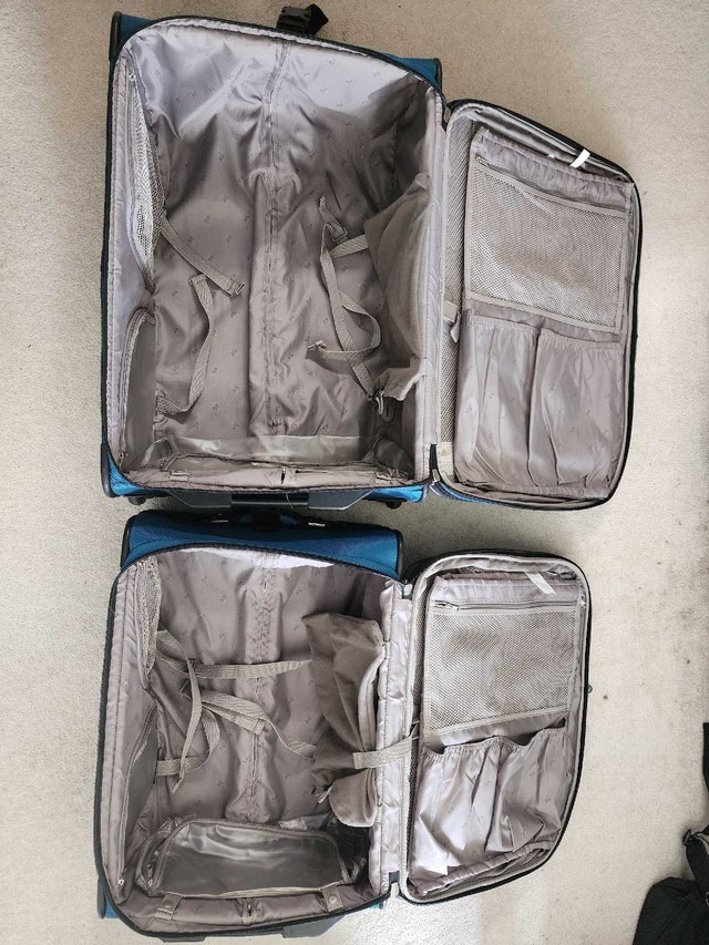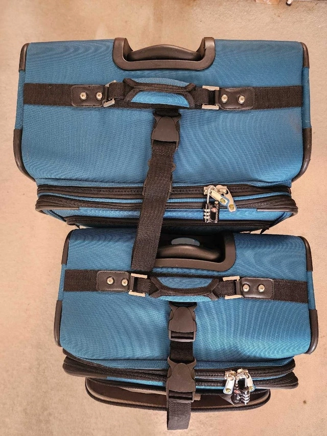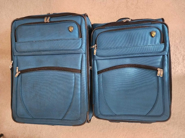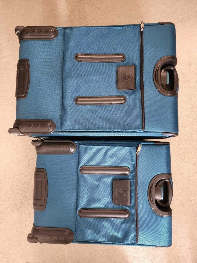 Two-piece luggage set in teal blue. Spinner wheels. Multiple compartments, carry handles and straps. Only used a few times. Hi-Stability - duo wheel positioning with extendable stand provides better balance. Lockable zipper with built-in heavy duty zipper hole with supplied 3-digit TSA Combination Lock. Lightweight trolley system. Semi expander system. Lots of compartments inside & out including detachable shoe packets, accessories slots, garment protector, etc. Small luggage can fit into the Large luggage for easy storage.