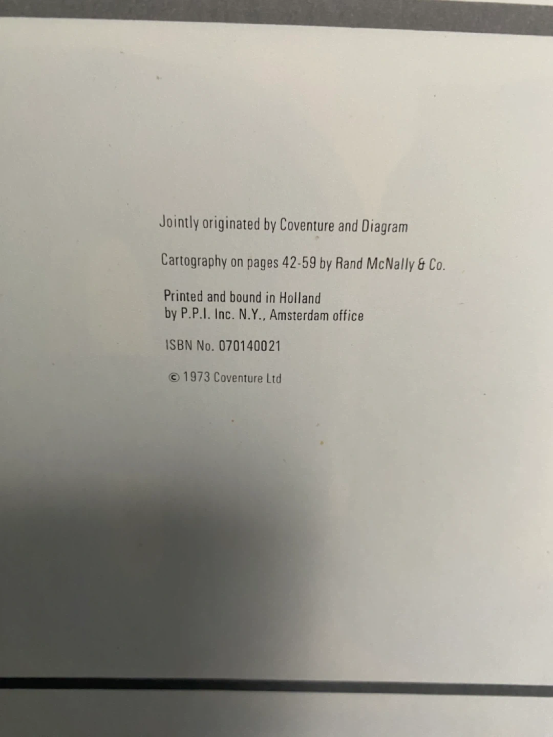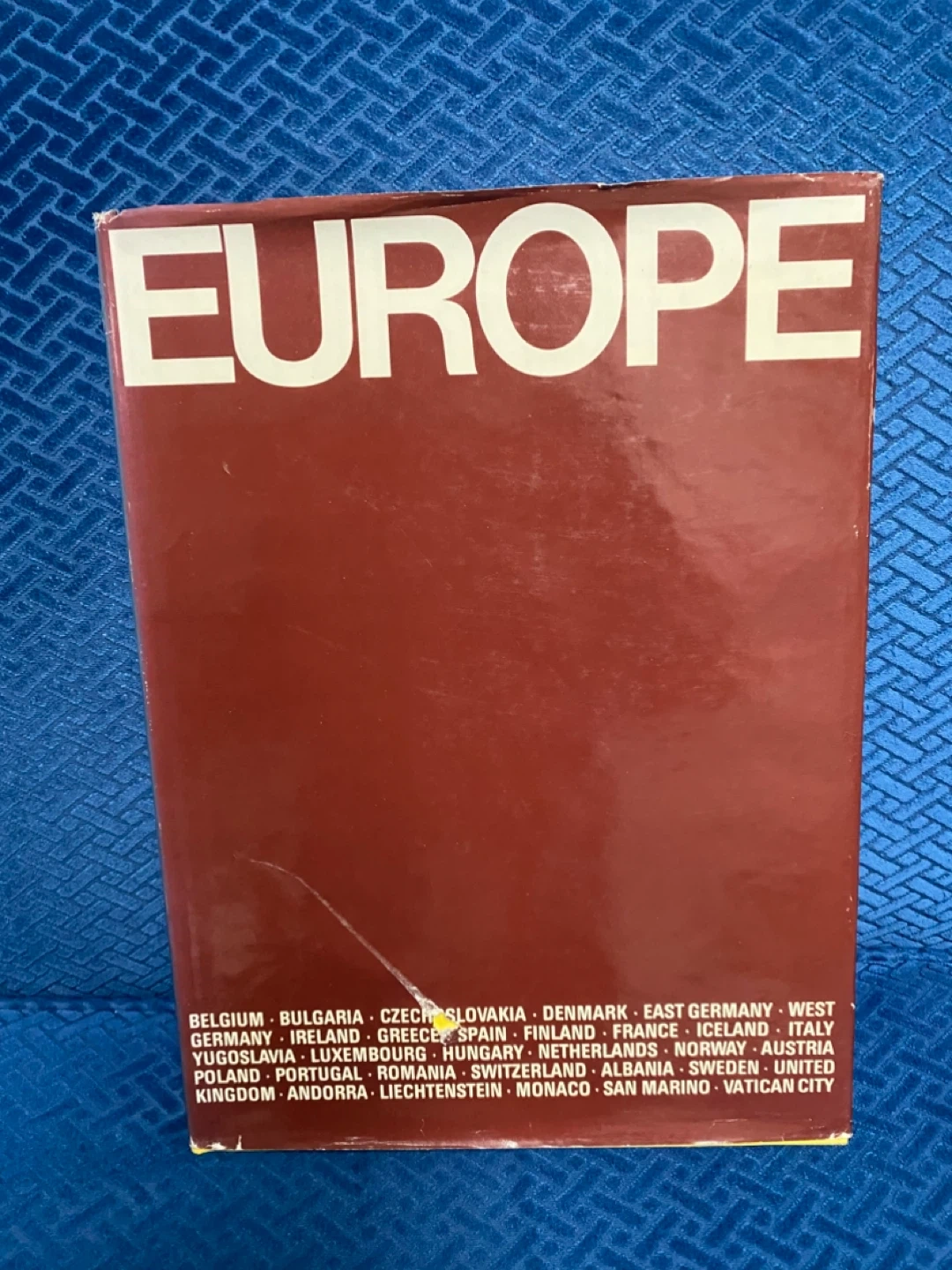 Selling a book titled Europe, jointly originated by Coventure and Diagram. It was printed and bound in Holland by P.P.I. Inc. N.Y., Amsterdam office. The book was copyrighted in 1973 by Coventure Ltd. It includes thematic and map sections.