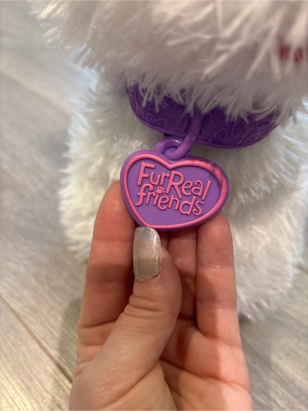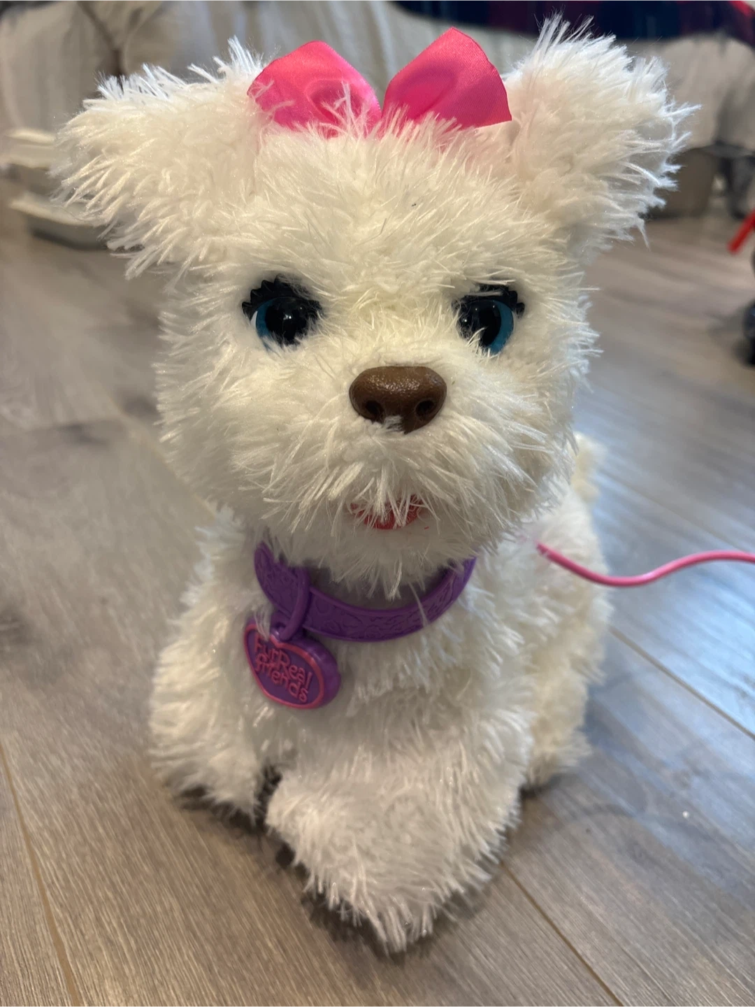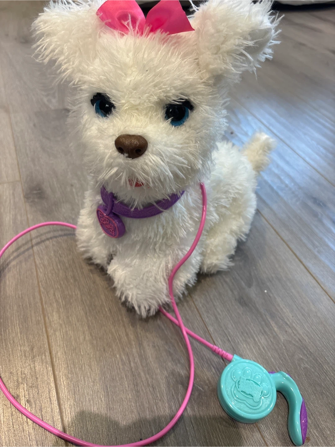 Super cute FurReal Friends interactive puppy! This little one is ready for a new friend. It's in great condition and comes with a pink leash and a turquoise accessory.