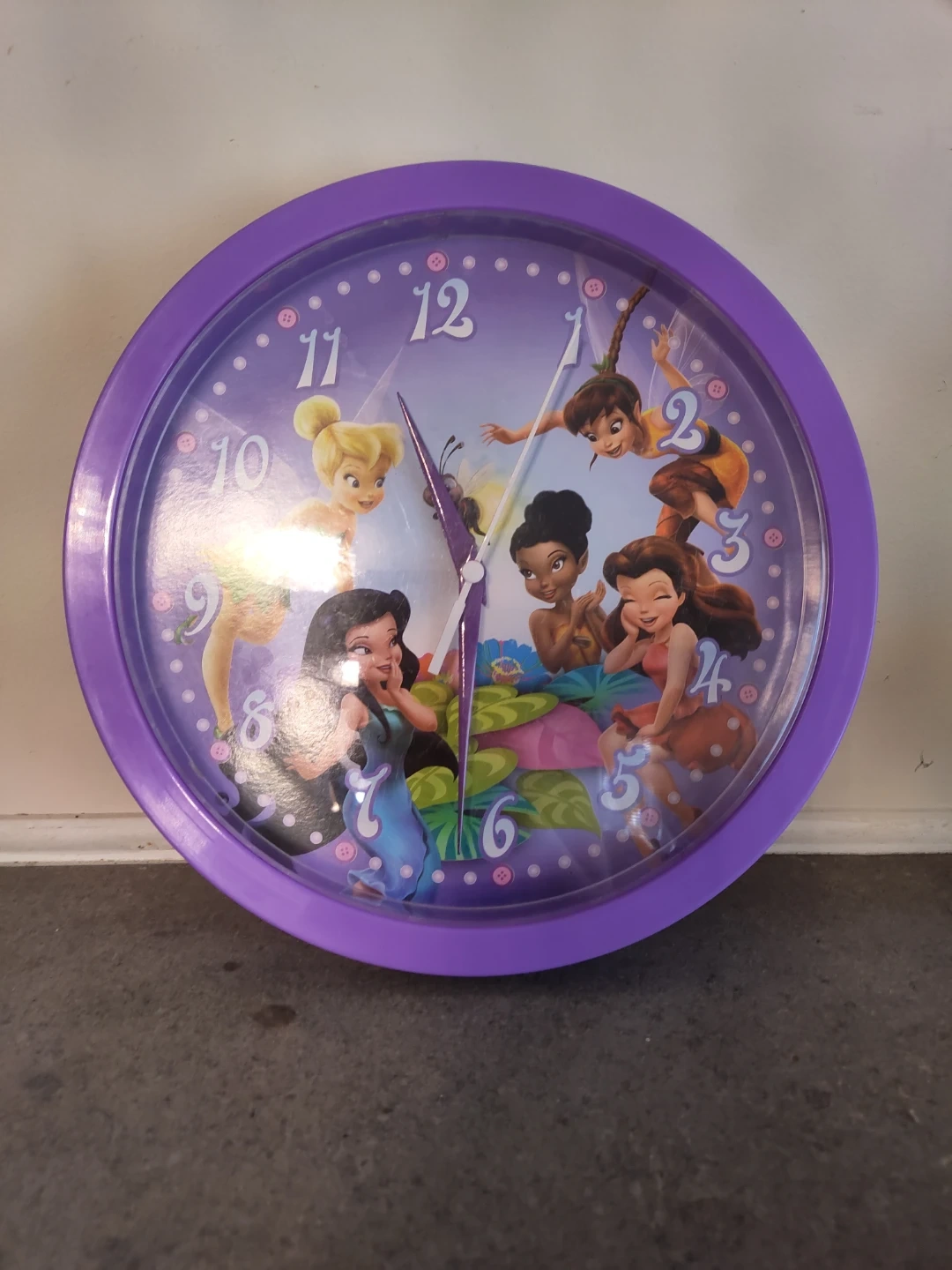 a cute Disney Tinkerbell wall clock! It's purple and features Tinkerbell and her friends on the face. A great addition to any Disney fan's room