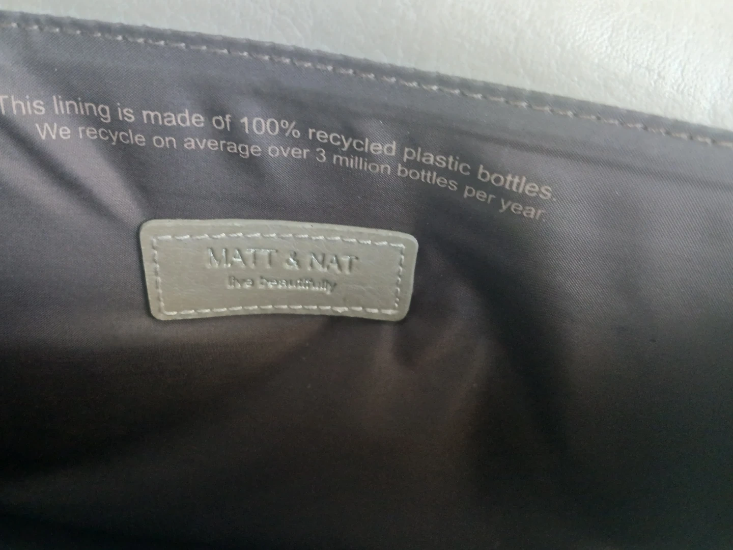 Selling a gently used Matt & Nat crossbody bag! It's in great condition and features a lining made of 100% recycled plastic bottles. The bag is perfect for everyday use and is a stylish, eco-friendly choice.