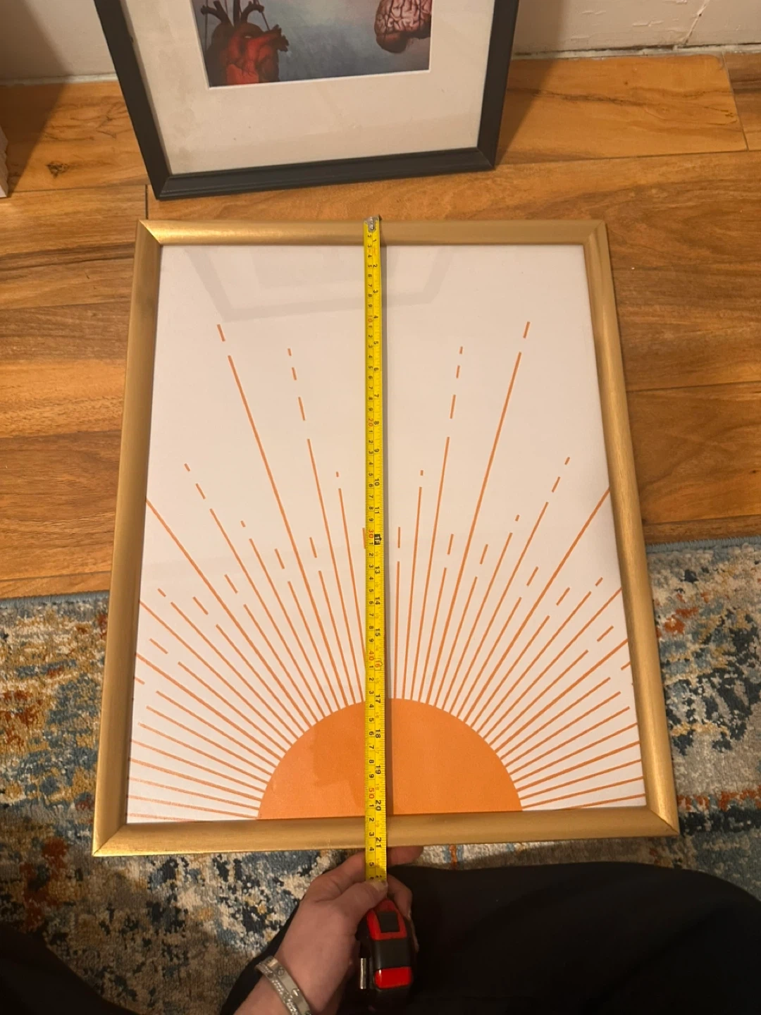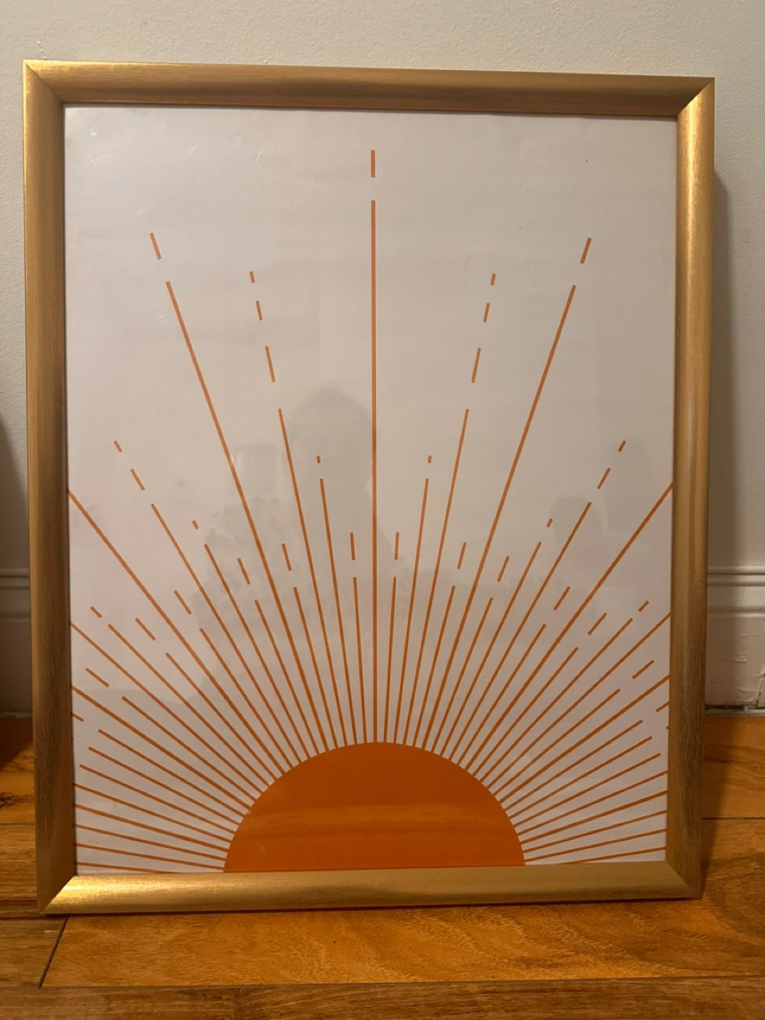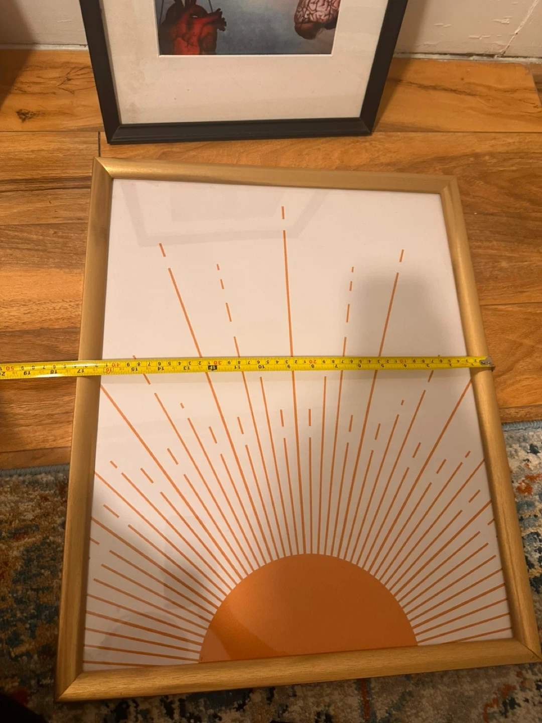 Add a touch of sunshine to your space with this framed wall art! The frame is gold and the print features a modern sun design. It measures approximately 28 inches in height and 22 inches in width, making it a great statement piece for any room