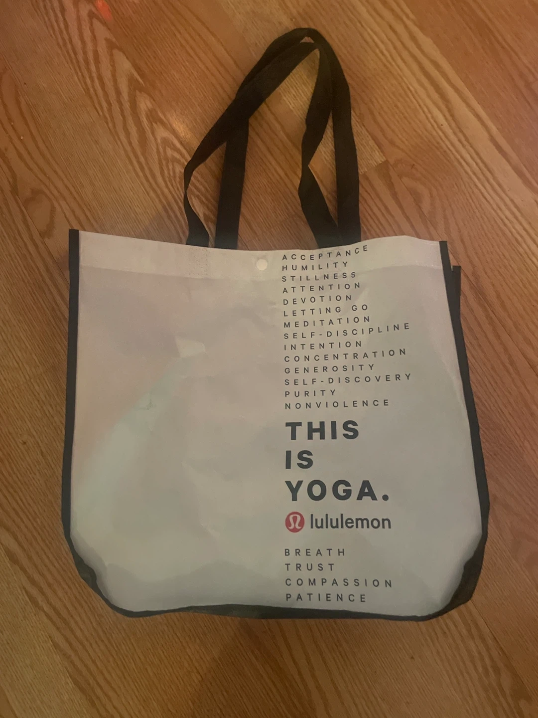 Selling a Lululemon tote bag with the words "THIS IS YOGA" printed on it. It features words like acceptance, humility, stillness, and more. Perfect for carrying your yoga gear or everyday essentials!