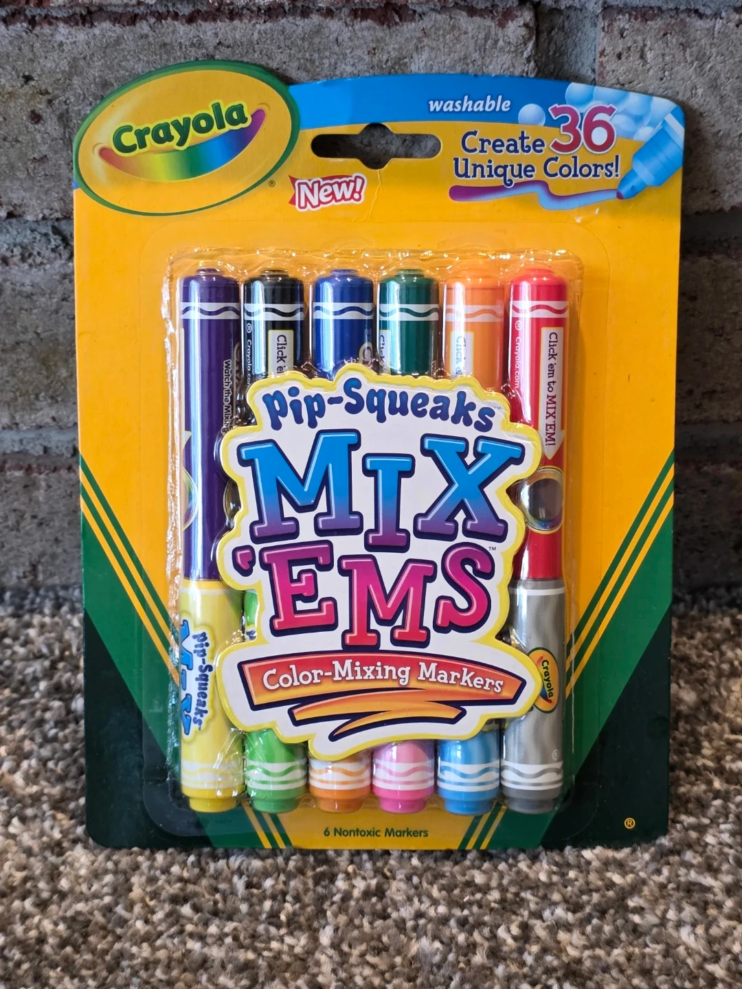 New Crayola Pip-Squeaks Mix 'Ems Color-Mixing Markers! This set includes 6 nontoxic markers that create 36 unique colors. Perfect for any budding artist!