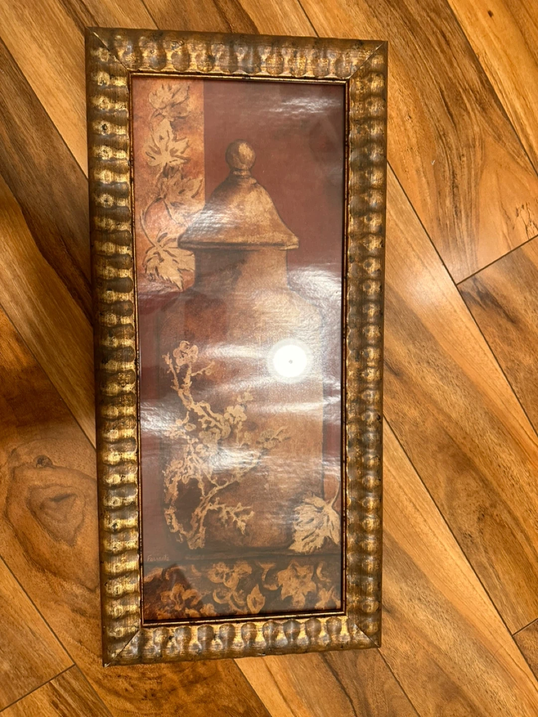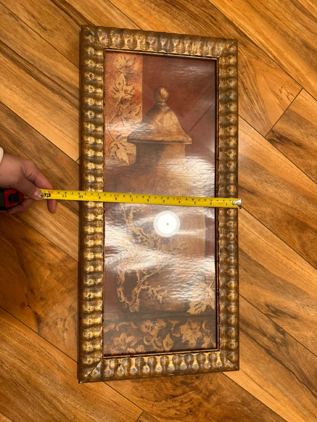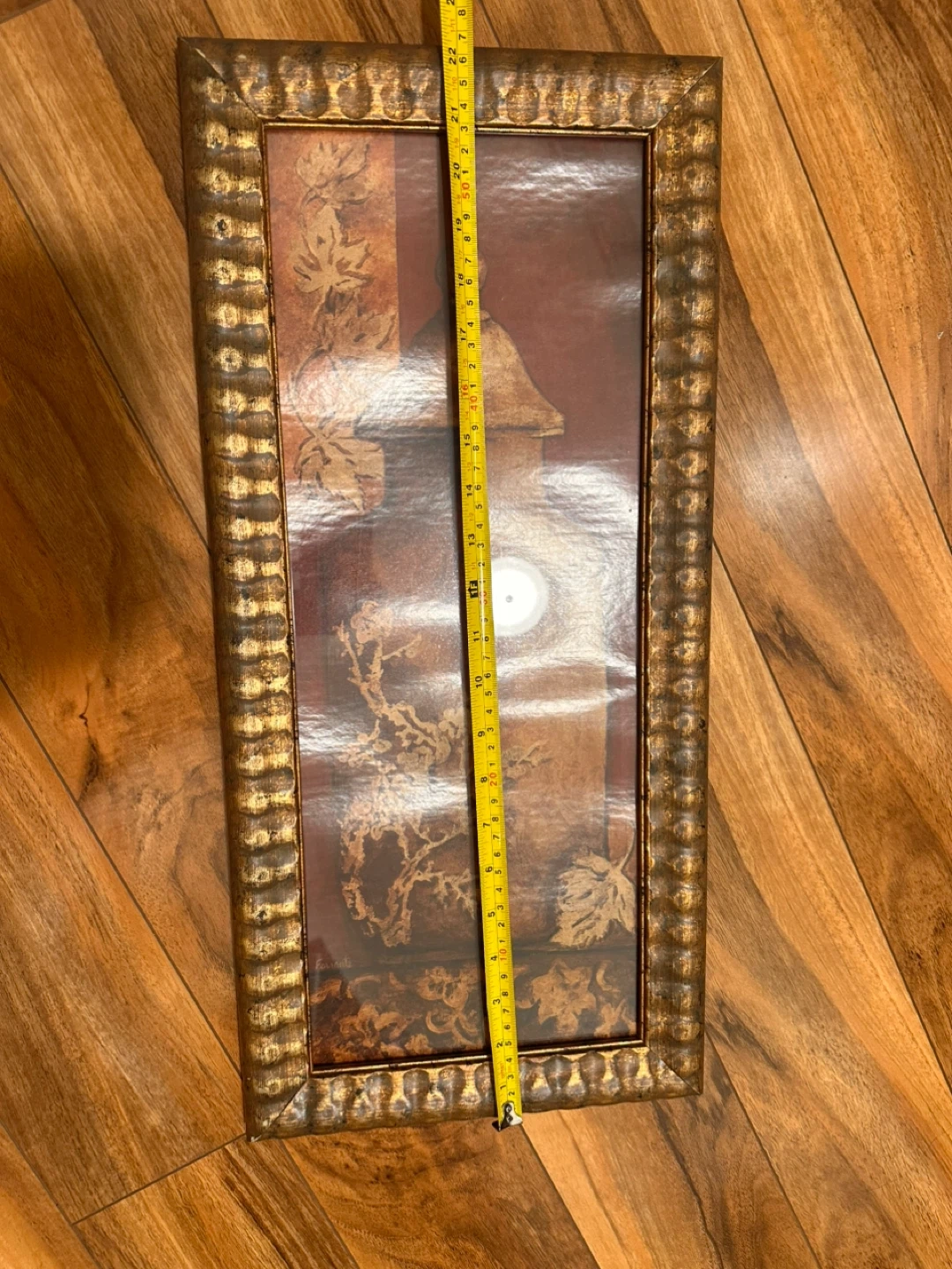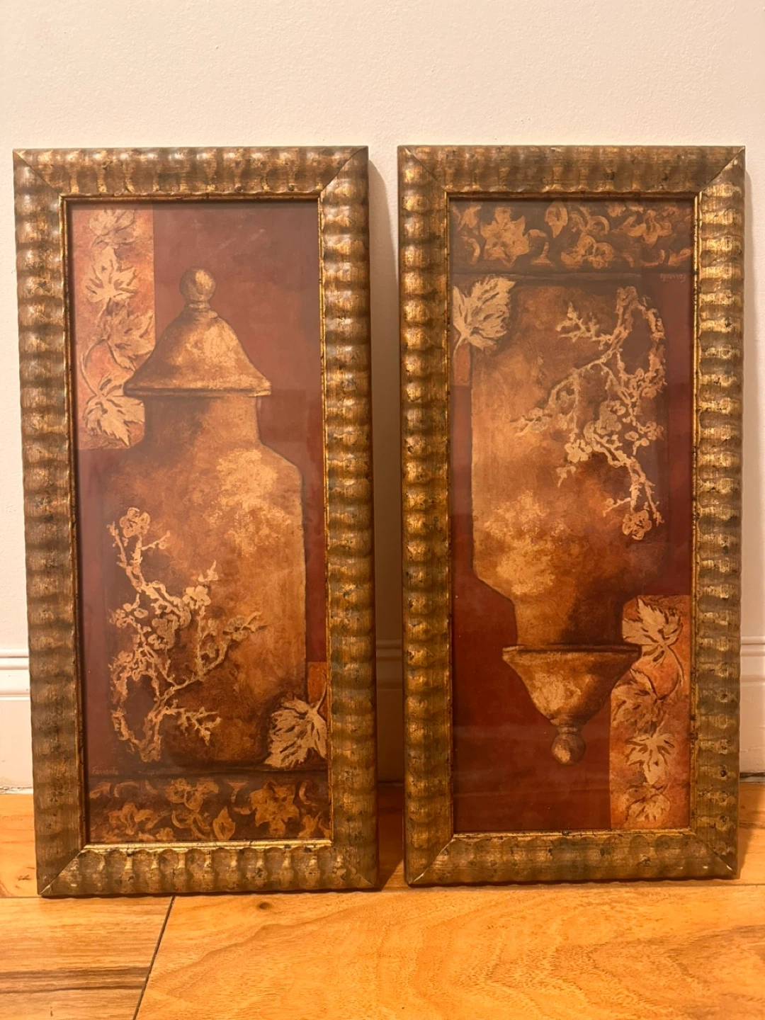 I'm selling a set of two framed wall art pieces. They feature a decorative gold-colored frame and a rustic design. The approximate dimensions are 22 inches in height and 10 inches in width. These would be a great addition to any room!