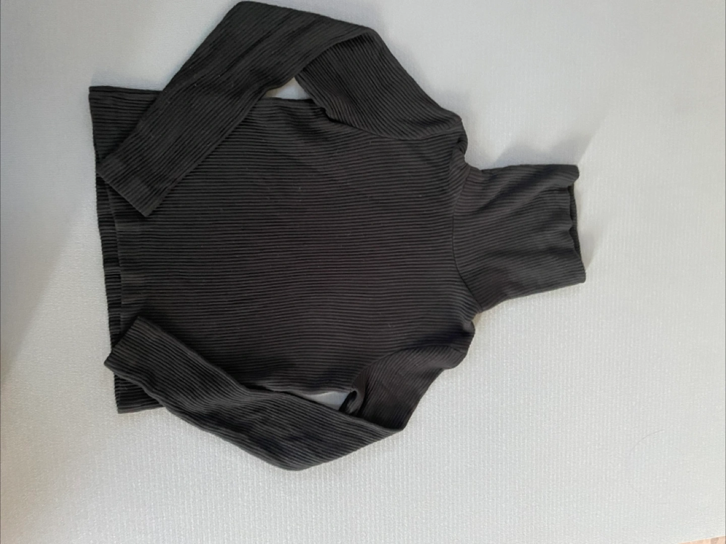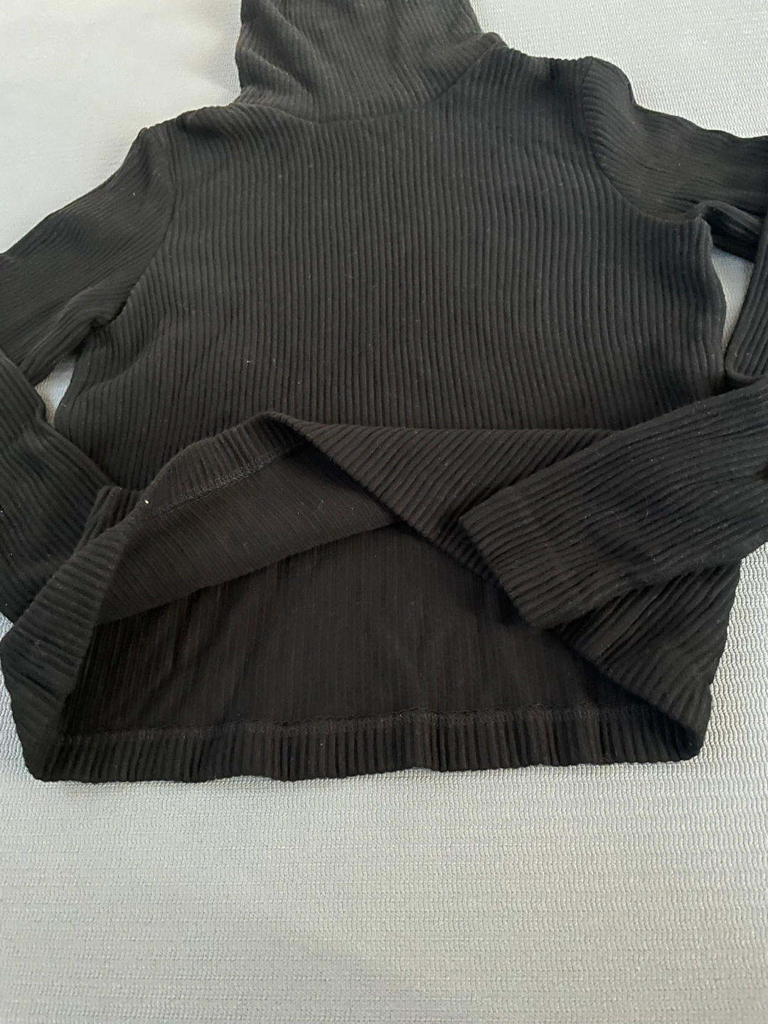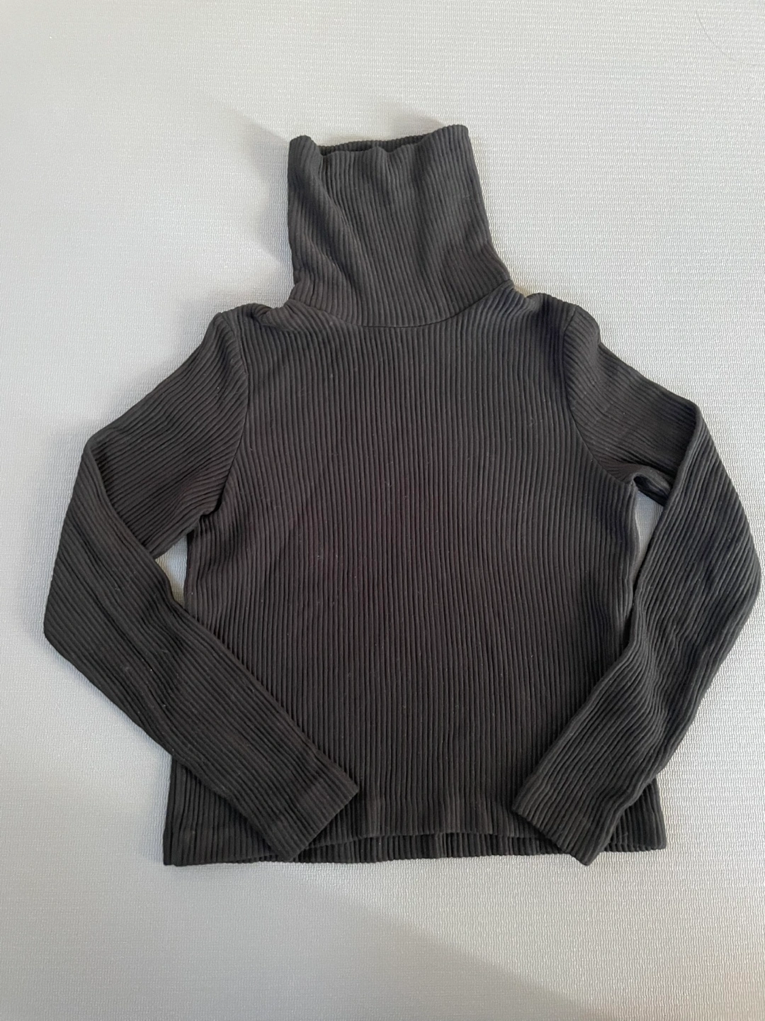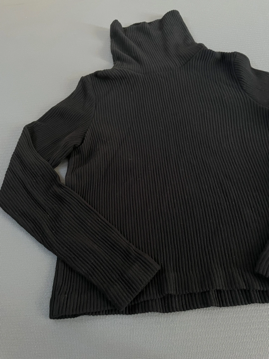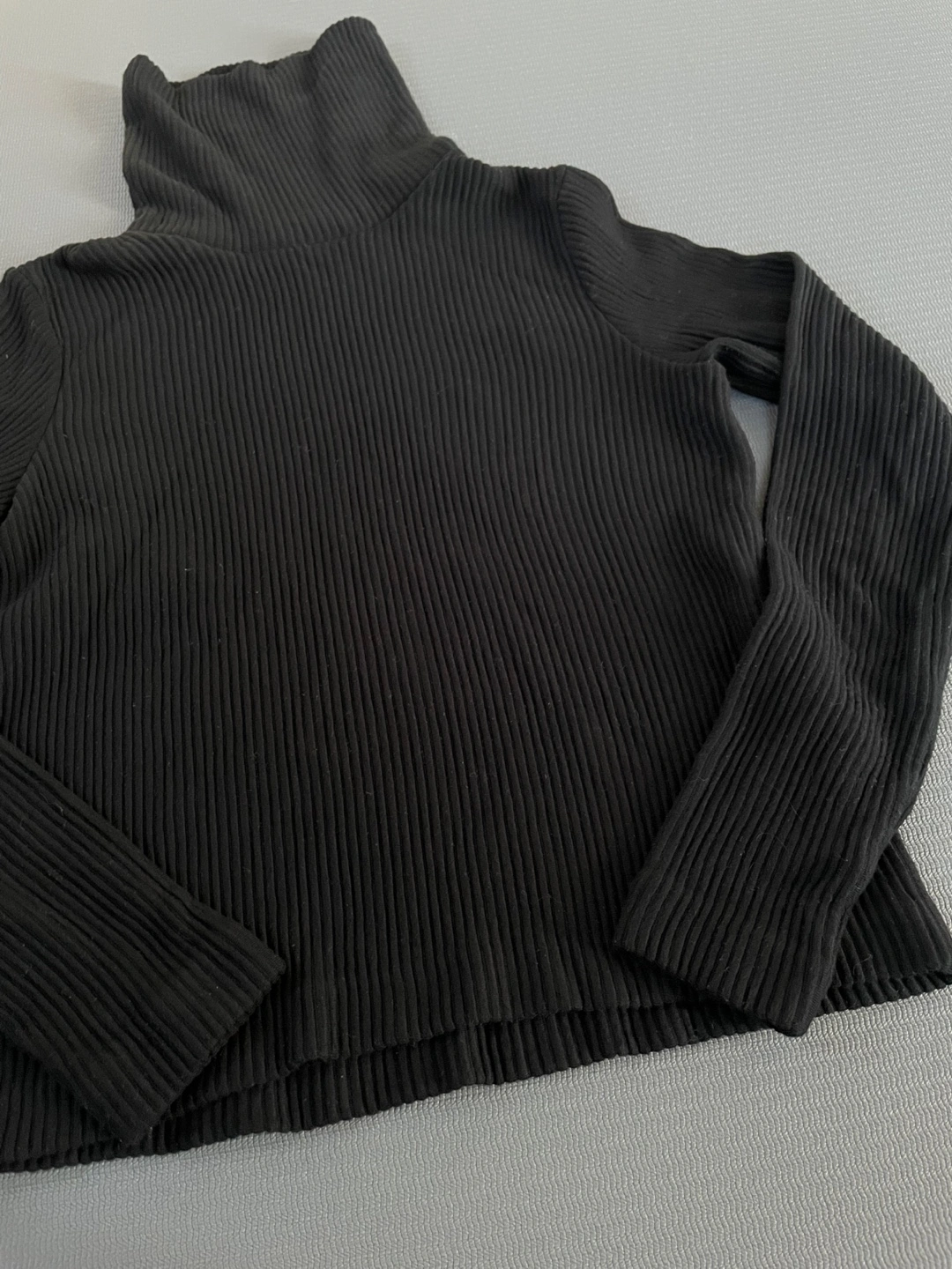 A black ribbed turtleneck top, perfect for layering or wearing on its own! It appears to be in great condition and is a versatile piece for any wardrobe