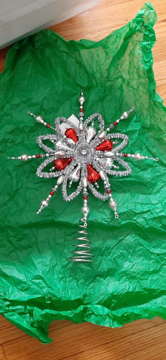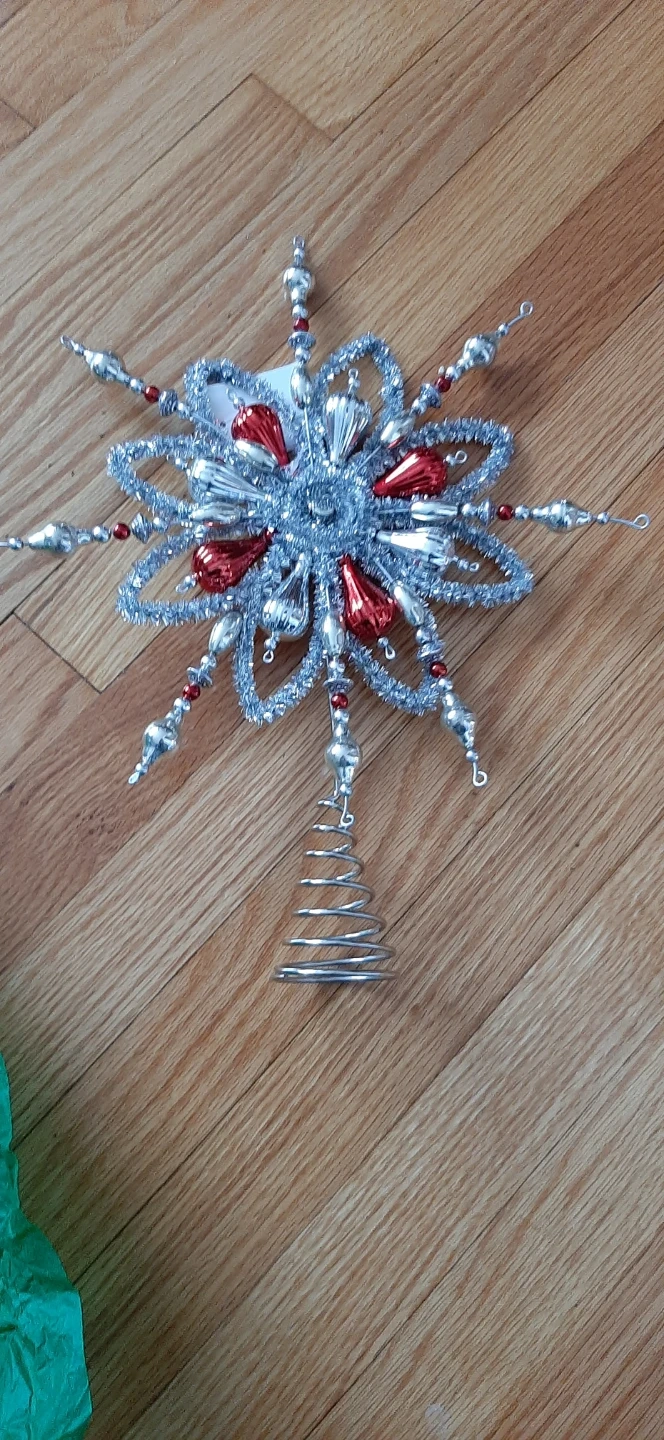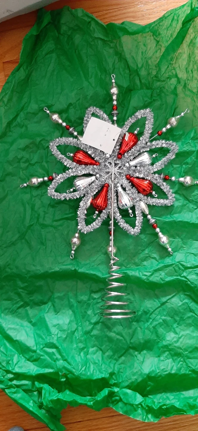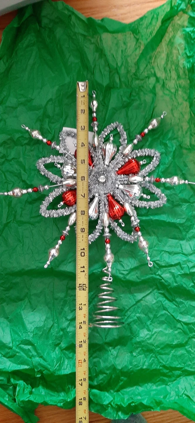 Vintage Christmas Tree Topper - Silver & Red. It features a silver and red design, giving a festive and classic look to your holiday decor. The topper is in great condition and ready to bring joy to your home this season.