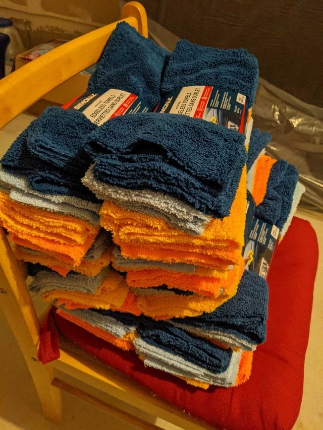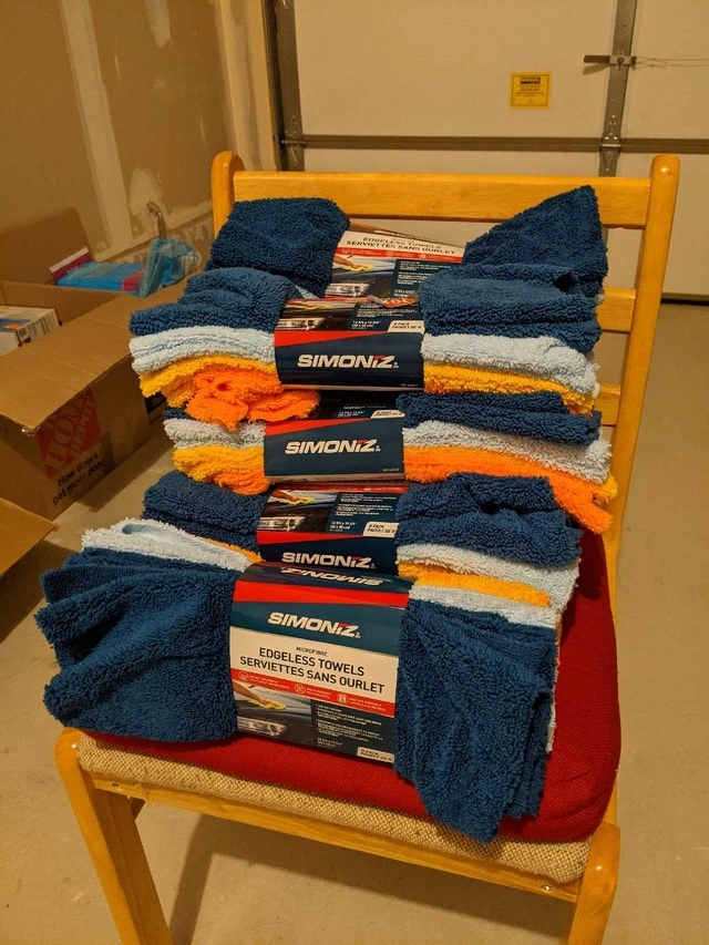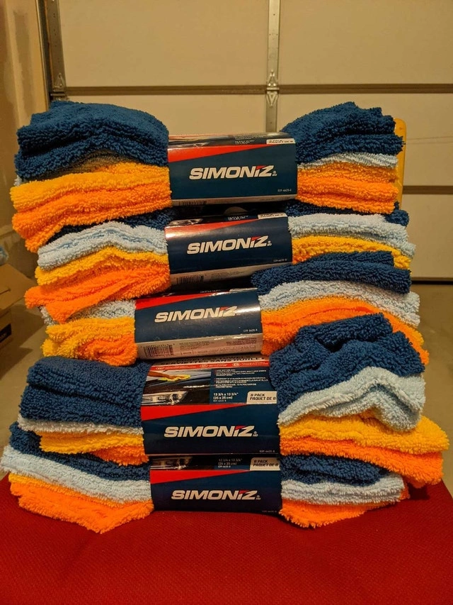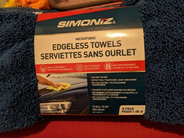 I'm offering Simoniz Microfibre Edgeless Towels, each containing 8 new, highly absorbent cloths ideal for detailing and cleaning vehicles or household surfaces. Each towel is 13 3/4" x 13 3/4" (35 x 35 cm) and made of 87% polyester, 13% polyamide microfibre.