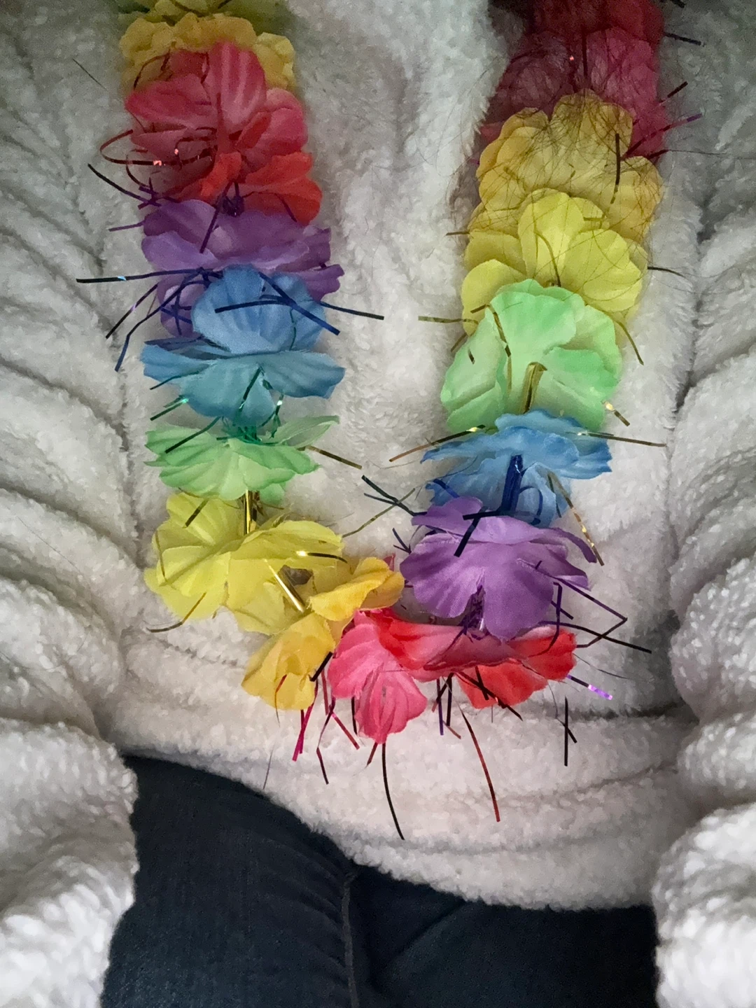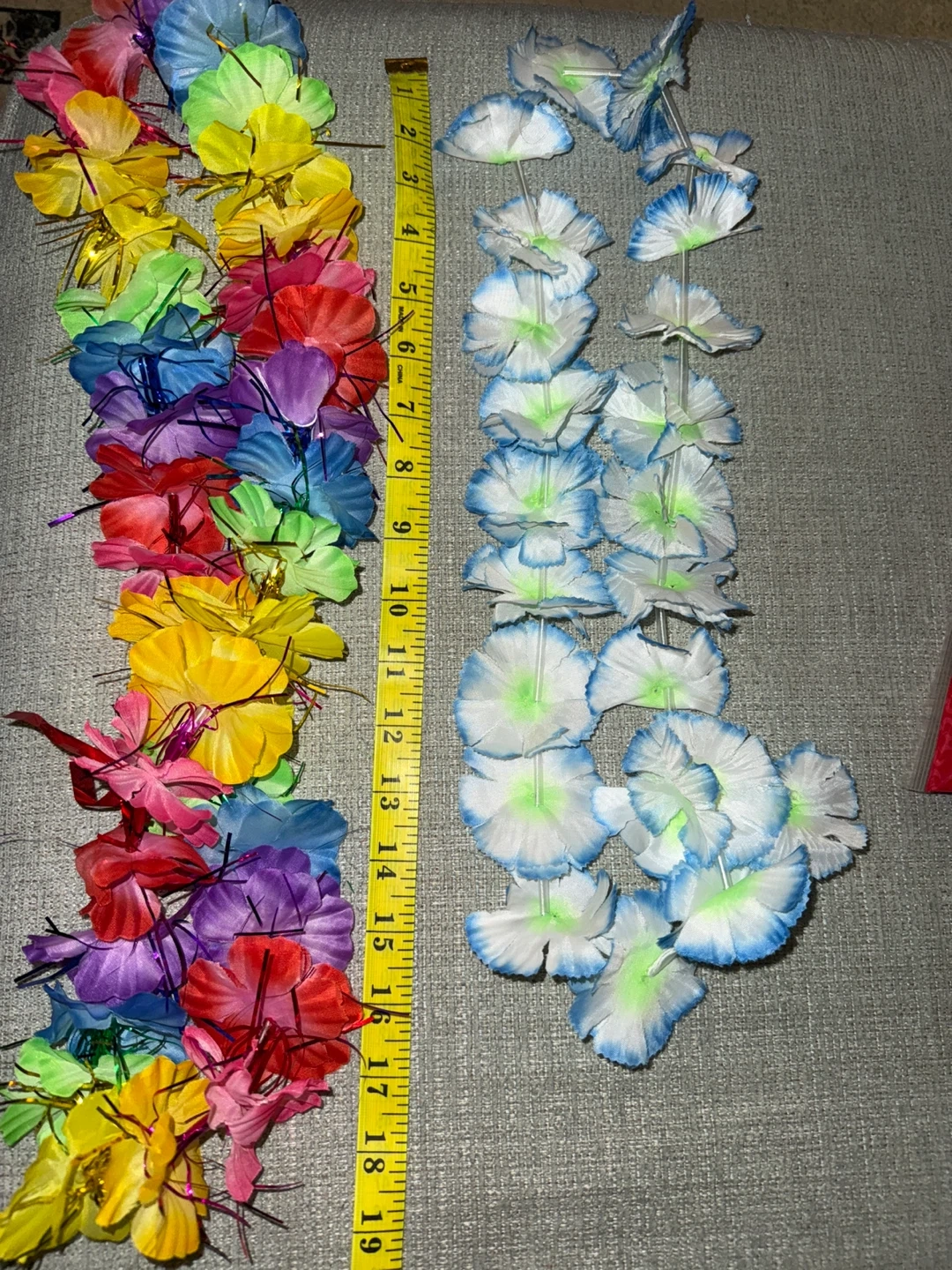 Giving away two flowers leis. One is a vibrant rainbow of colors, and the other is a lovely blue and white. They're both about 18 inches long and perfect for parties, costumes, or just adding a bit of fun to your day. Smoke free home.