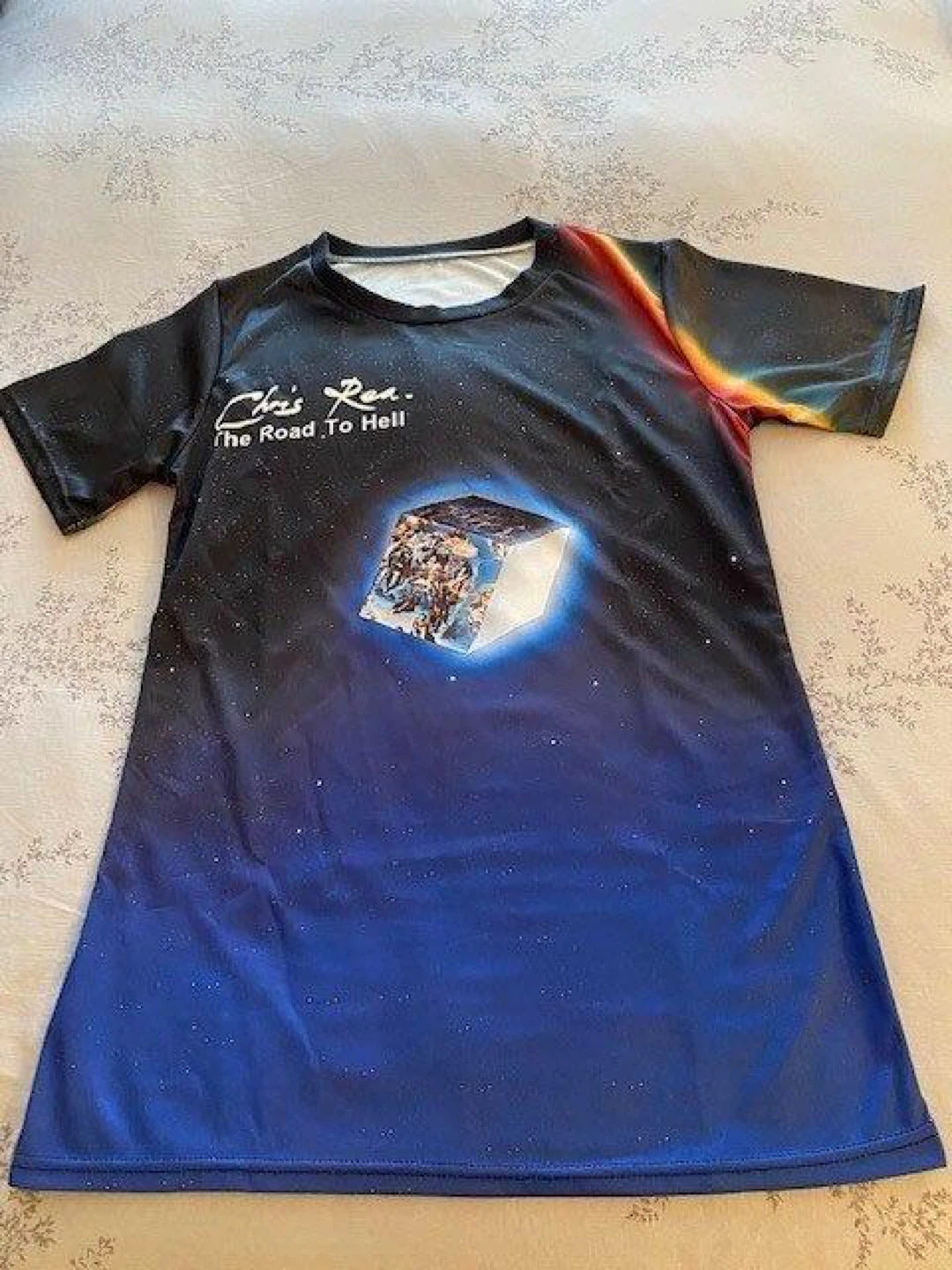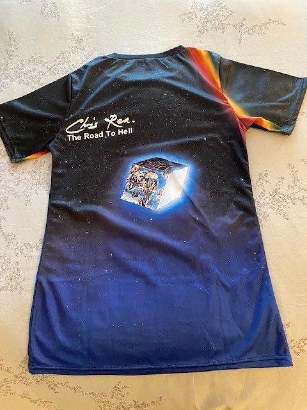 Selling a brand new Chris Rea 'The Road to Hell' graphic t-shirt that is unisex. The design features the album cover art with a cool space background that fades from black to blue.
