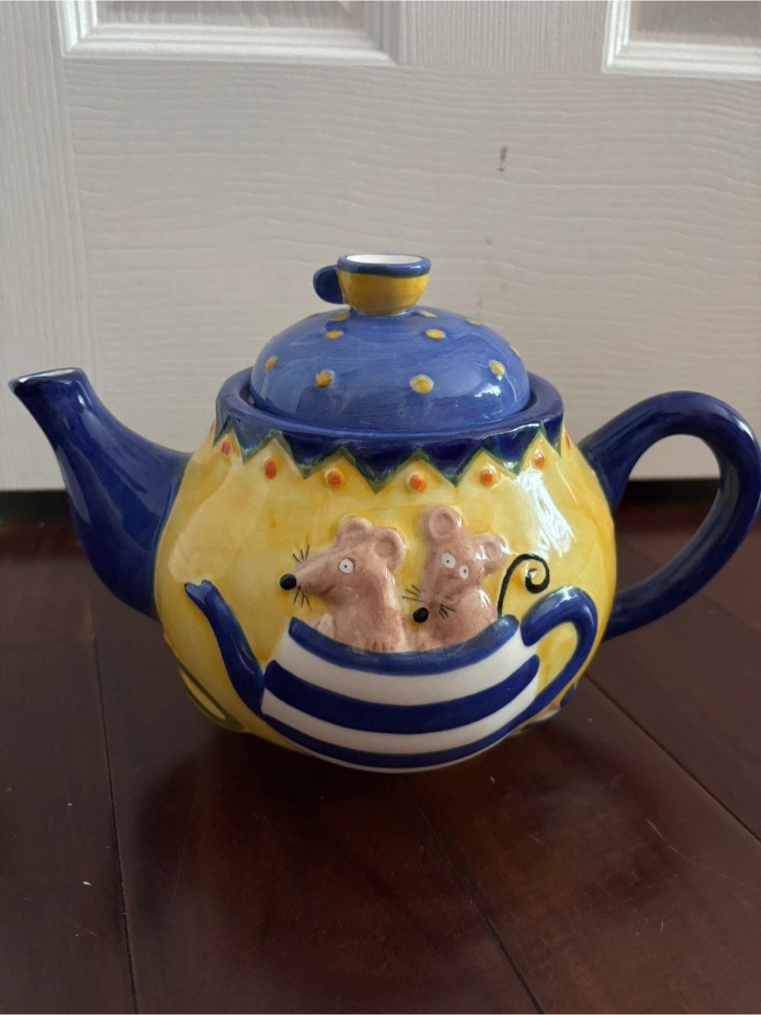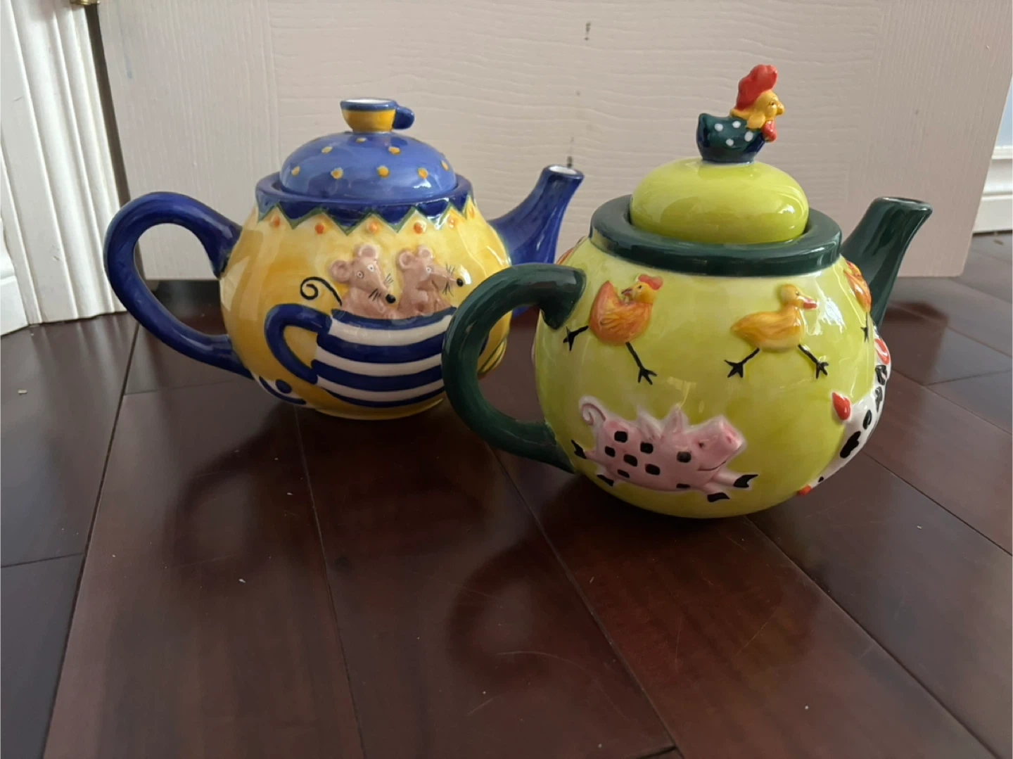 Selling two decorative ceramic teapots. One is yellow and blue with mice, and the other is yellow and green with farm animals. They would make a cute addition to any kitchen or collection!