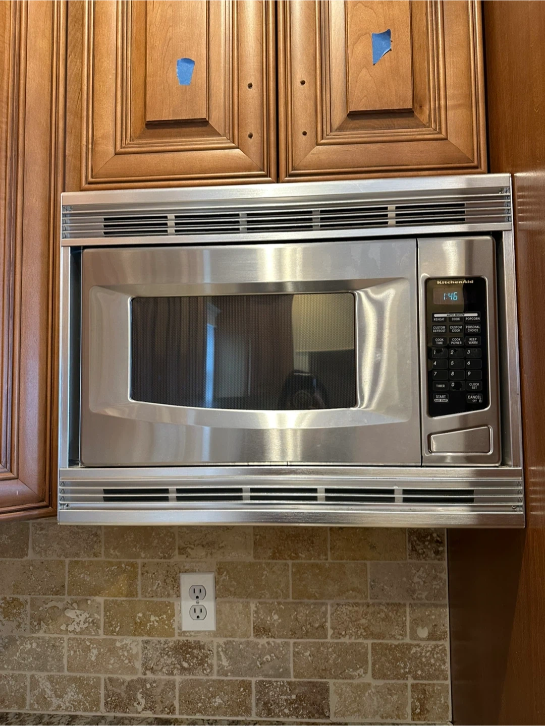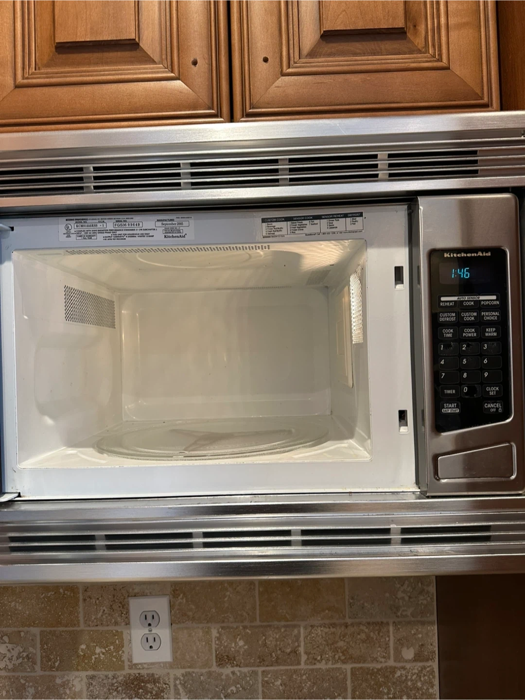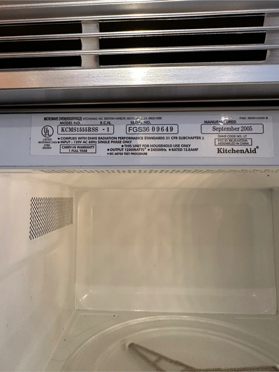 Selling a KitchenAid microwave oven, model number KCMS1555RSS. It's in good condition and ready to use. Manufactured in September 2005.