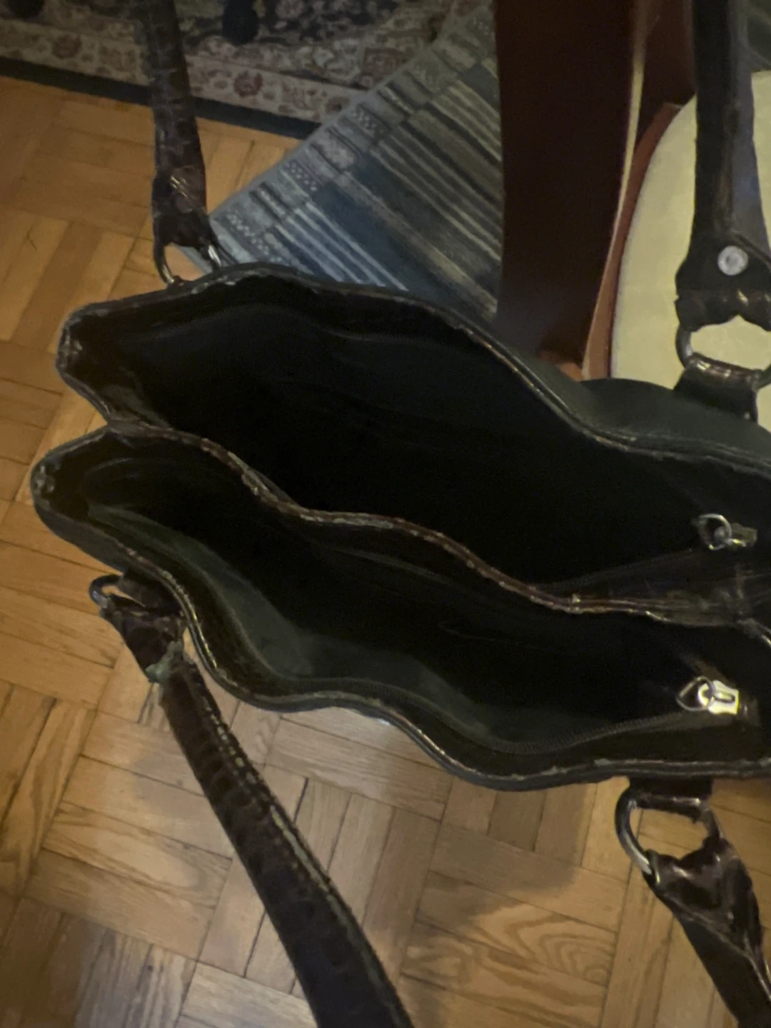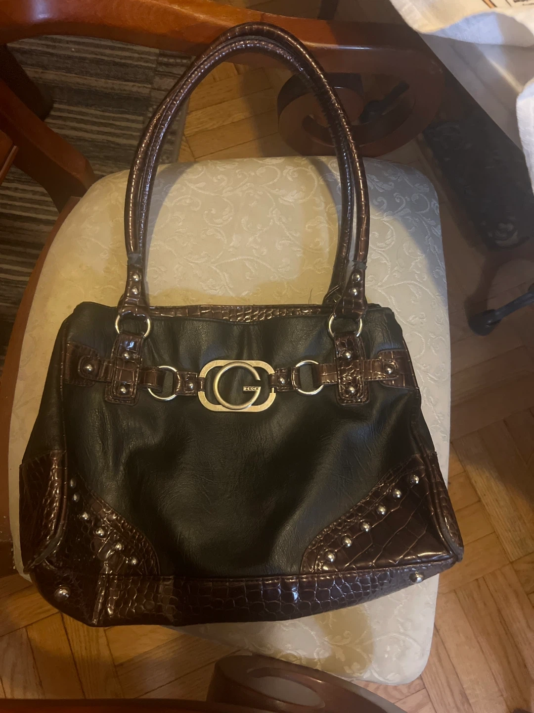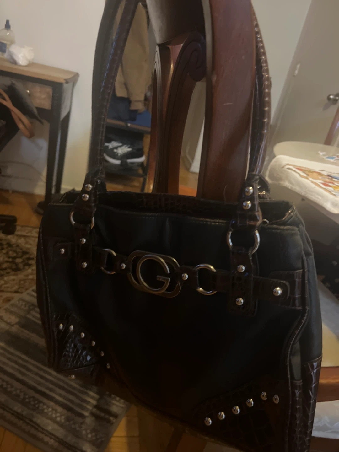 This is a Guess tote bag in black. It features brown faux crocodile trim and silver hardware. It's in good condition and has a lot of space inside for all your essentials!
