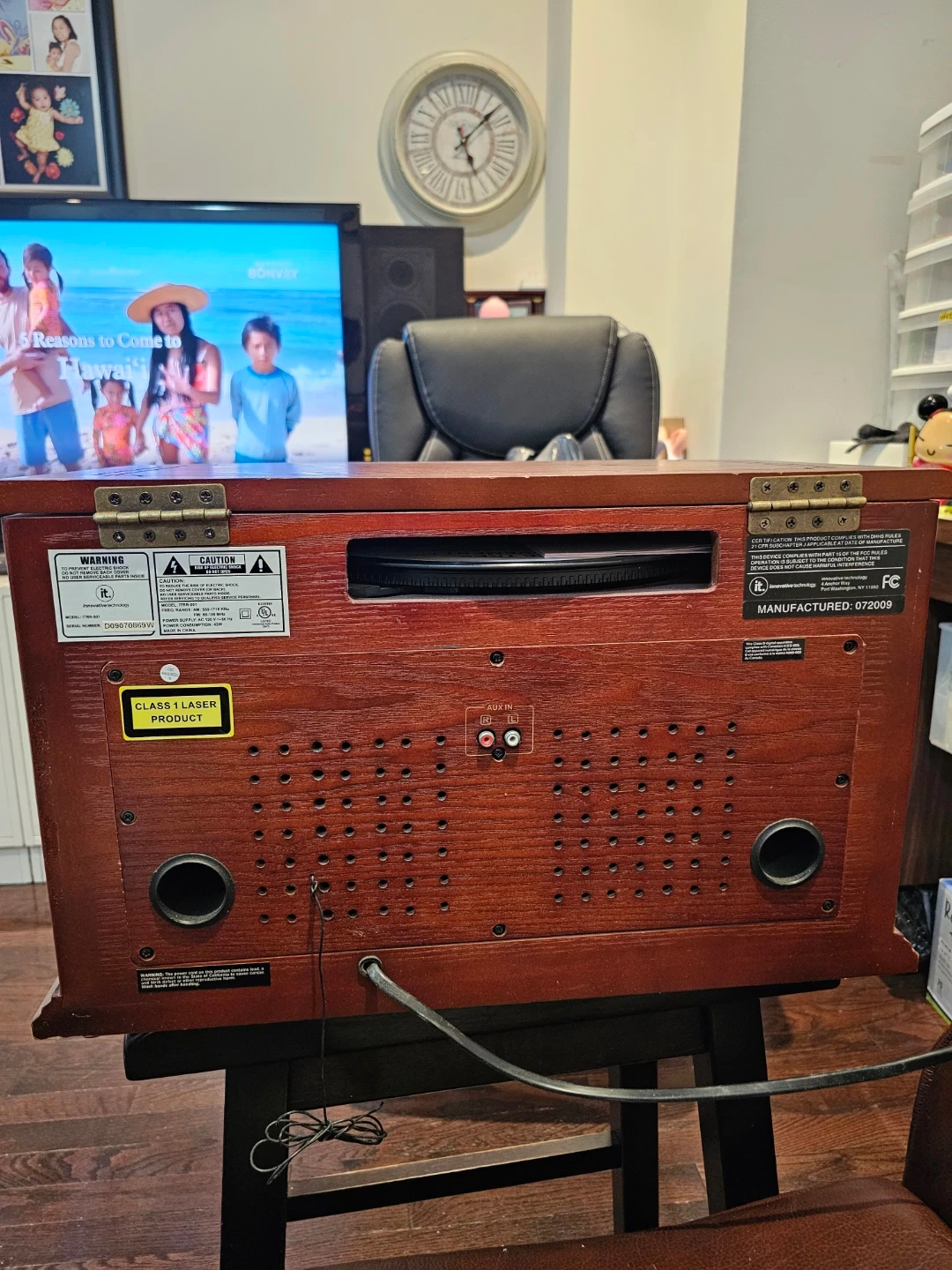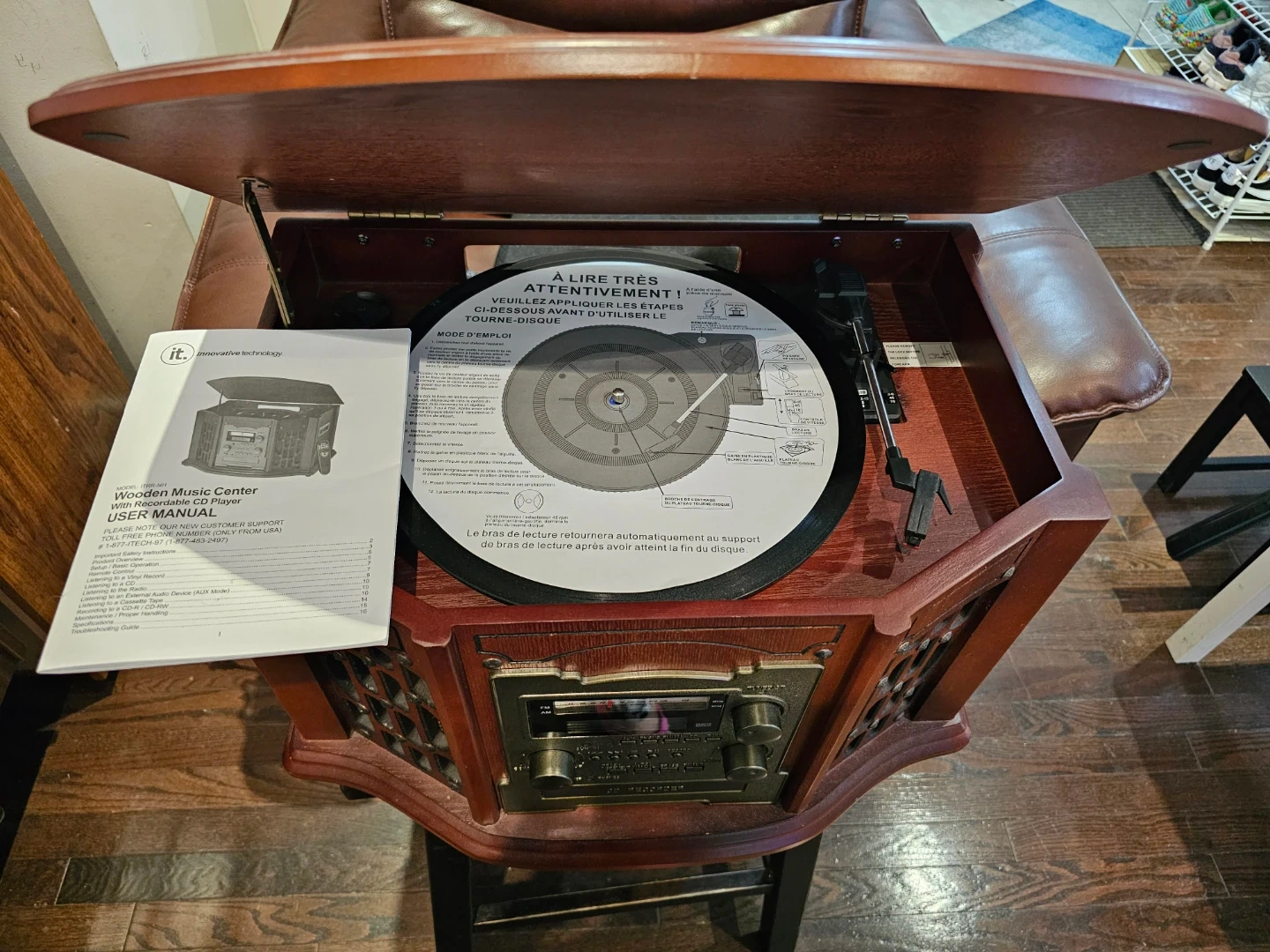 Selling an Innovative Technology Wooden Music Center. It features a record player, CD player, and radio. The user manual is included