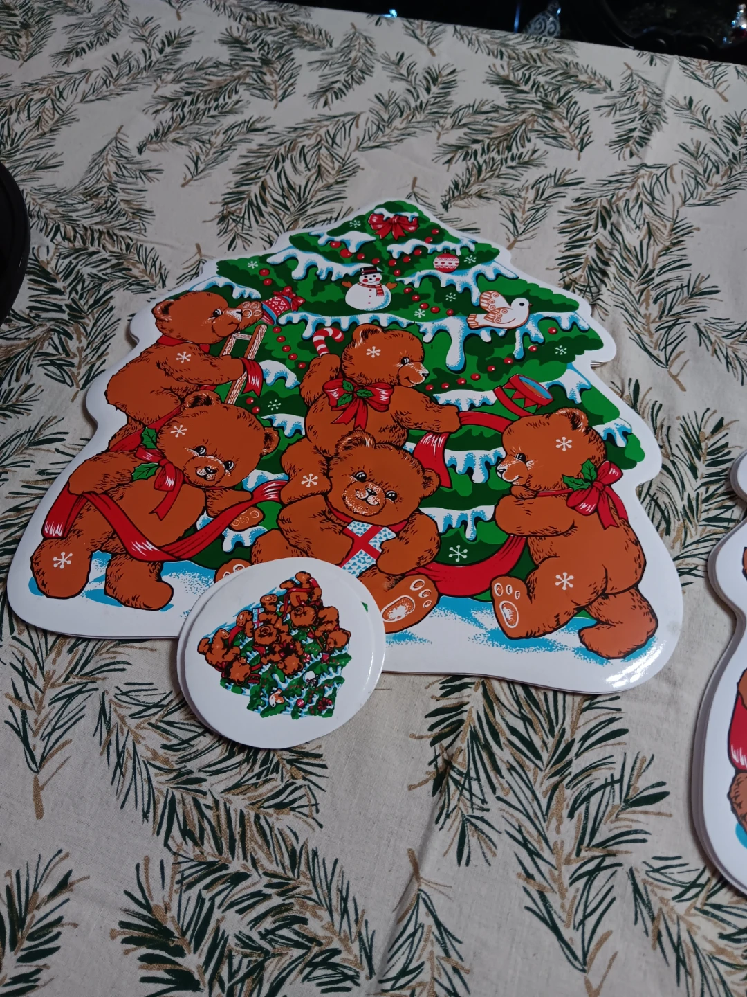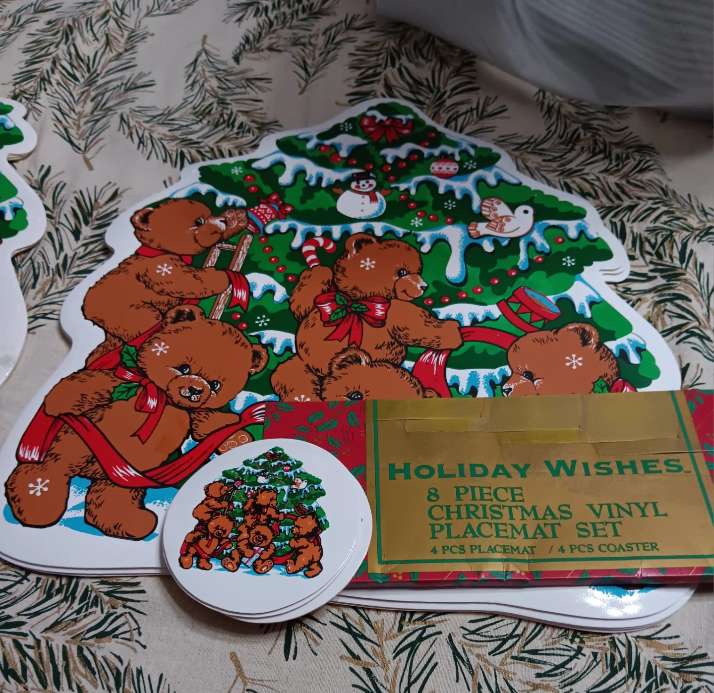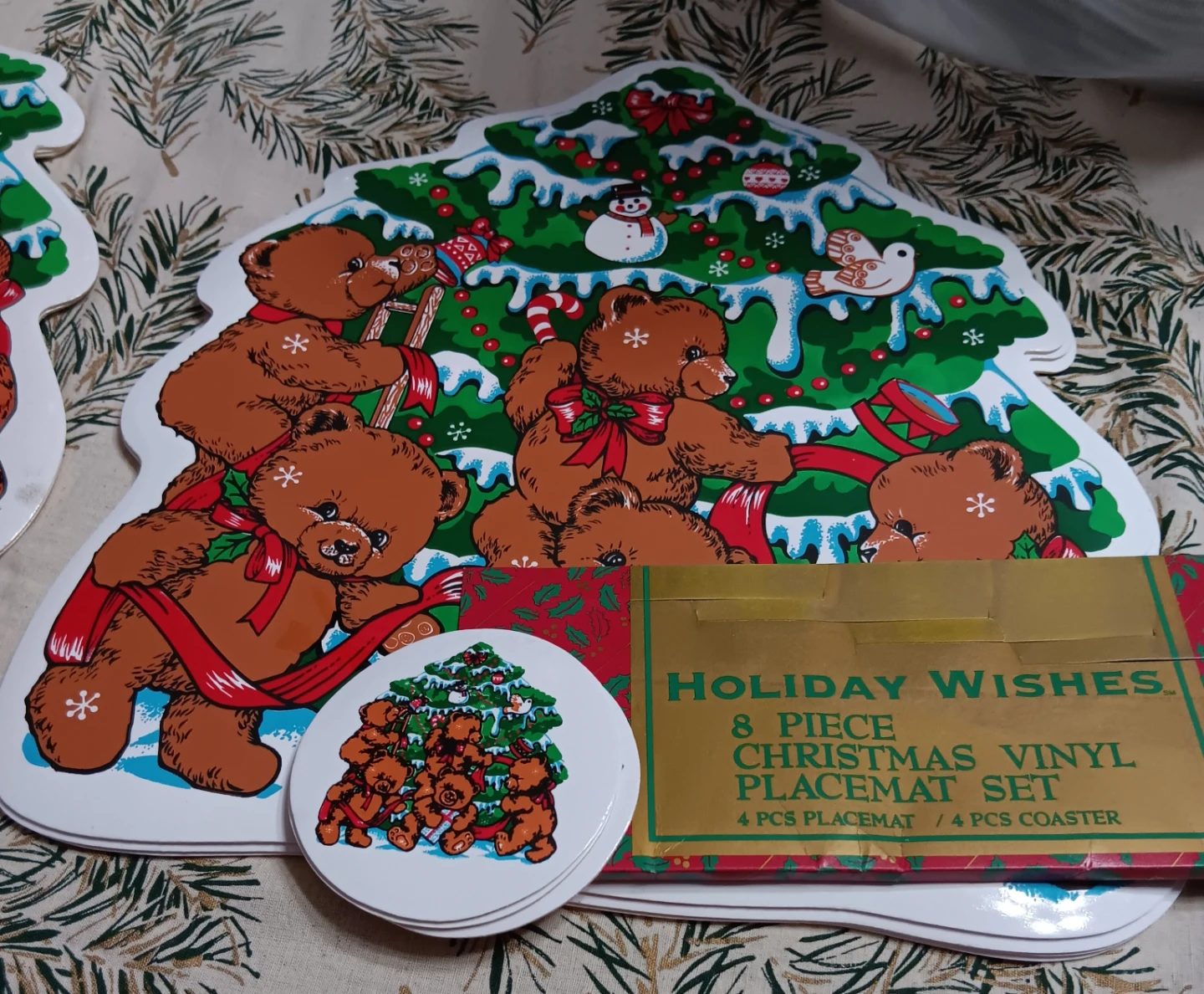 Selling a Holiday Wishes 8-piece Christmas vinyl placemat set. It includes 4 placemats and 4 coasters. The set features a cute bear and Christmas tree design, perfect for adding a festive touch to your holiday table!