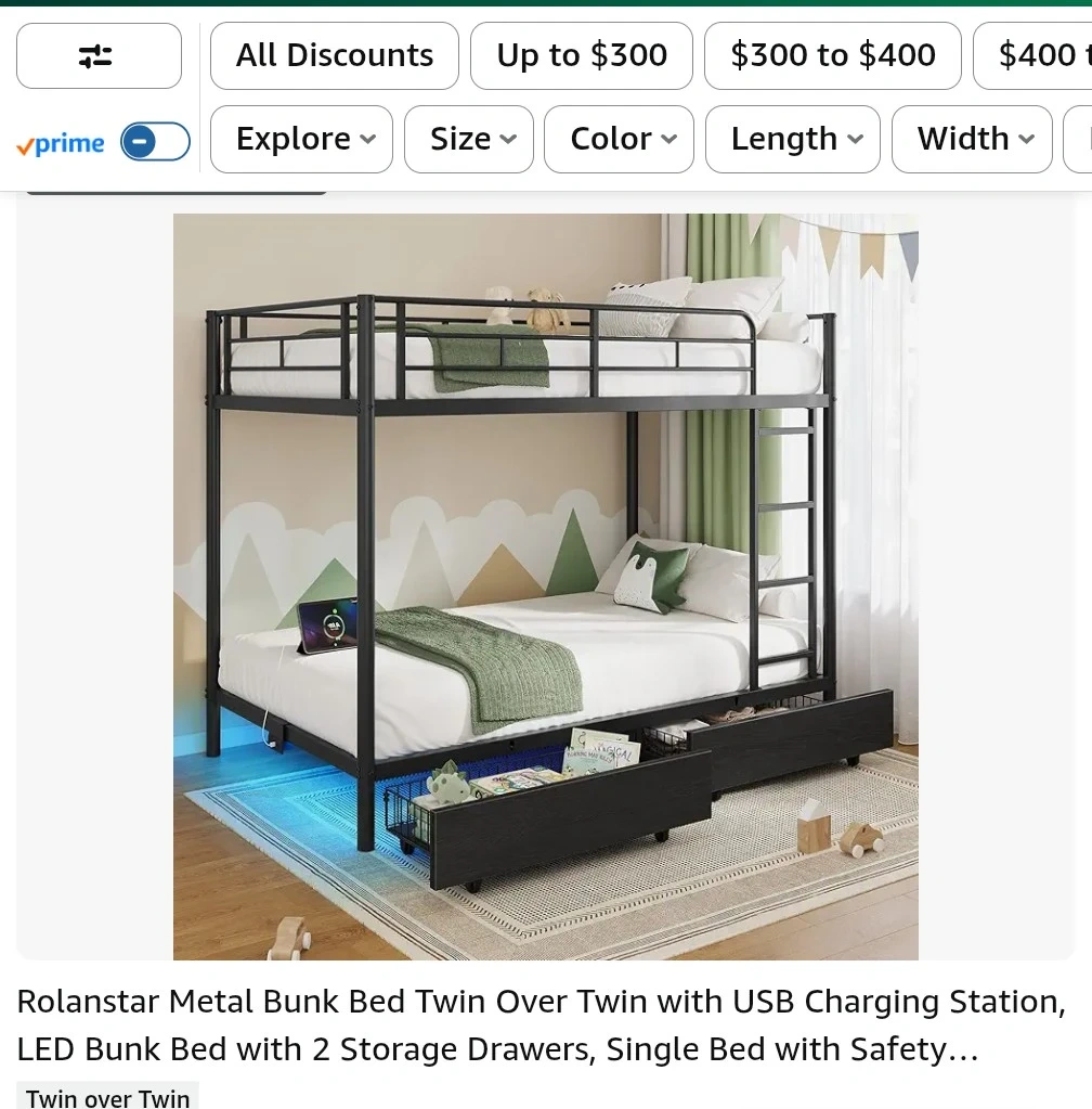 Selling a Rolanstar metal bunk bed, twin over twin size. It comes with a USB charging stationa with 2 storage drawers. This is a single bed with safety features!