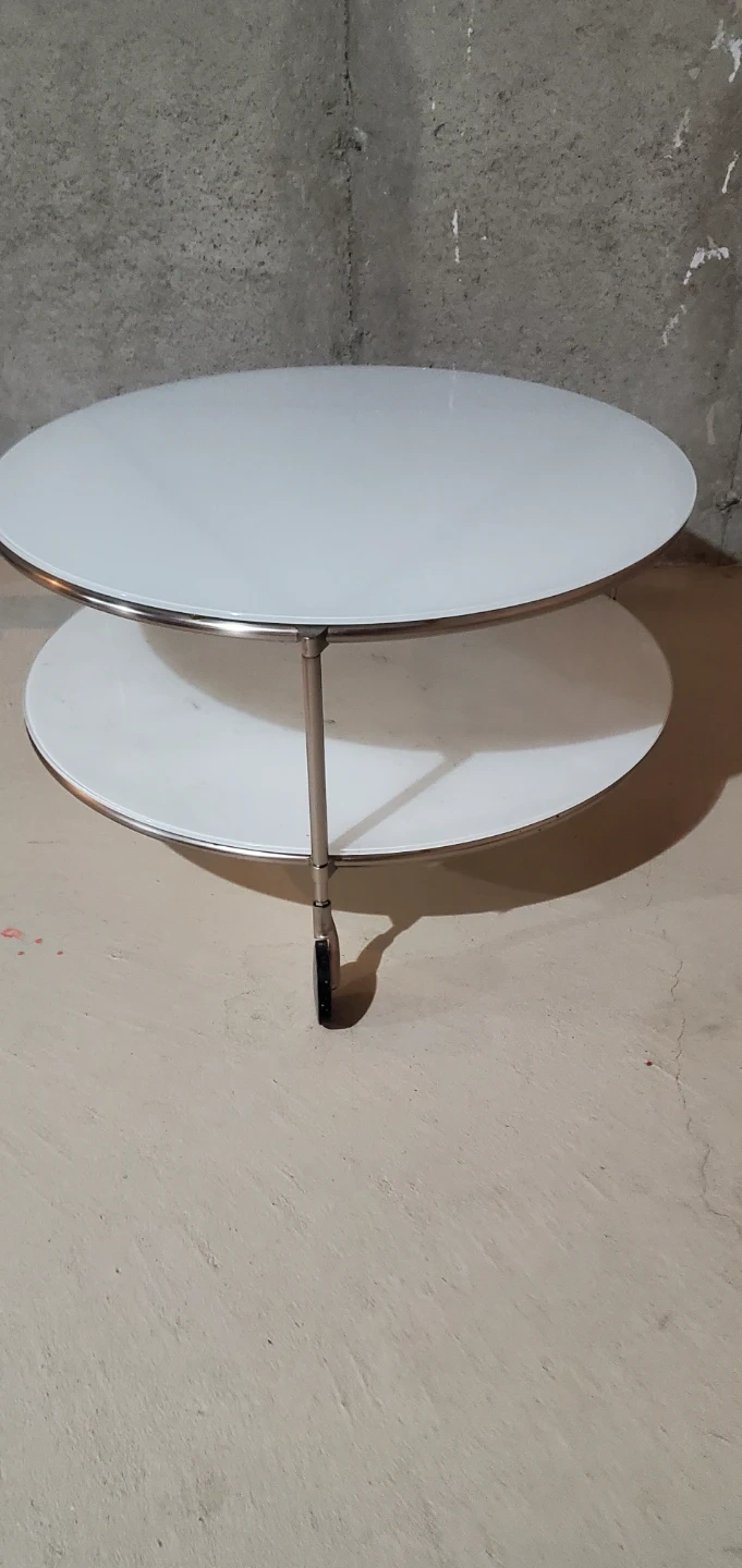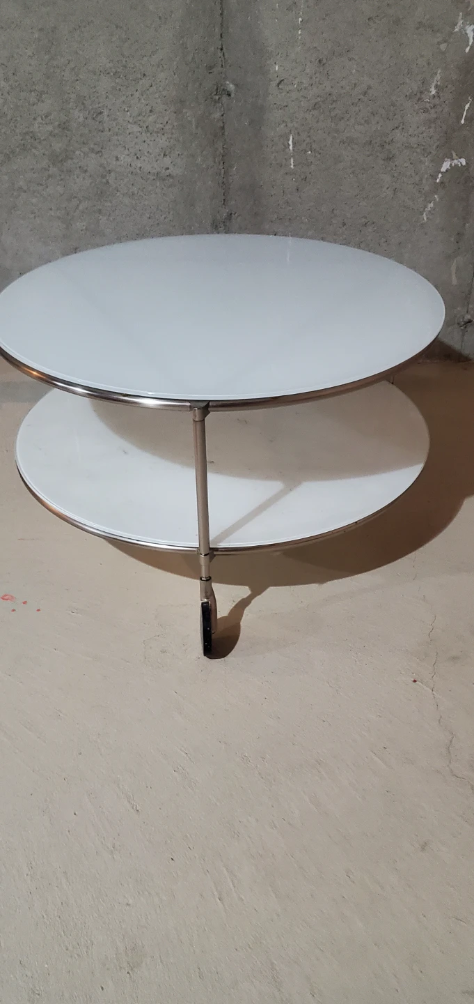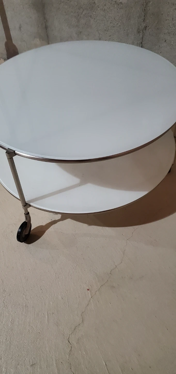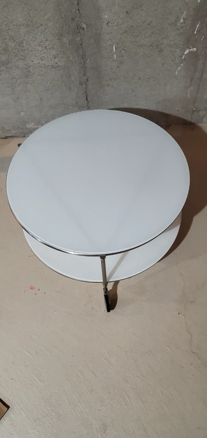 Selling a simple white round side table! It has three tiers and convenient wheels for easy moving, two shelves. Great for small spaces or as an accent piece