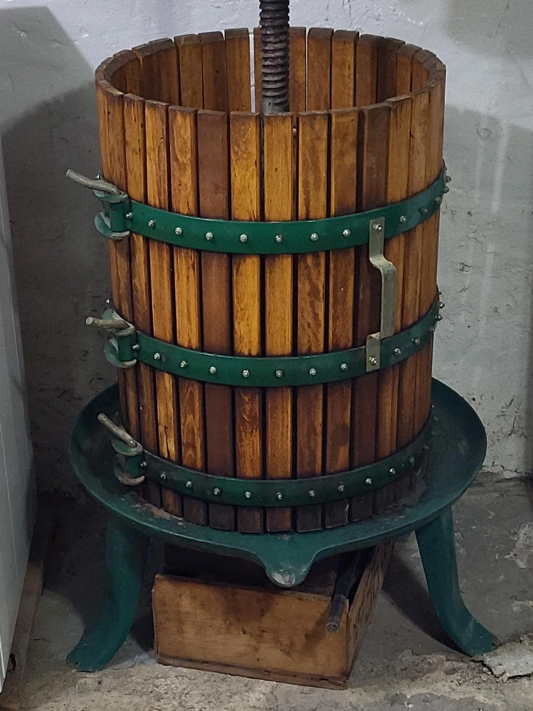 Selling a vintage fruit or wine press. It features a wooden barrel design with metal bands. The press is mounted on a green metal stand. It's a unique piece for making your own wine or cider!