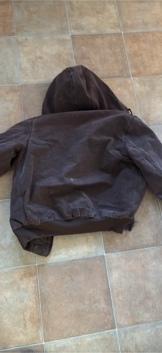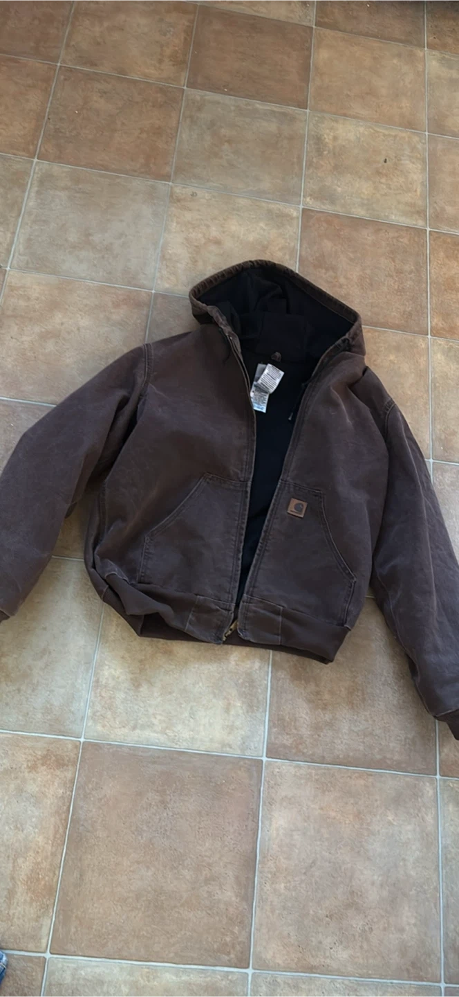 Selling a Carhartt hooded jacket in brown. It's in great condition and ready for the cooler weather. The jacket has a hood and a Carhartt logo on the pocket. It's a sturdy and reliable jacket, perfect for outdoor activities or everyday wear
