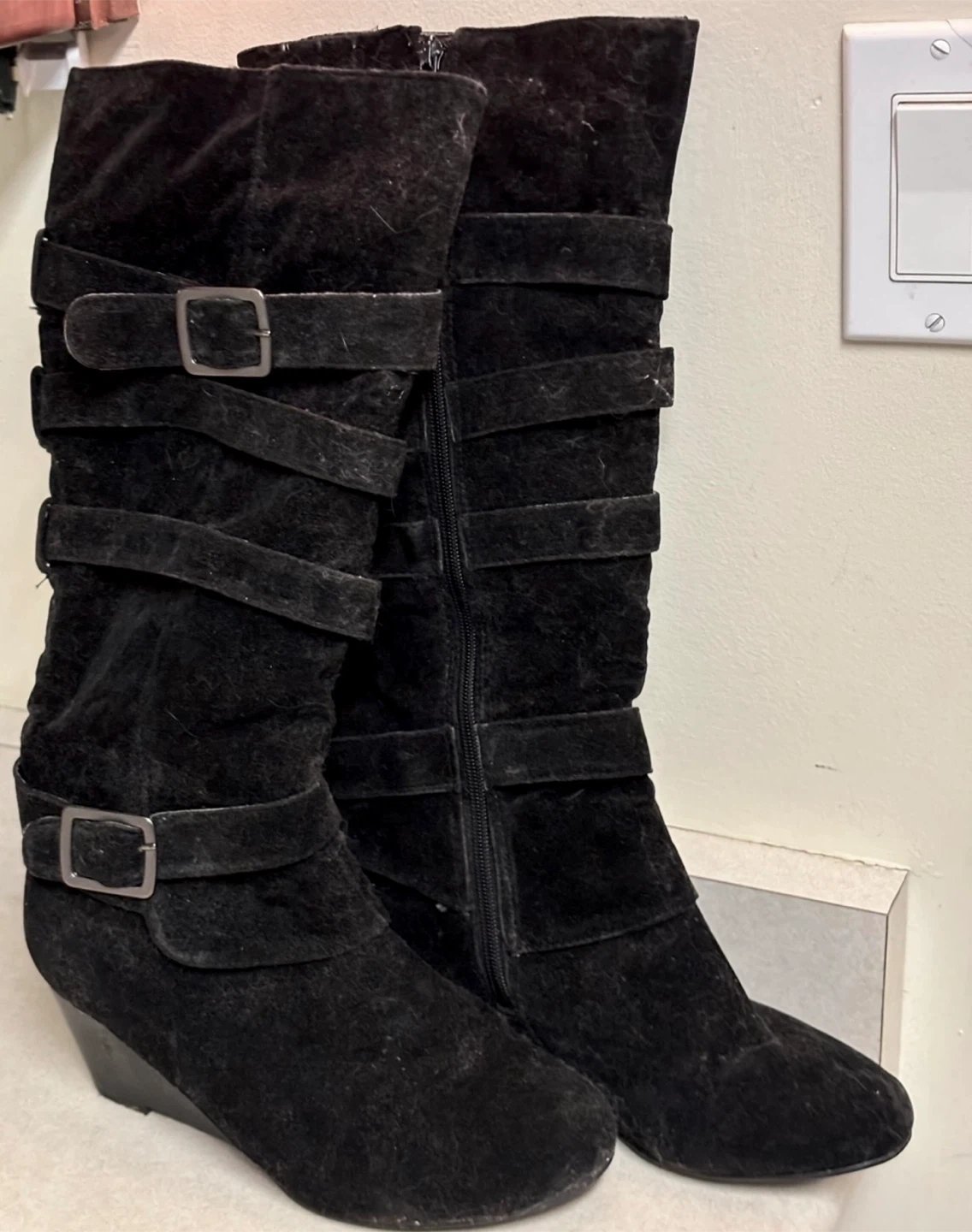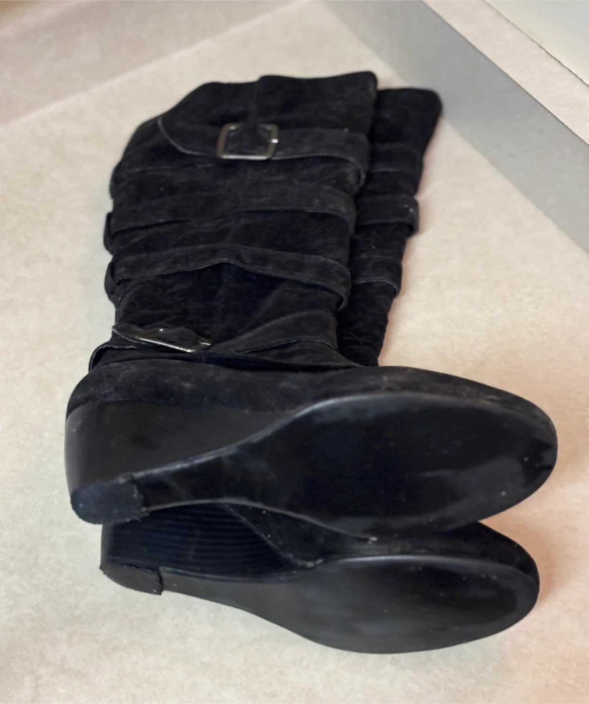 Knee high zippered boots w/buckles. Excellent condition, no scuffs. Scotch guarded. Size says 9 but fits like a 6.5