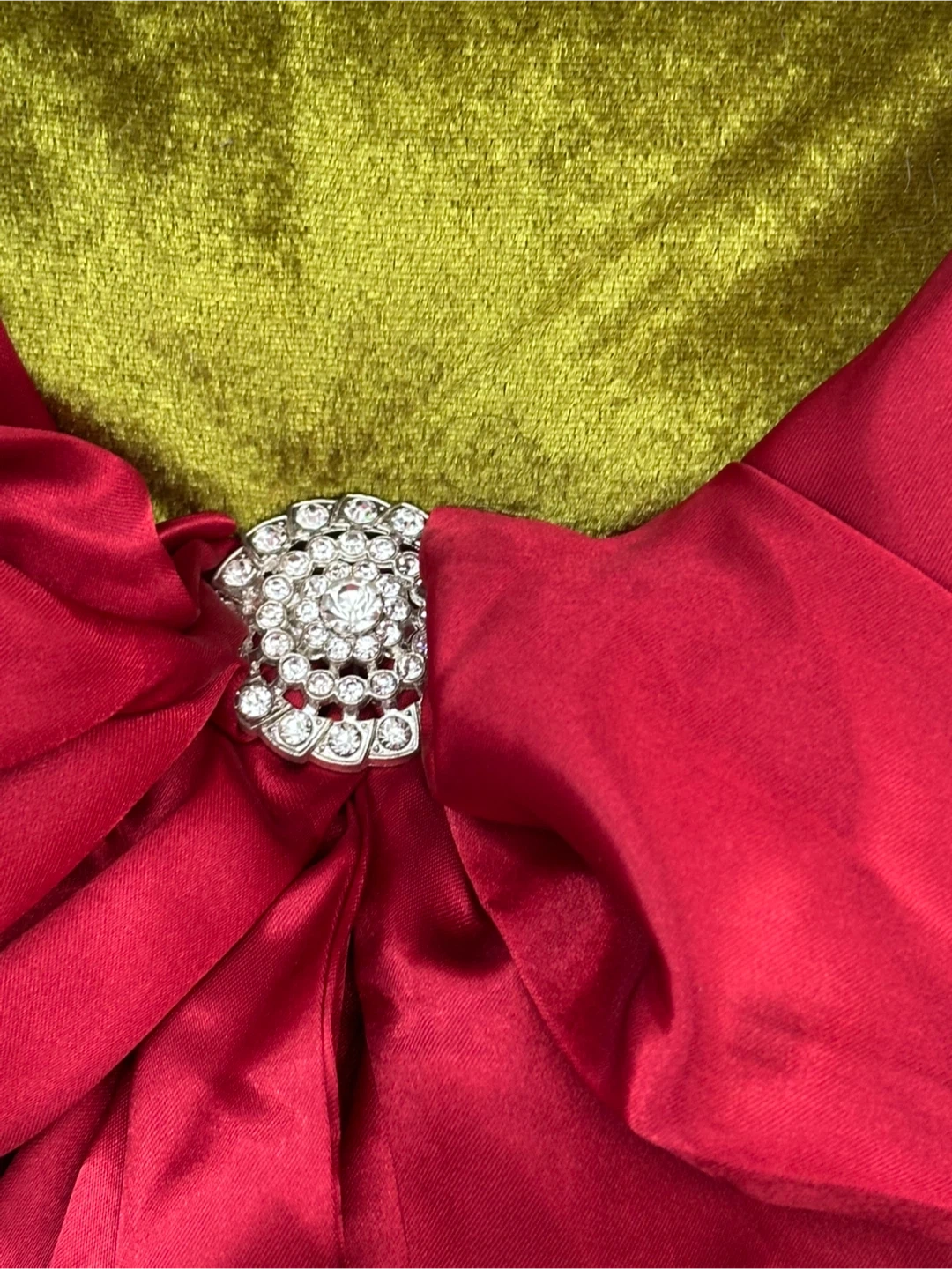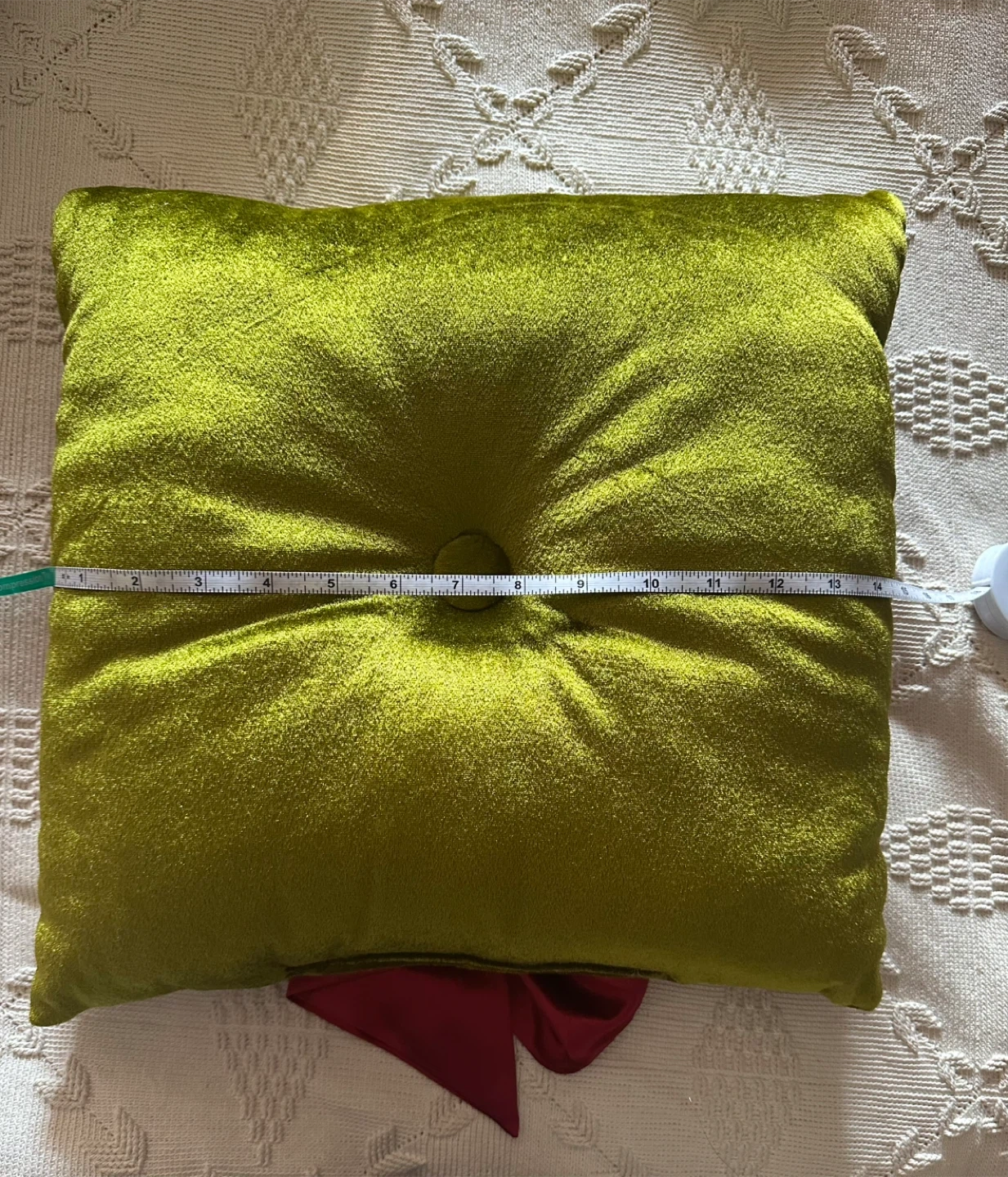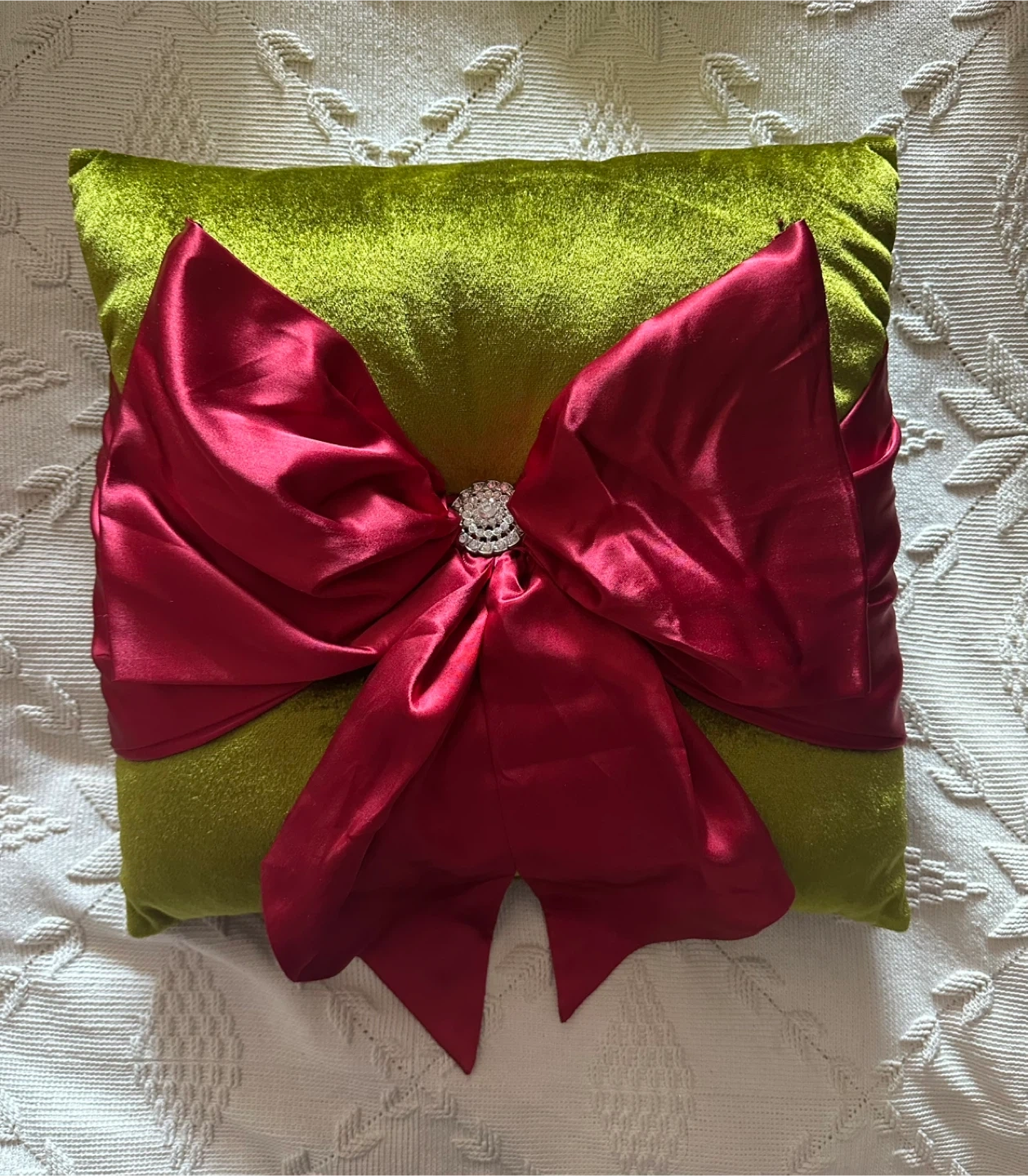 Selling a decorative green velour throw pillow with a large red satin bow. It has a jeweled embellishment at the center of the bow. The pillow measures approximately 14 inches across.