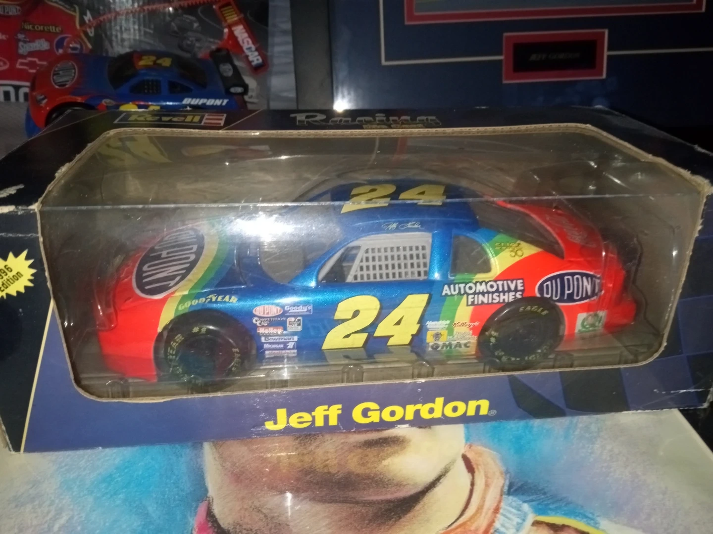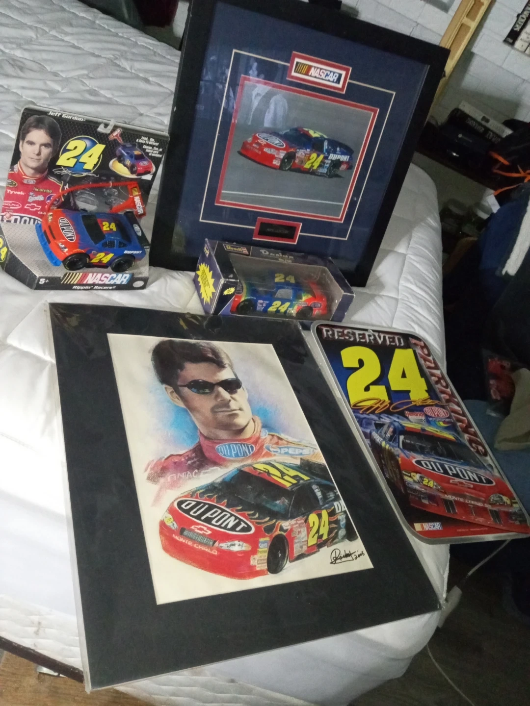 Selling a collection of Jeff Gordon #24 NASCAR memorabilia! Includes a framed print, a die-cast car in its original packaging,metal lunch box, a reserved parking sign, and other collectibles. Great for any NASCAR or Jeff Gordon fan! Happy to hear your offers or questions.
