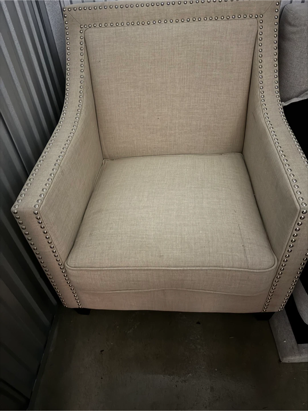 Selling a lovely beige accent chair! It's in great condition and would look great in any living room or bedroom. It features a classic design with nailhead trim, adding a touch of elegance to your space. Seating areas size is 23x23 deep. Very comfortable