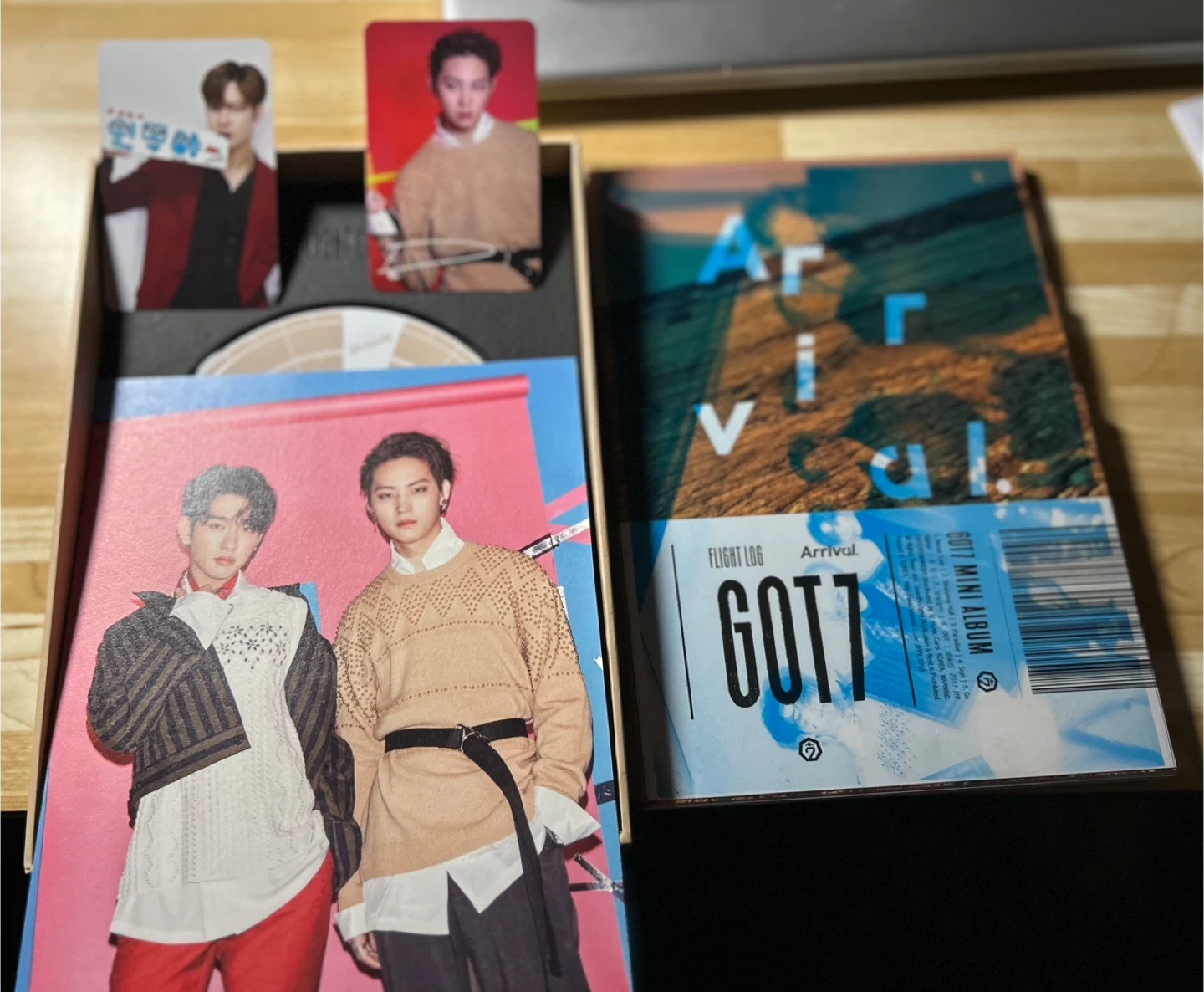 Selling a GOT7 Flight Log: Arrival album! It comes with the photobook, CD, and some photocards as pictured. The album is in great used condition and ready for a new owner!
